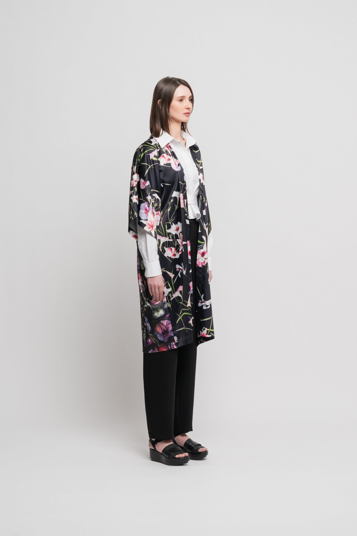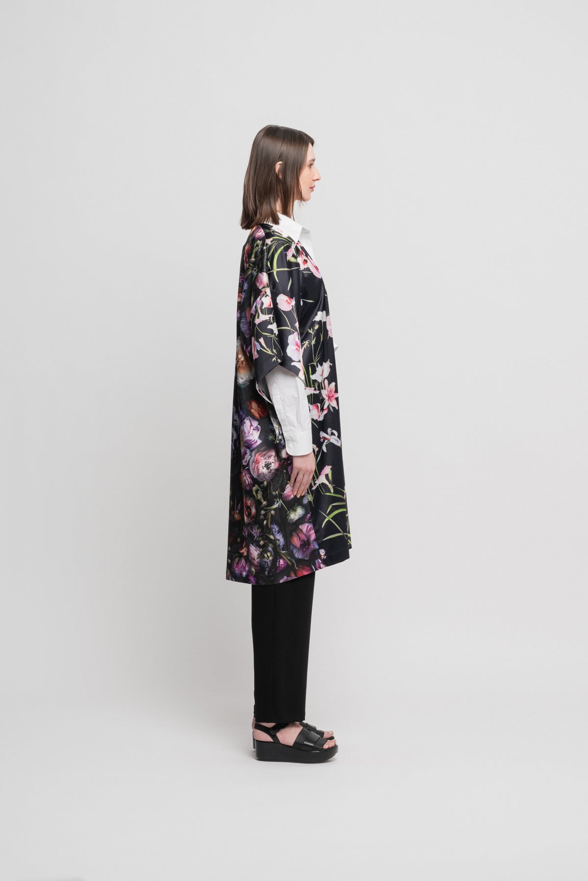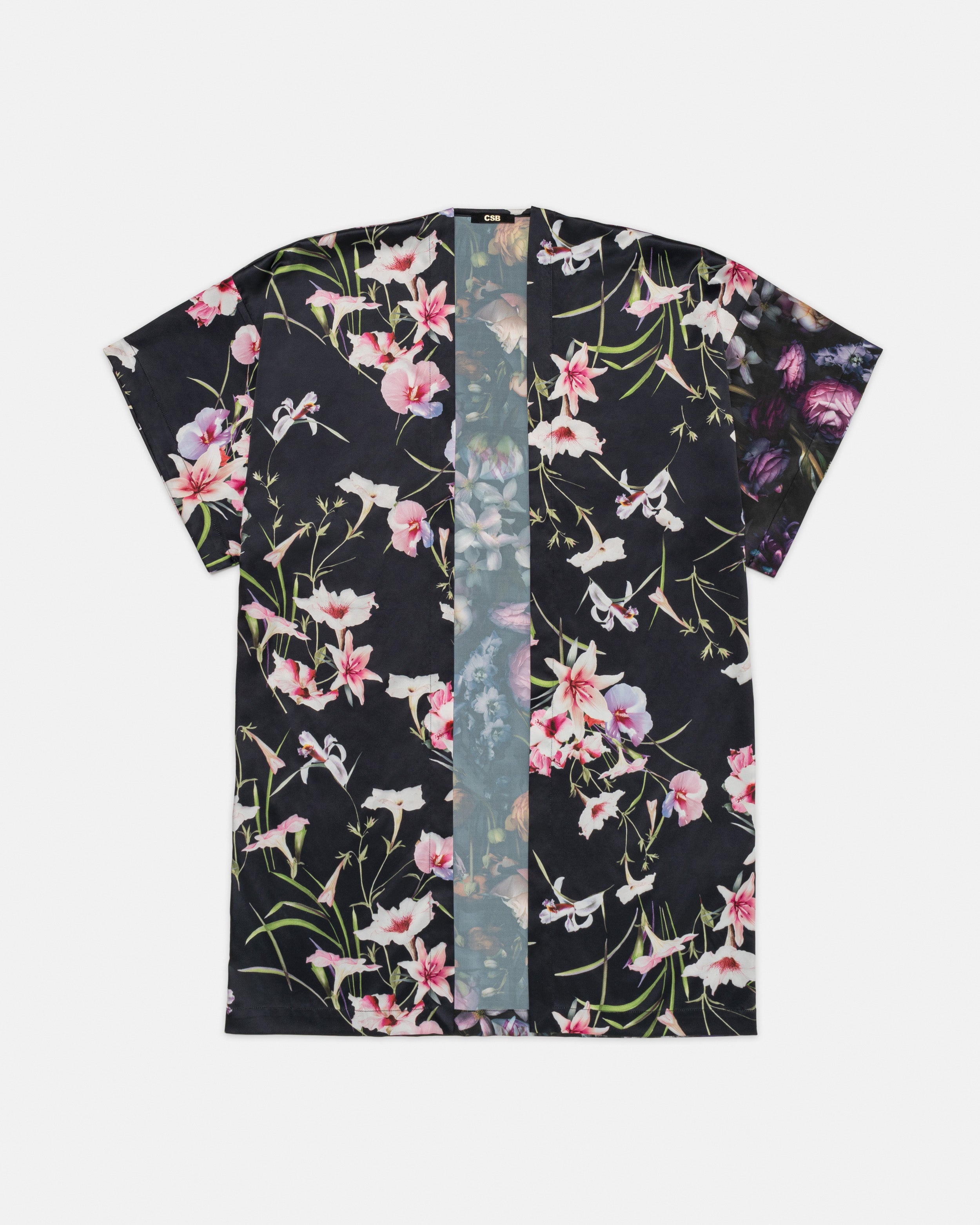 A lightweight, knee-length kimono, with dropped shoulders and wide short sleeves.  The edgy kimono has two different floral prints on the front and back.