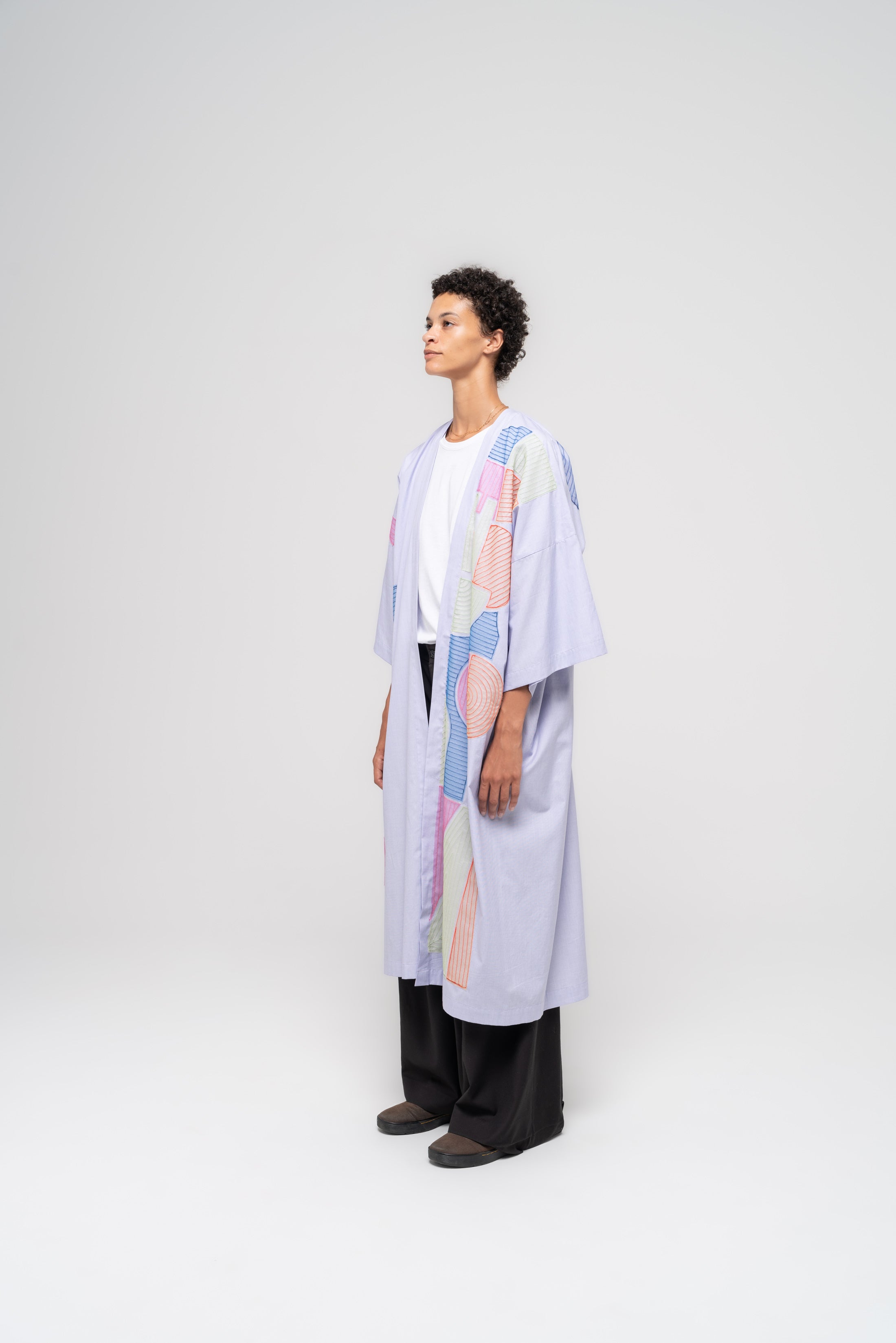 Joe Al Daccache was inspired by a donated material work sample featuring organza fabric overlayed with geometrically cut tulle in pop colors, enhanced with linear topstitching. He applied this existing sample to the front of a simple, lightweight open-style caftan in lavender cotton. Following the same artistic technique, he replicated the design on the back of the caftan, creating a cohesive and visually striking garment.