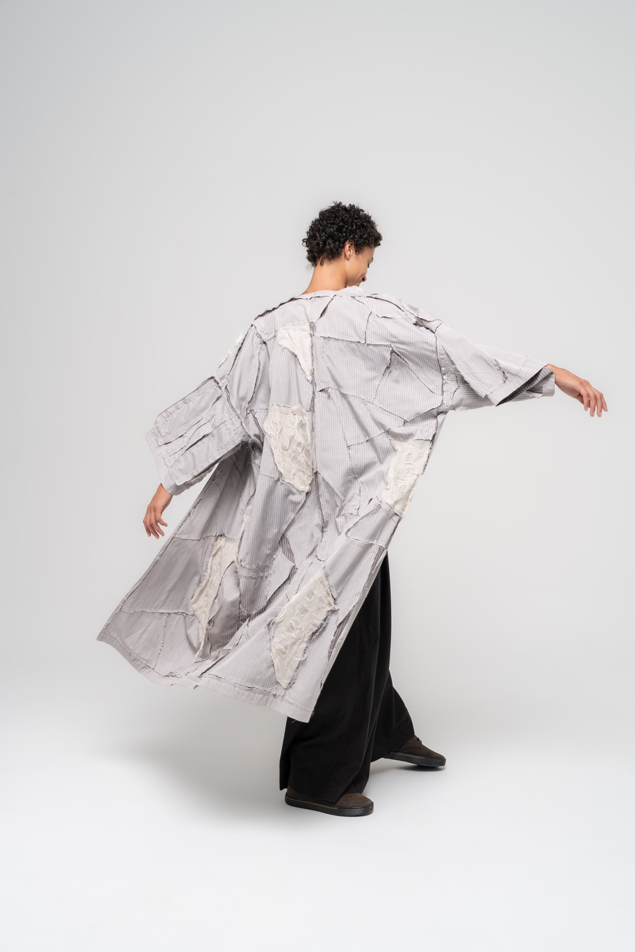 Karim Karam enhanced the design of a reversible open-style cotton caftan, featuring one side in light grey pinstripes and the other in dark grey. He brought depth to the garment by topstitching random geometric shapes onto the kimono, then carefully cutting between the seams to expose the layer beneath. To further augment the texture and add intricacy, he added patches of distressed gauze to some of the geometric shapes, creating a sophisticated interplay of materials and colors.