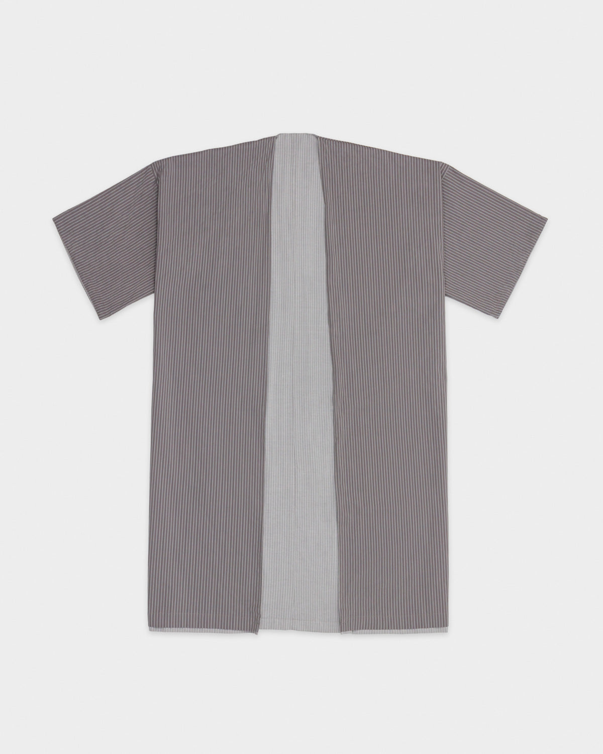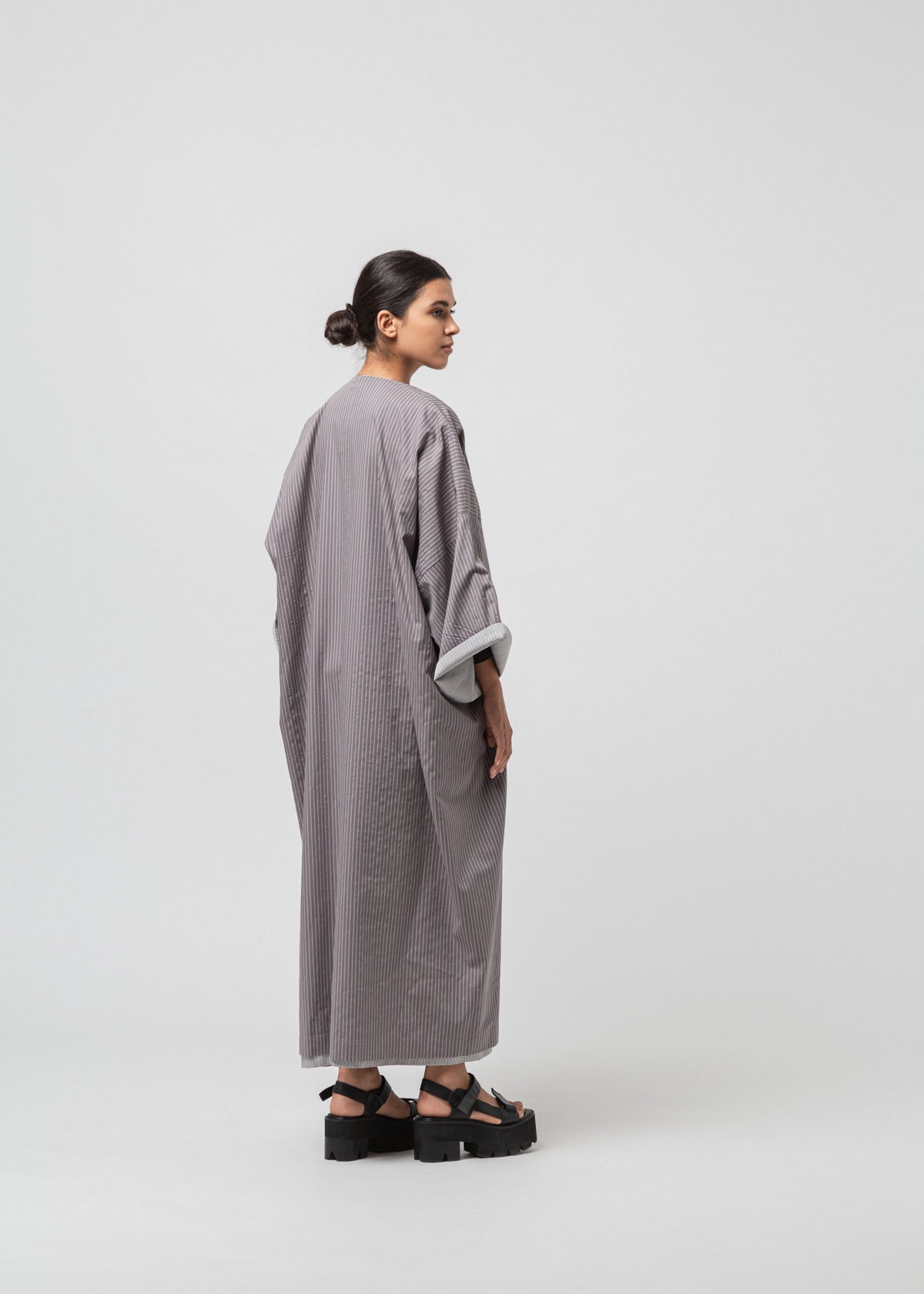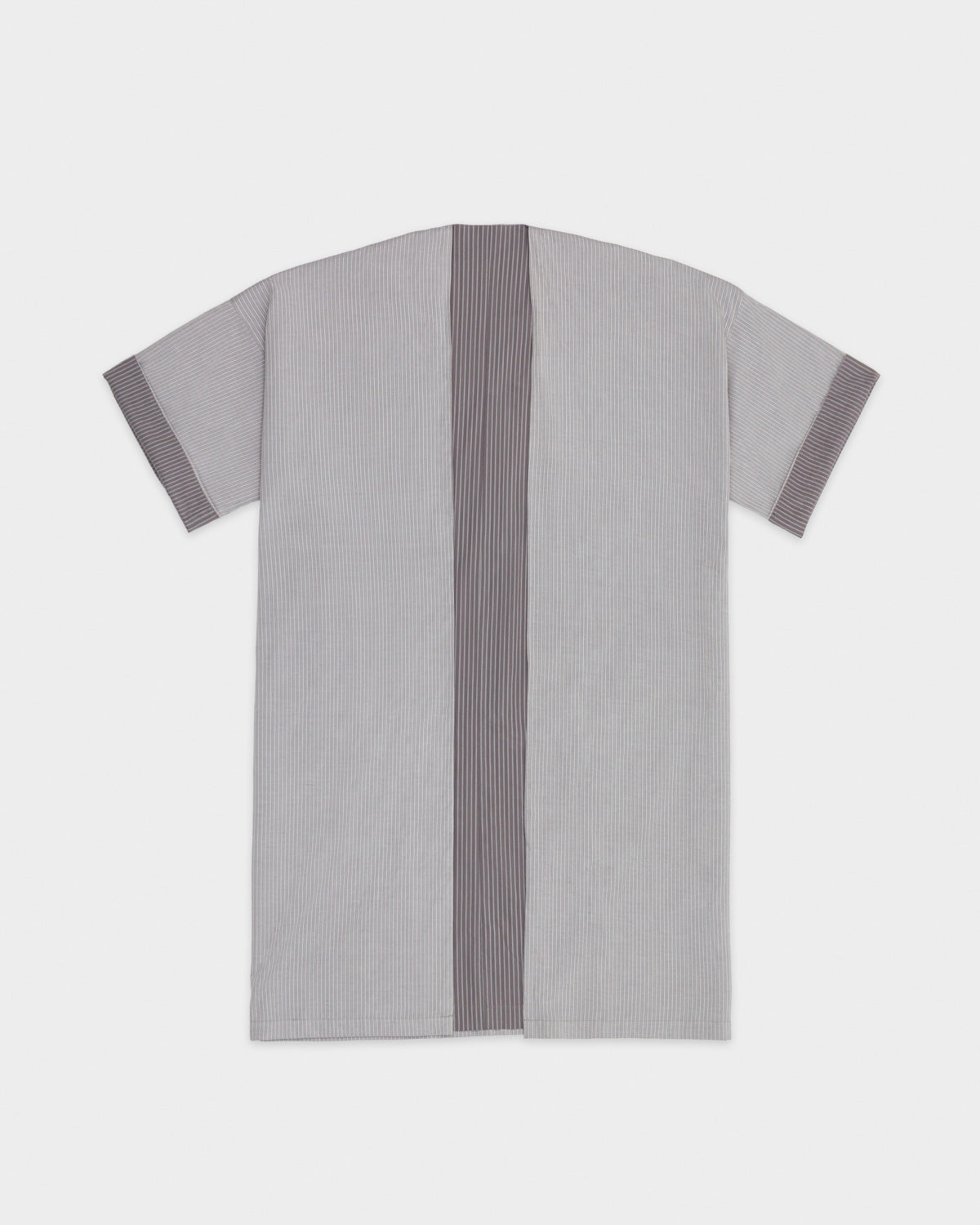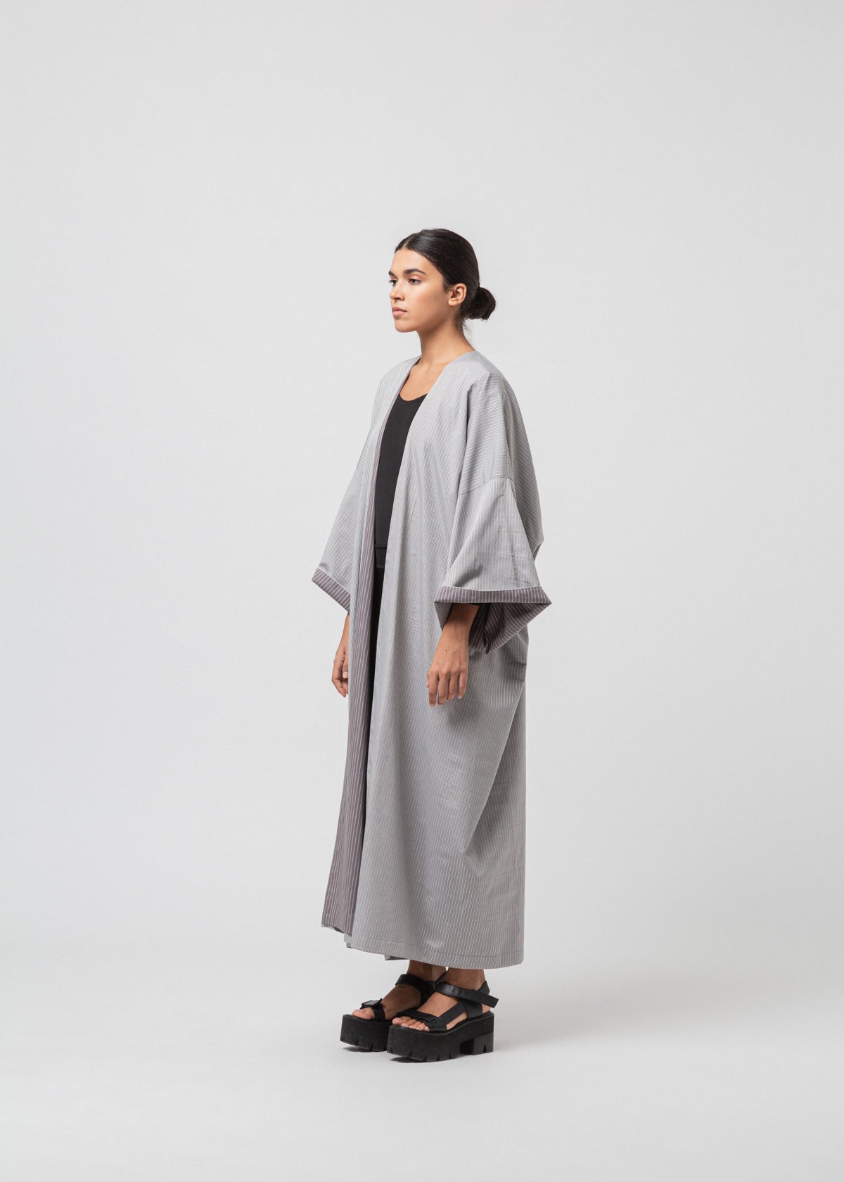An open style cotton caftan, reversible, one side in light grey pinstripes, the other in dark grey pinstripes.
