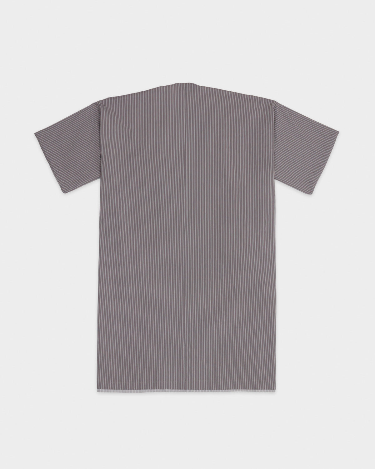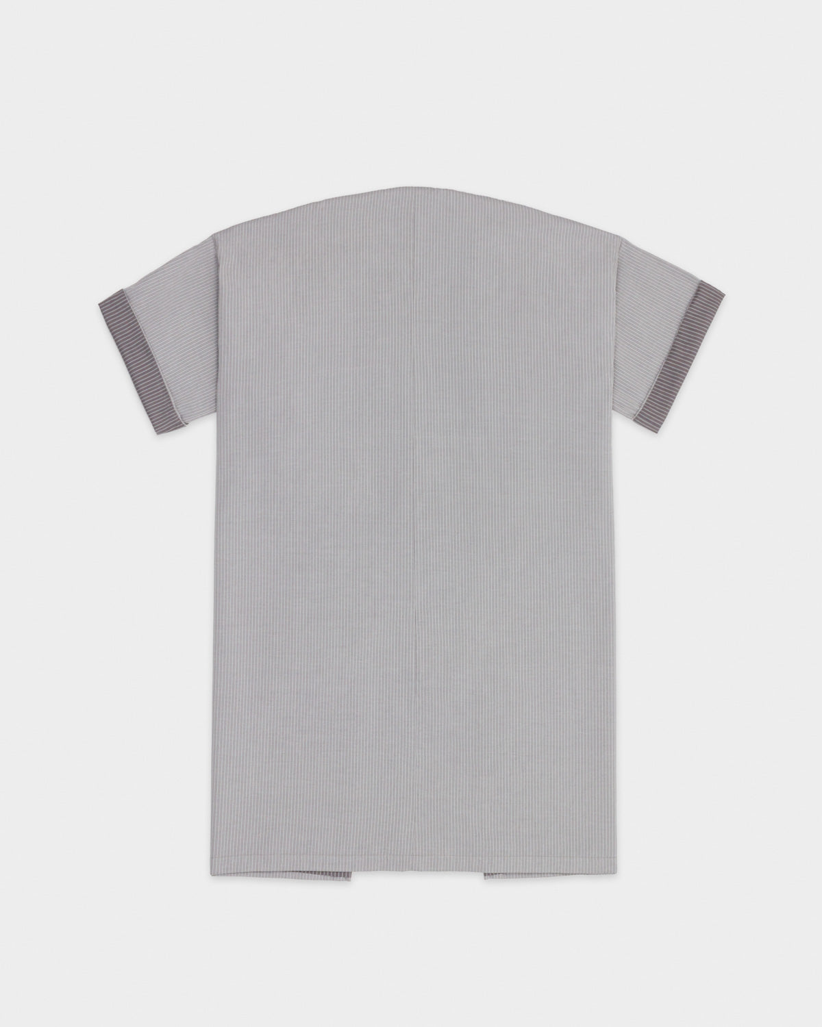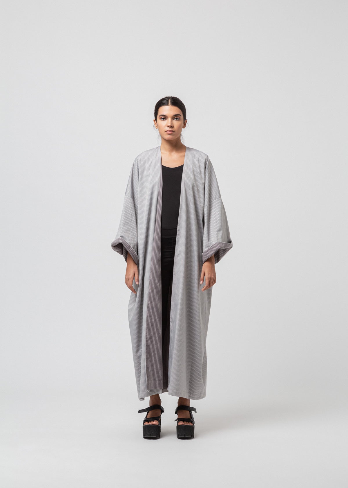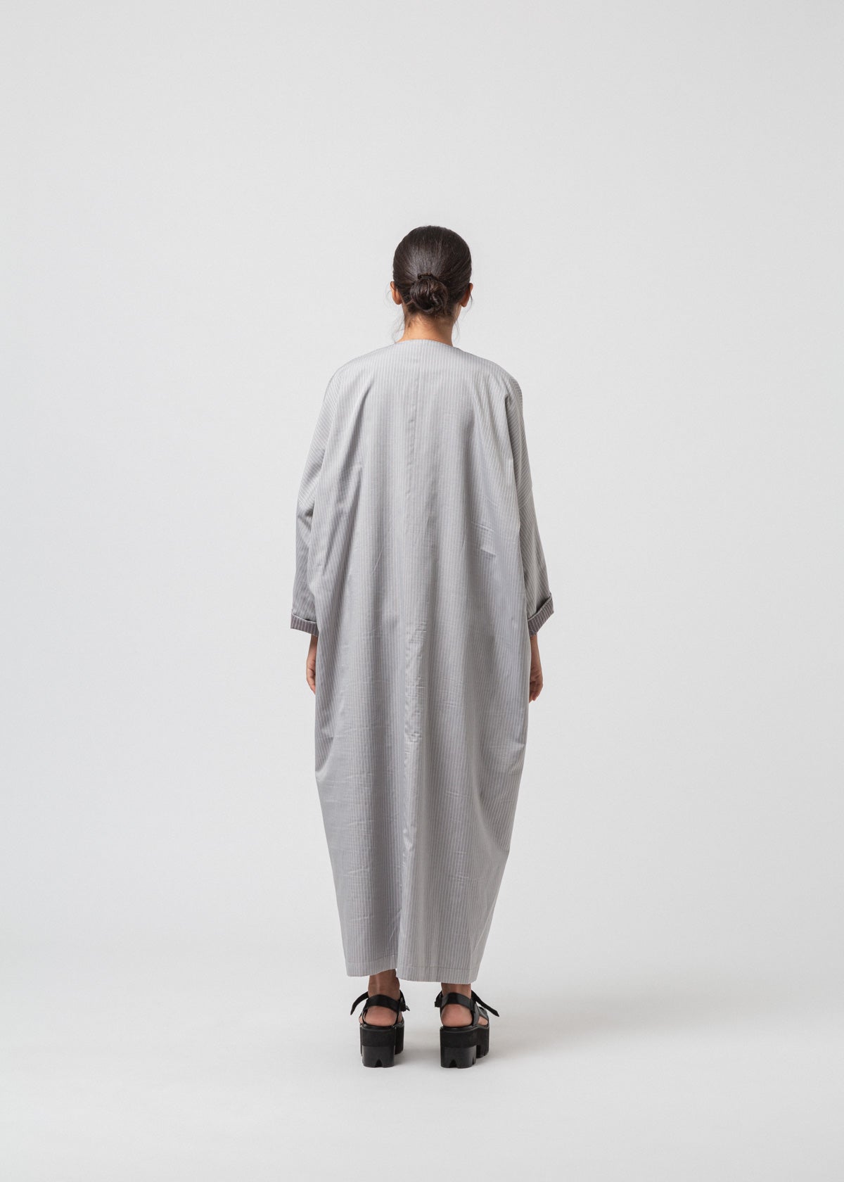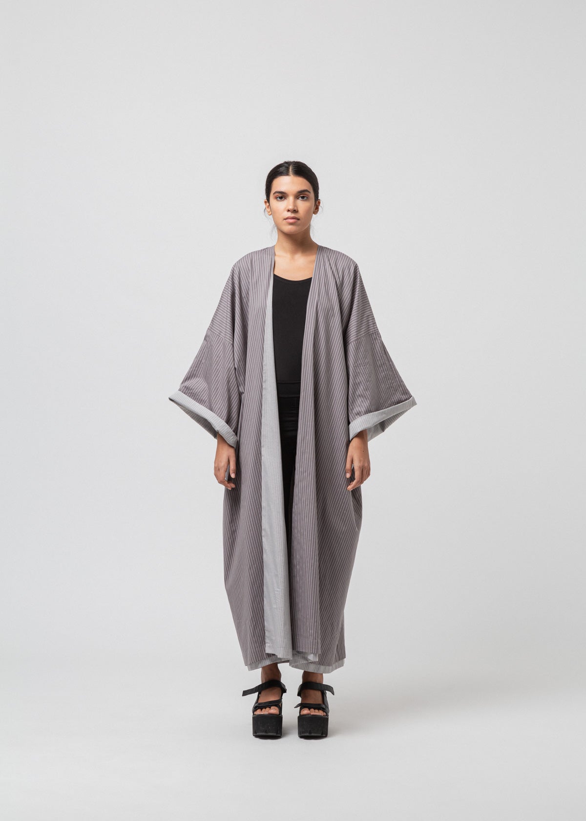 An open style cotton caftan, reversible, one side in light grey pinstripes, the other in dark grey pinstripes.