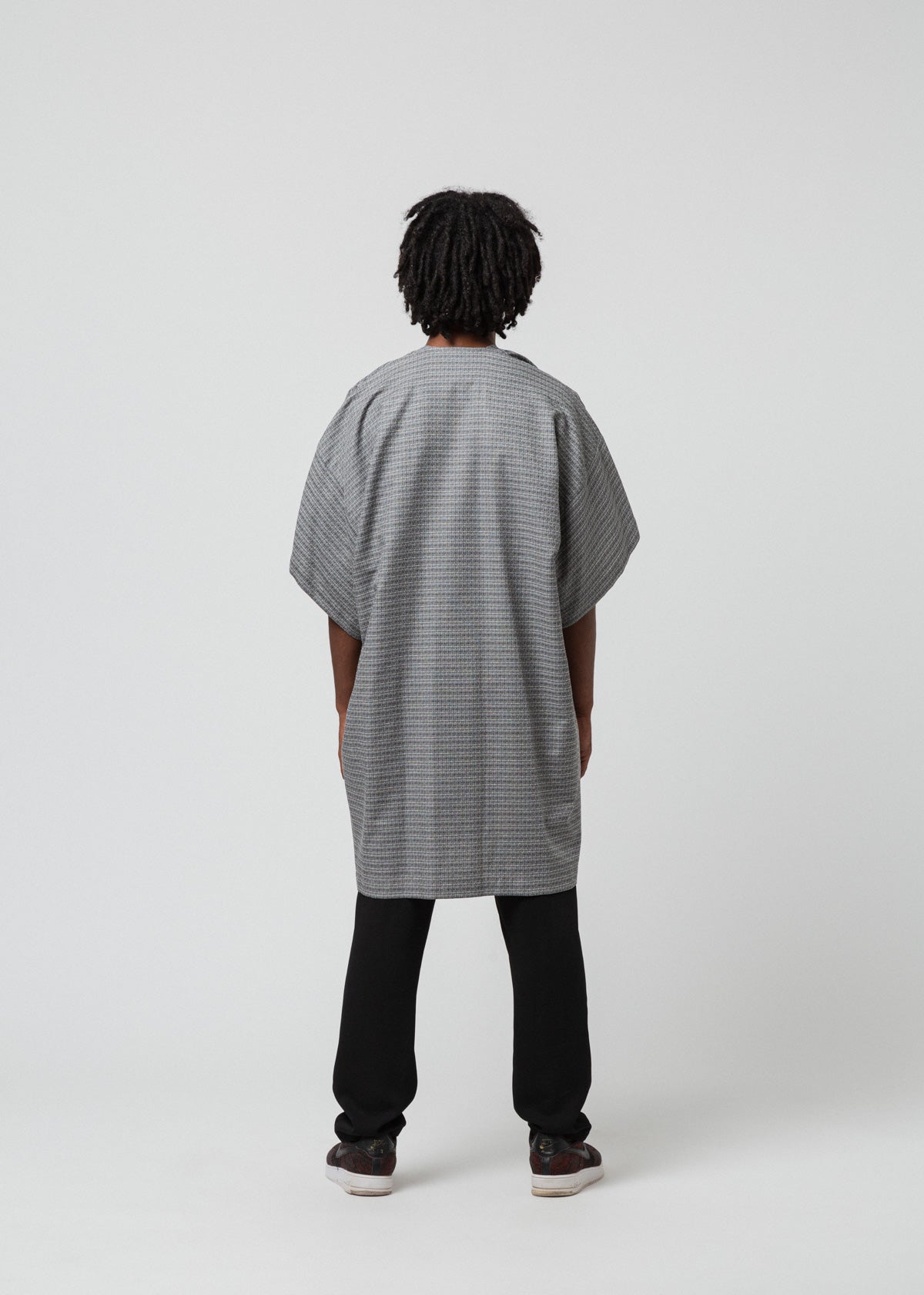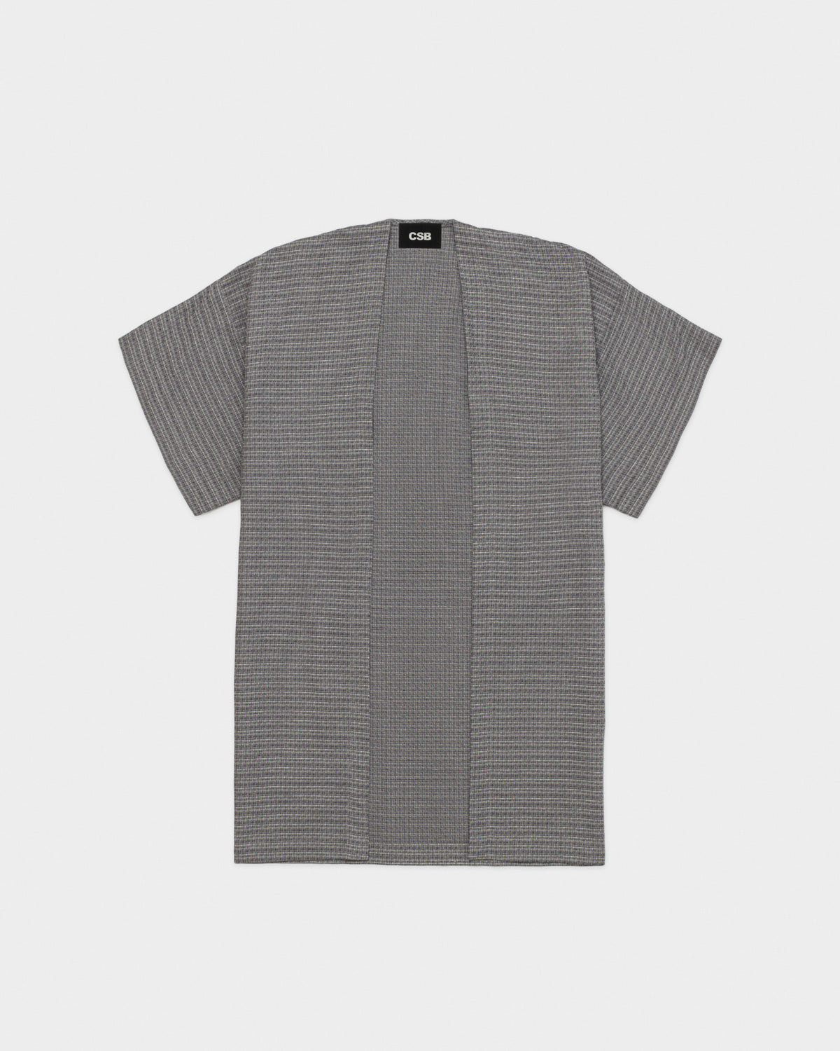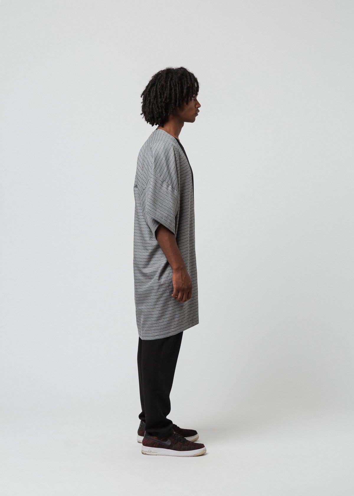 Lightweight, knee-length kimono in soft grey with dropped shoulders and wide short sleeves.