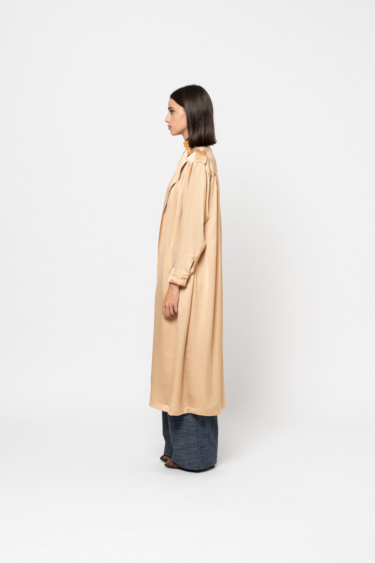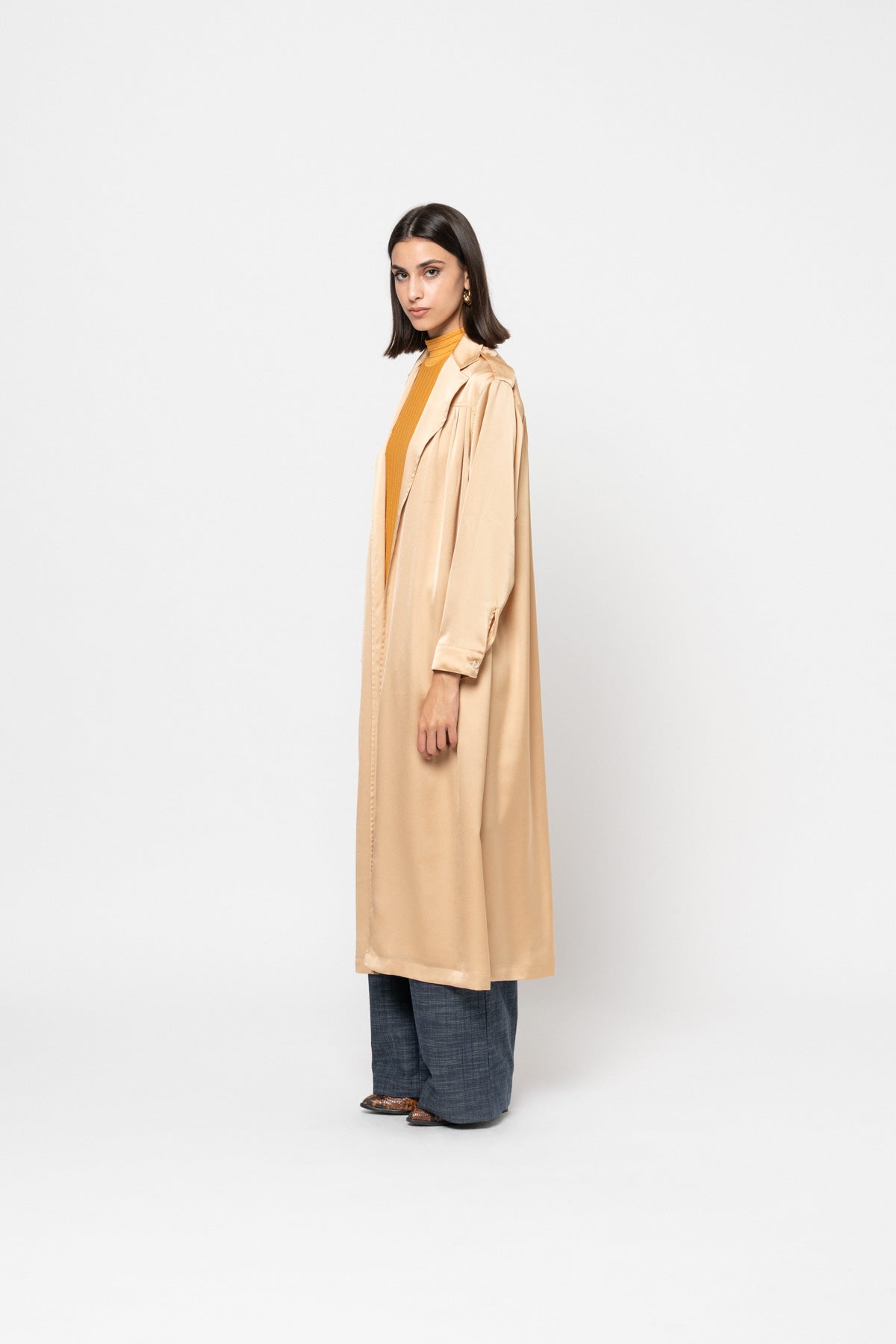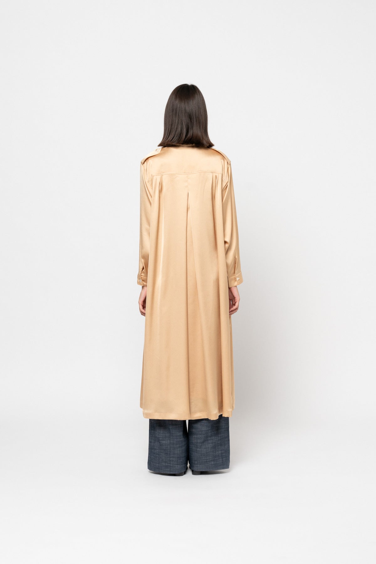 A full length silky, buttonless trench coat with dropped front and back shoulder pleats, shoulder button tabs, a black belt, and side pockets.