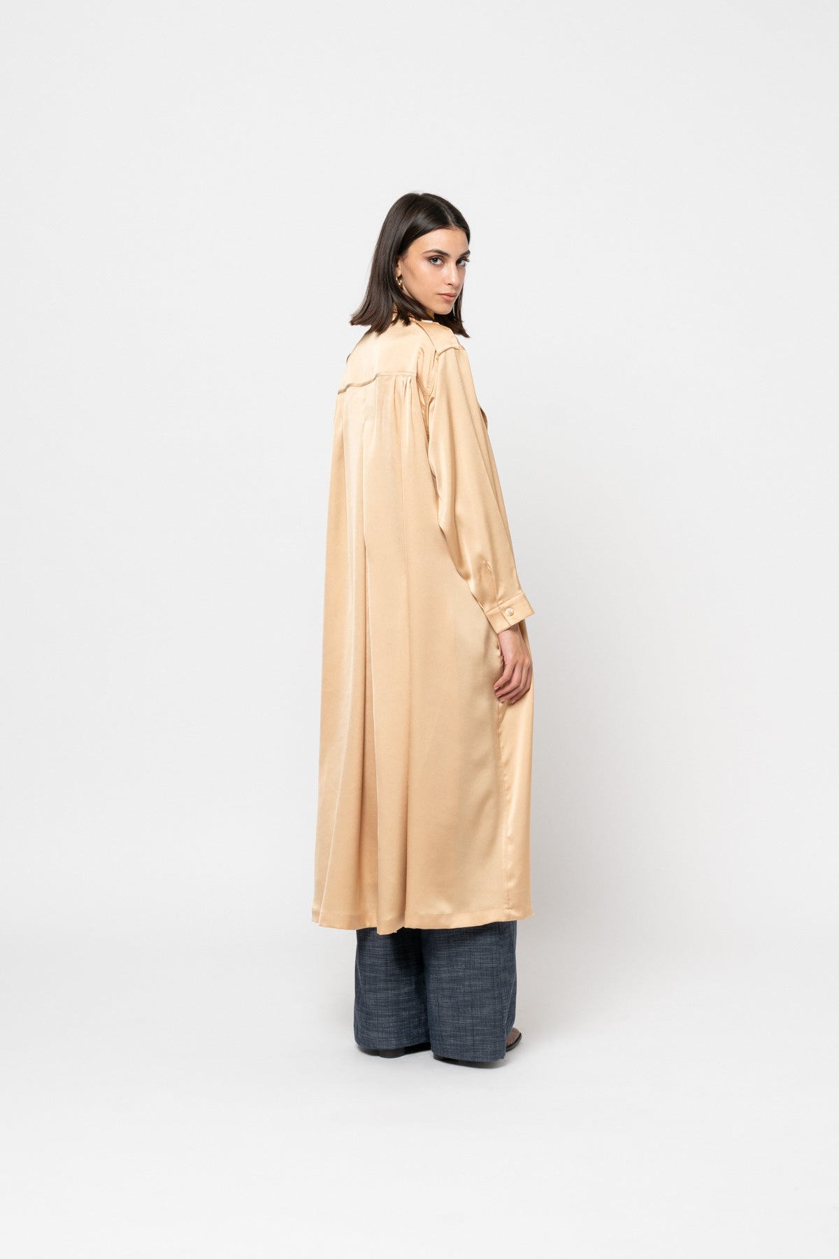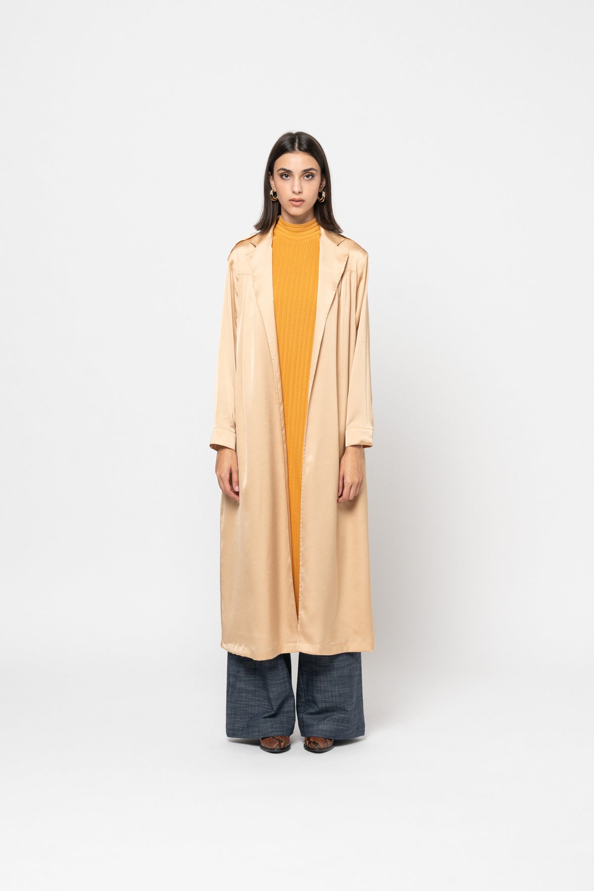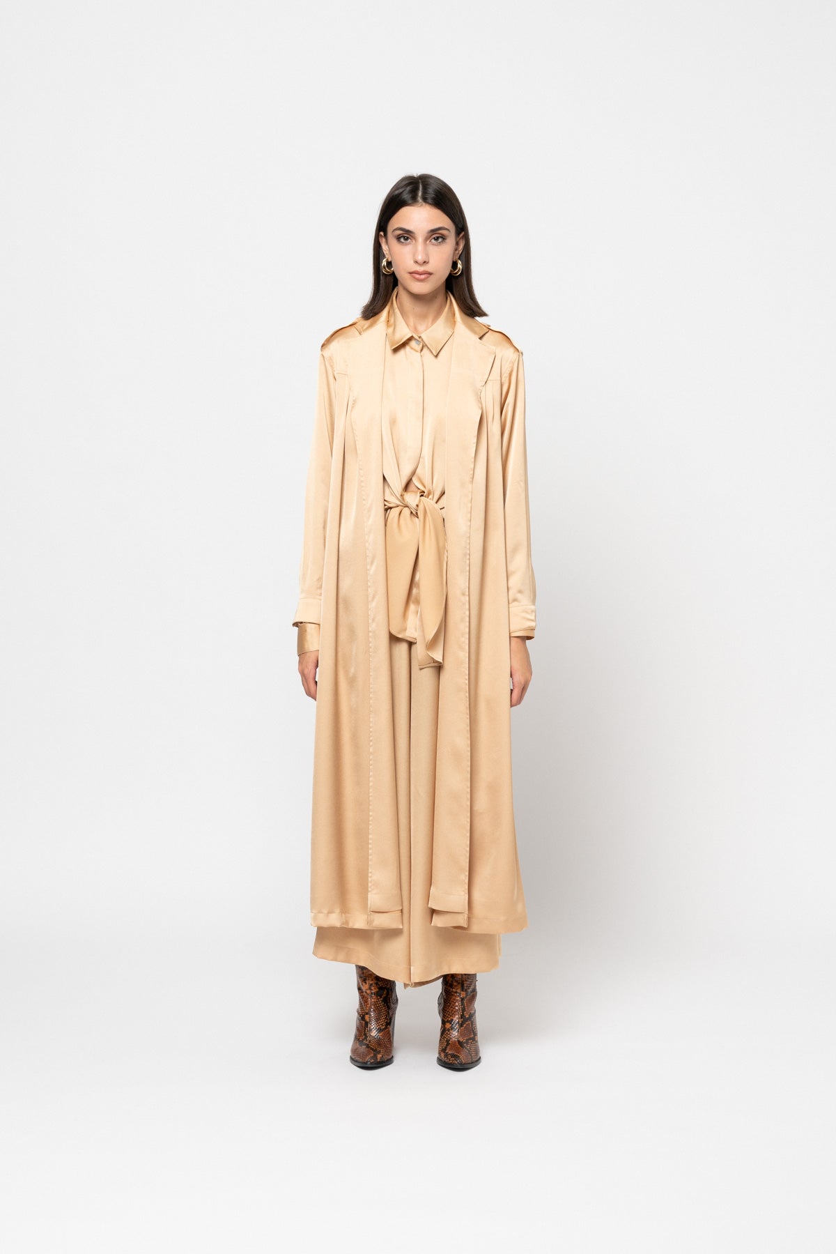 A full length silky, buttonless trench coat with dropped front and back shoulder pleats, shoulder button tabs, a black belt, and side pockets.