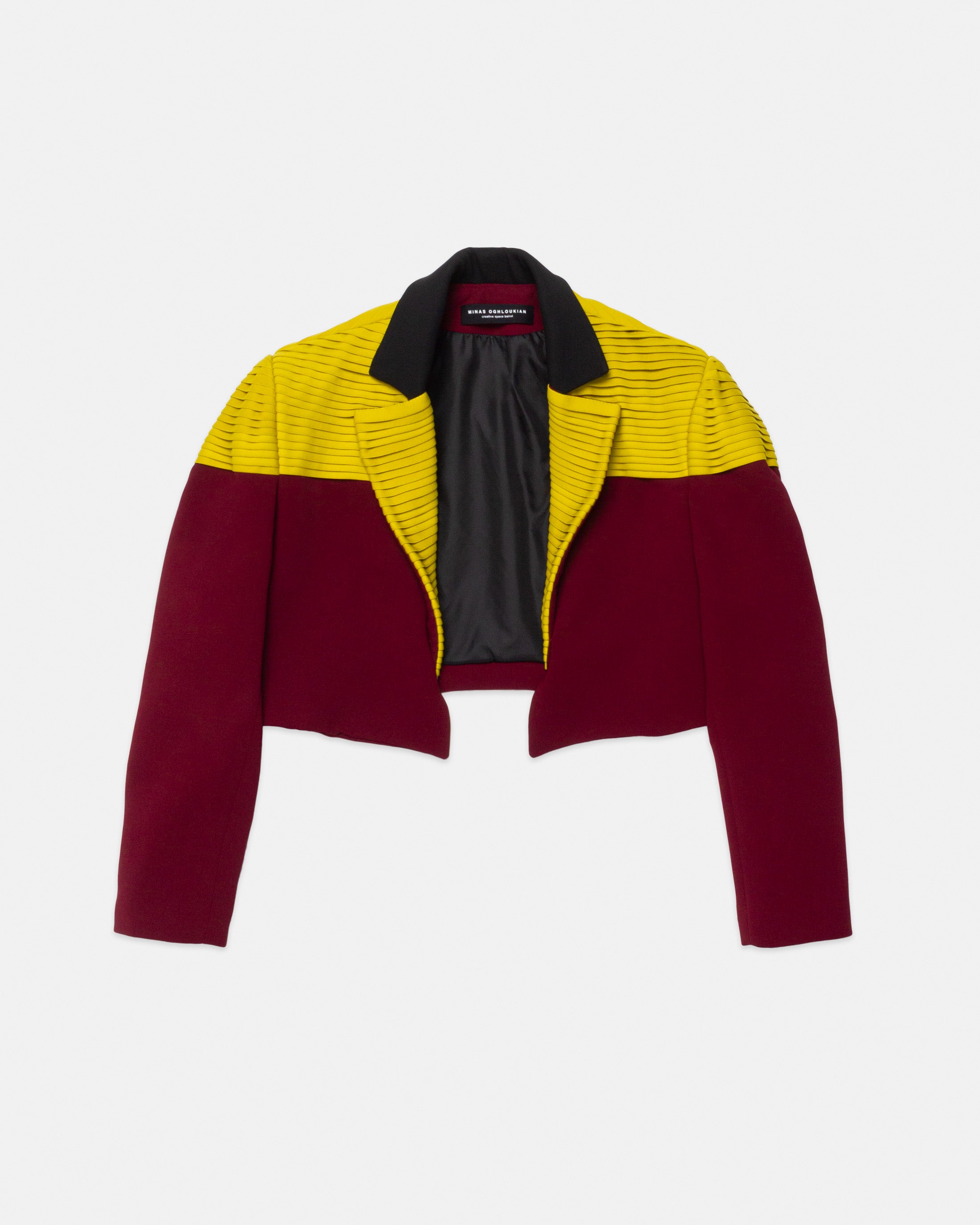 A color-blocked cropped tailored jacket featuring yellow pleat-like material work.