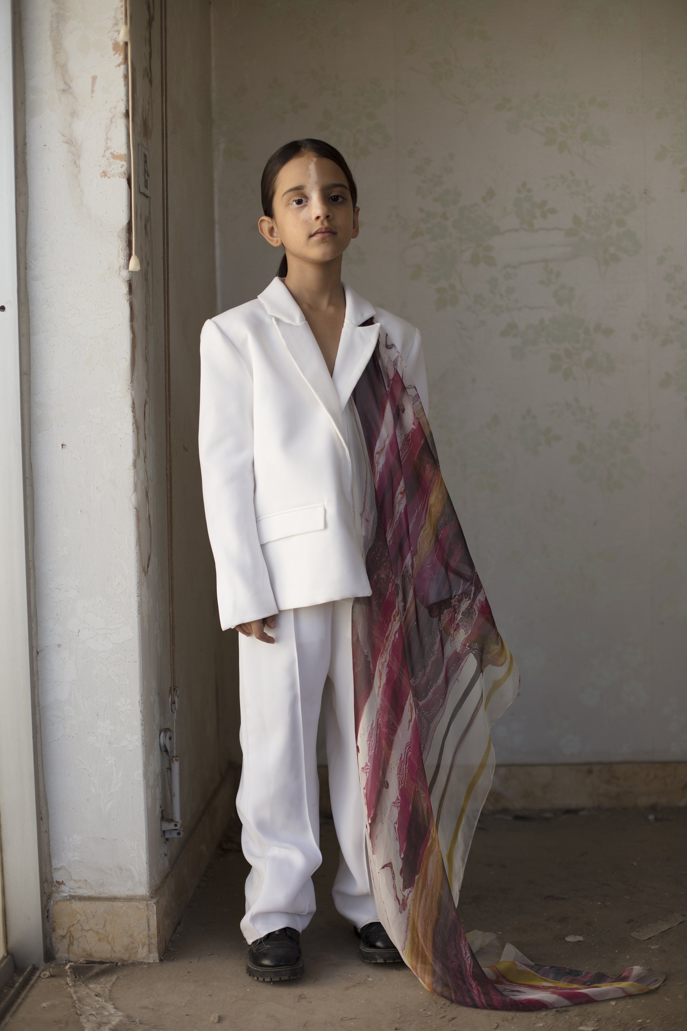 The suit is a crepe children’s suit with draped chiffon including a print that was developed from Amir's sketchbook.