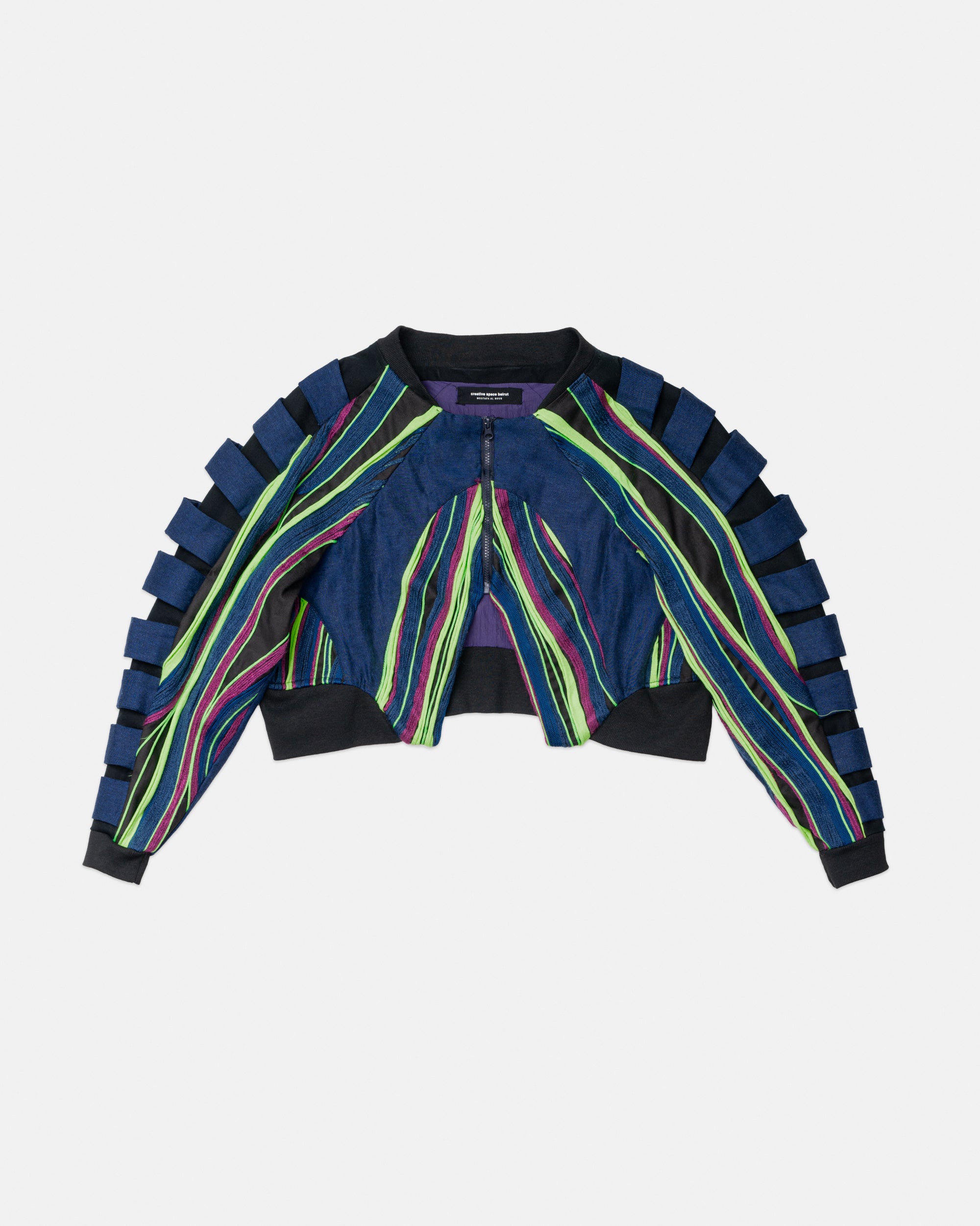 Motorcycle bomber jacket with straps on sleeves, triangle shaped cut out at front, and material work print.