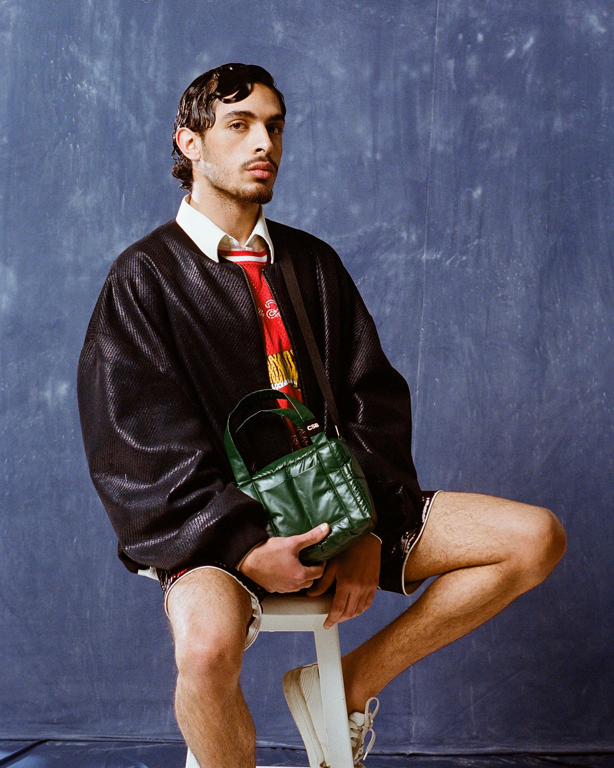 Designed by Nour Chamseddine, Class of 2026. An oversized bomber jacket in a deep midnight blue-black hue.