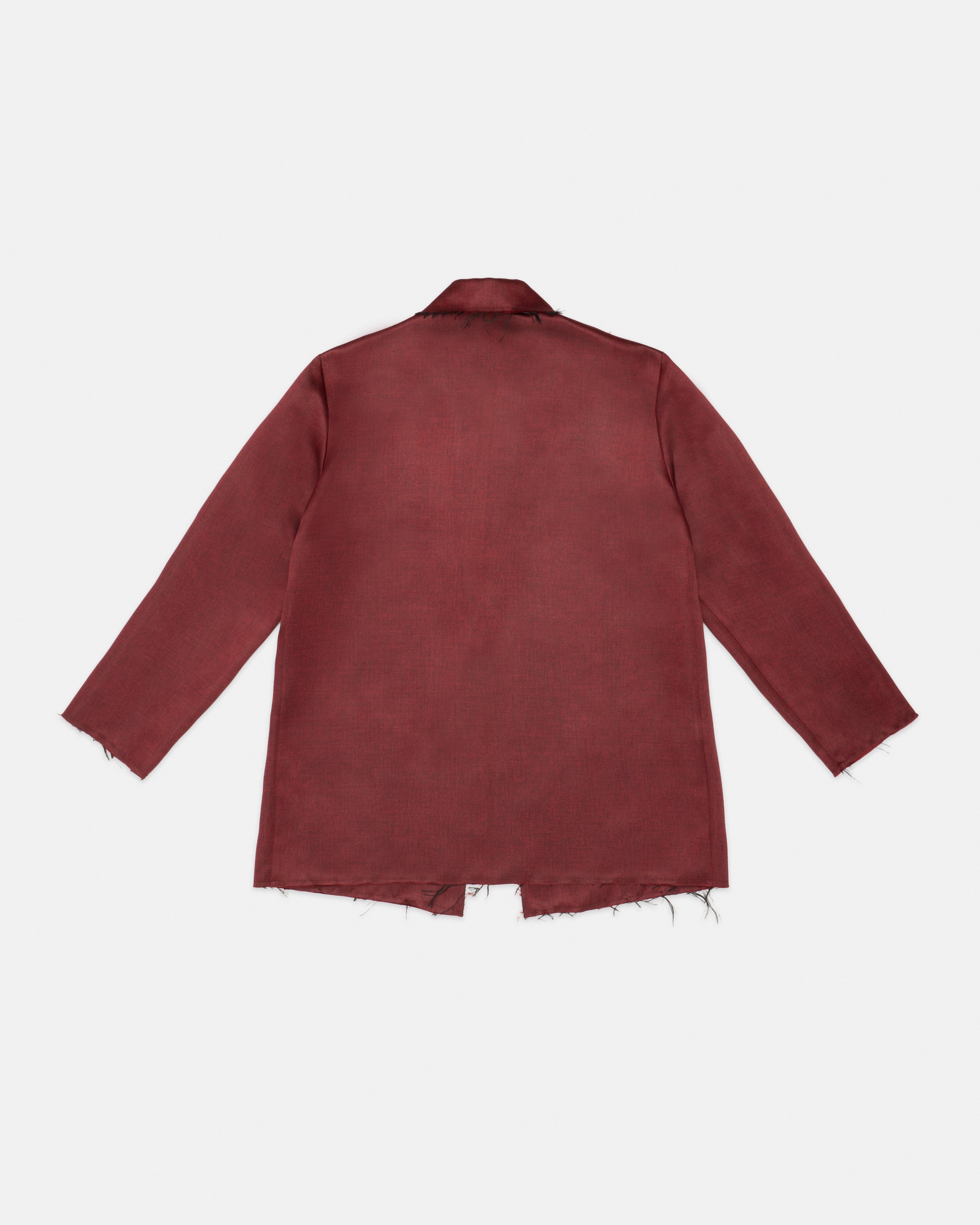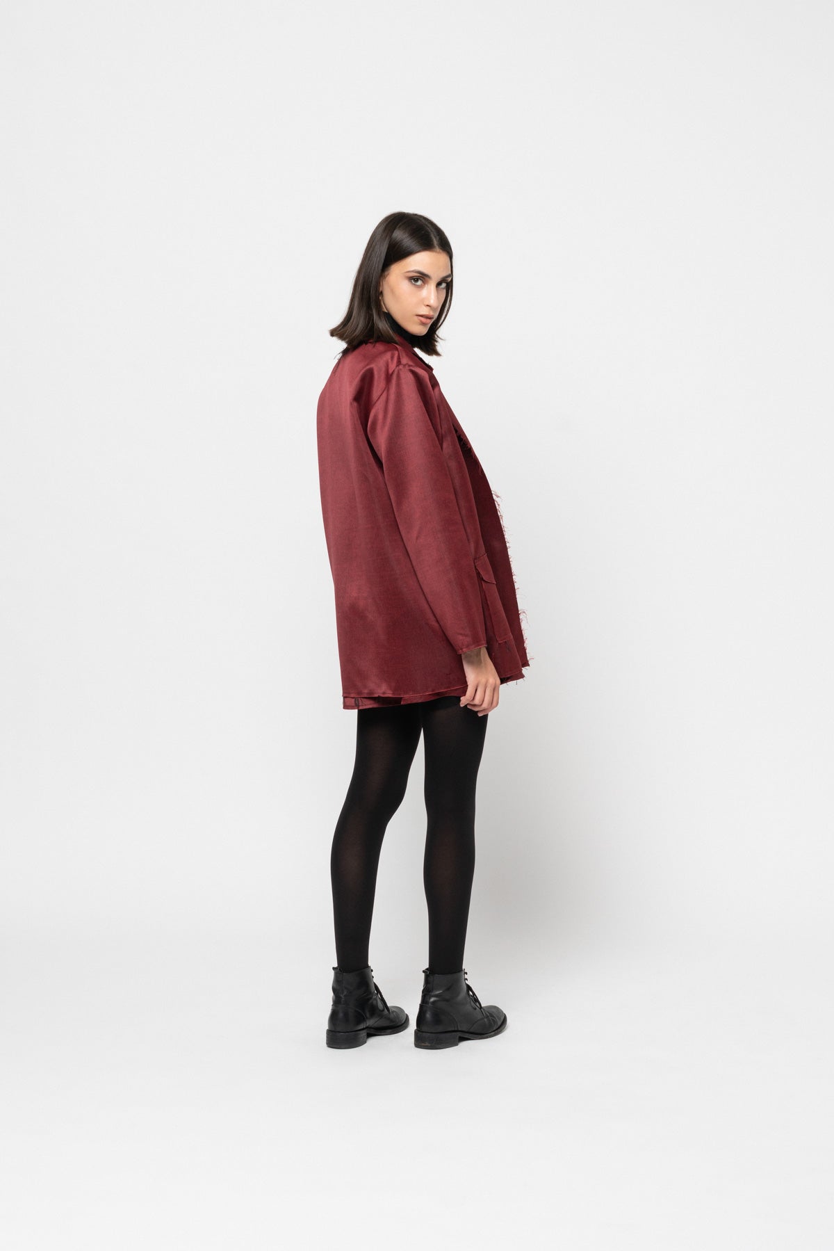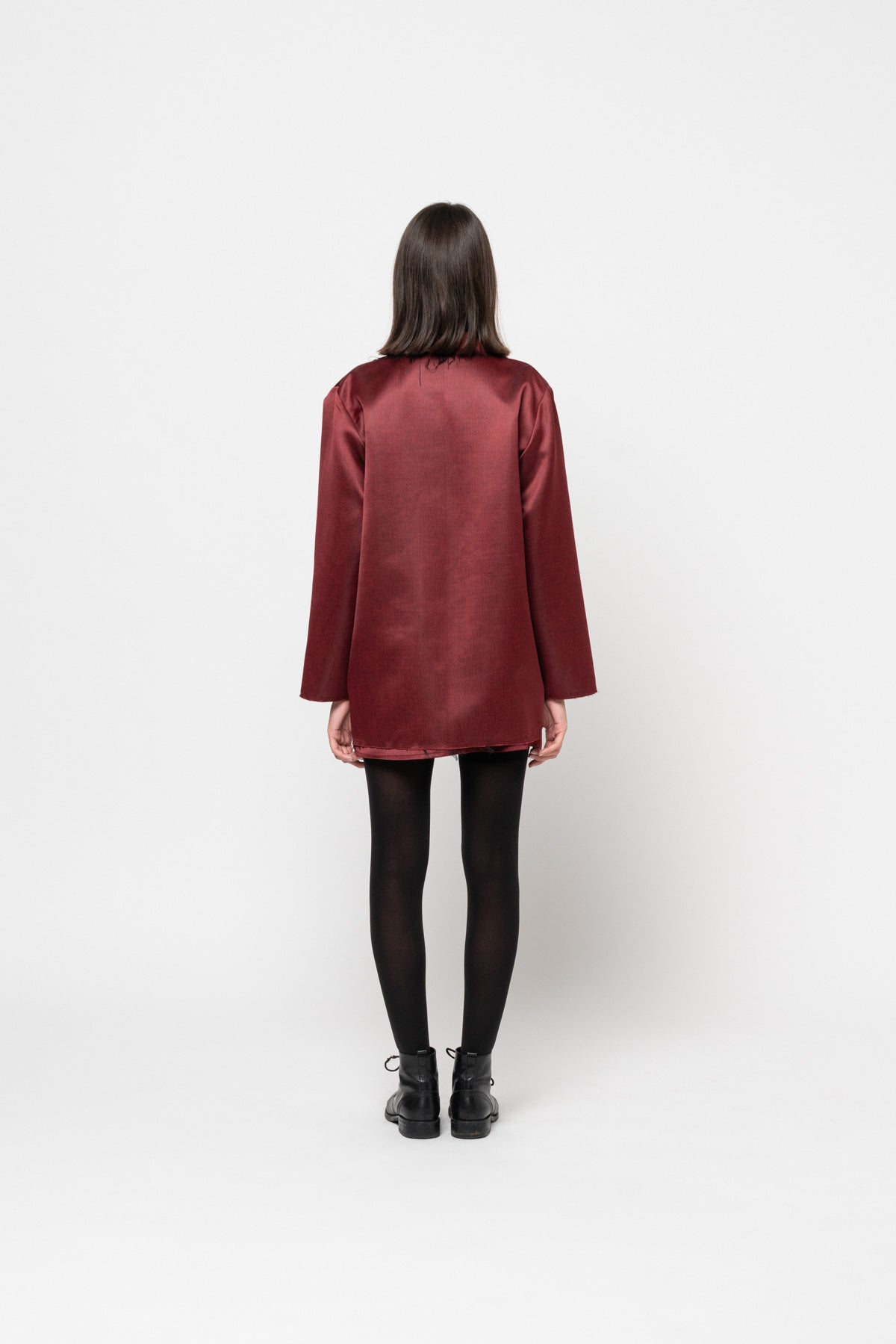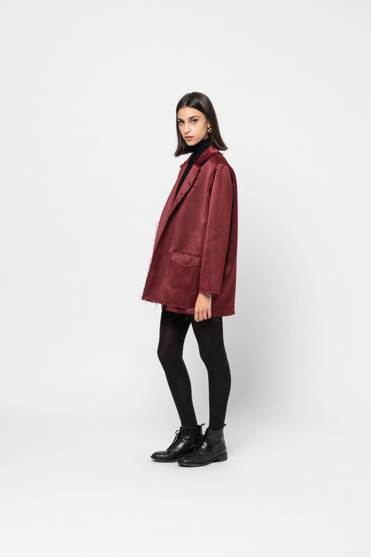 A tailored, buttonless blazer in a burgundy satin. Featuring raw finishings and side pocket.
