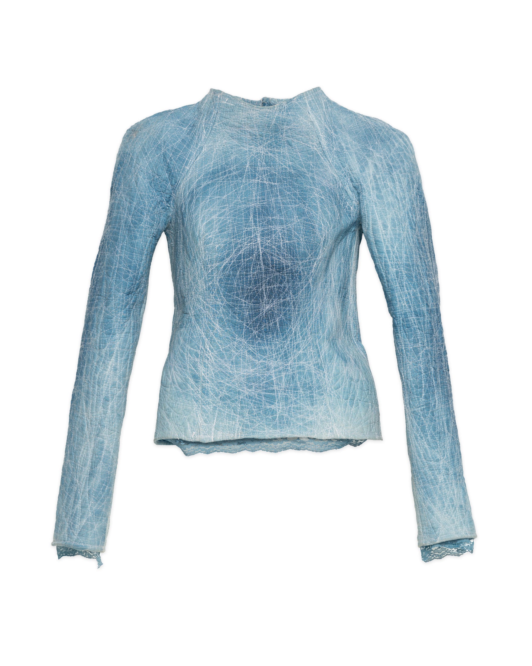 A top constructed from three layers of cotton, with scraps from the collection production embedded between each tier, like emotions trapped in a cold embrace. Quilted with harsh, exaggerated stitches with piercings as closures for the back.