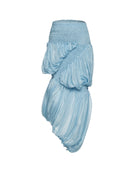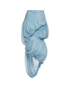 An asymmetrical skirt crafted in a silk-cotton blend, its surface is distort through the smocking technique with elastic, creating ripples that curve around the body, representing the shapes made by trauma.