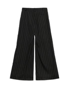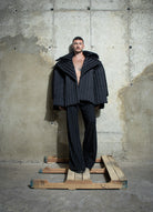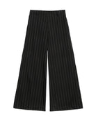 Tailored from black Italian wool with subtle gray pinstripes, these classic wide-leg pants are constructed with meticulous attention to pattern alignment. The stripes are matched precisely across cuts and seams, reinforcing a clean vertical flow throughout the silhouette.