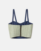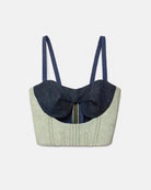 A two-toned denim bullet bra corset with boning, featuring a cutout in the front.
