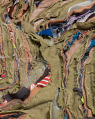 A denim sweater-dress covered in repurposed fabric scraps featuring front pockets.