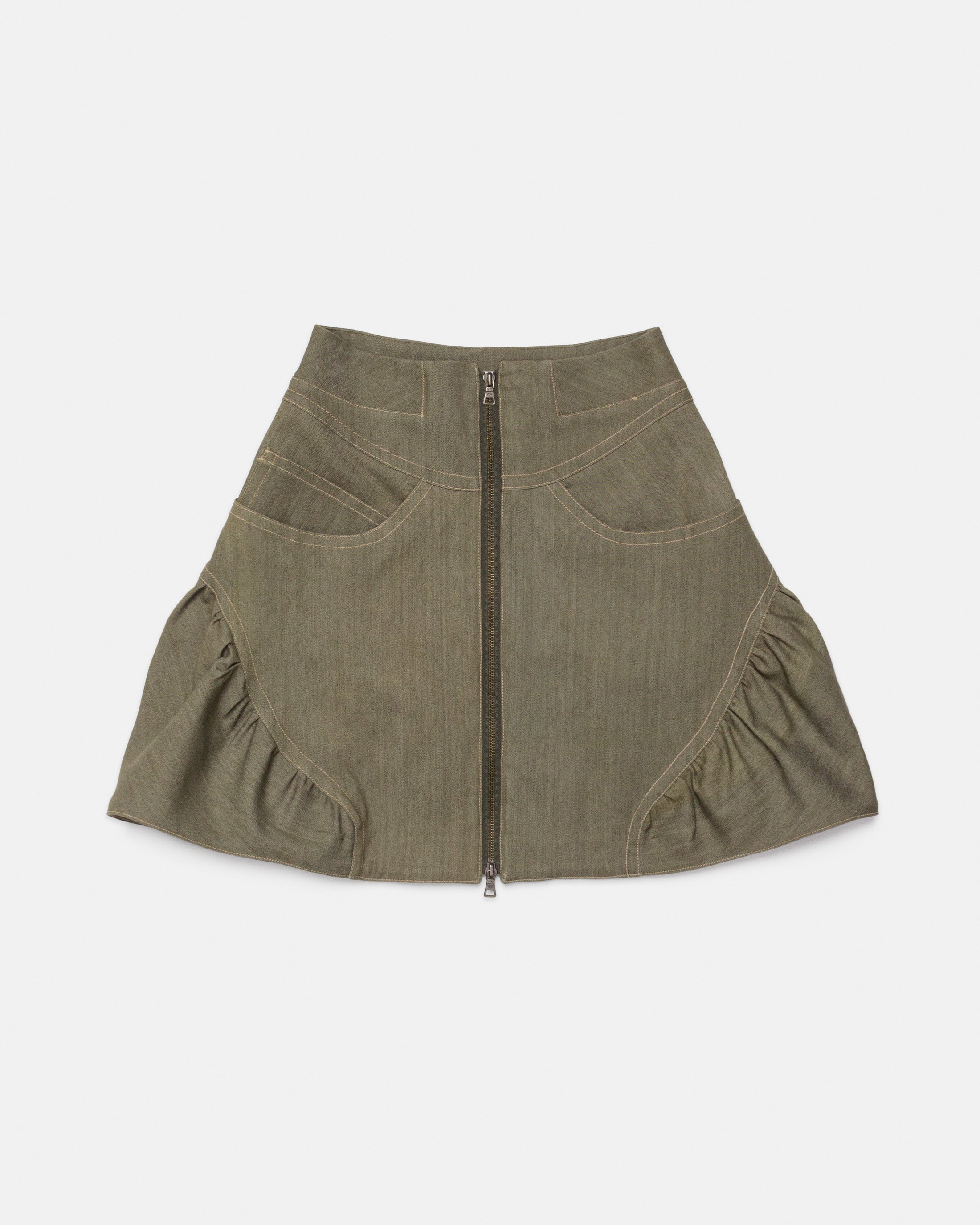 A high-waisted gathered denim skirt featuring side pockets, cuts, top stitching and a front zipper.