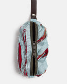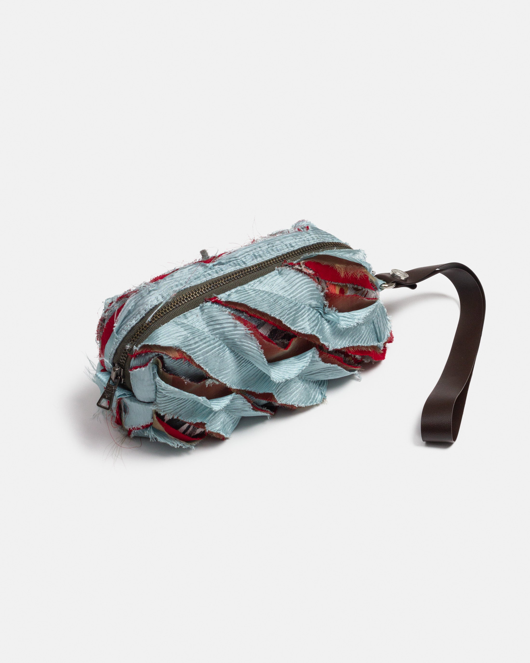 • Slashed pouch made of repurposed fabrics with pleather handle.