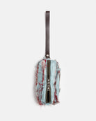 slashed pouch made of repurposed fabrics with pleather handle.