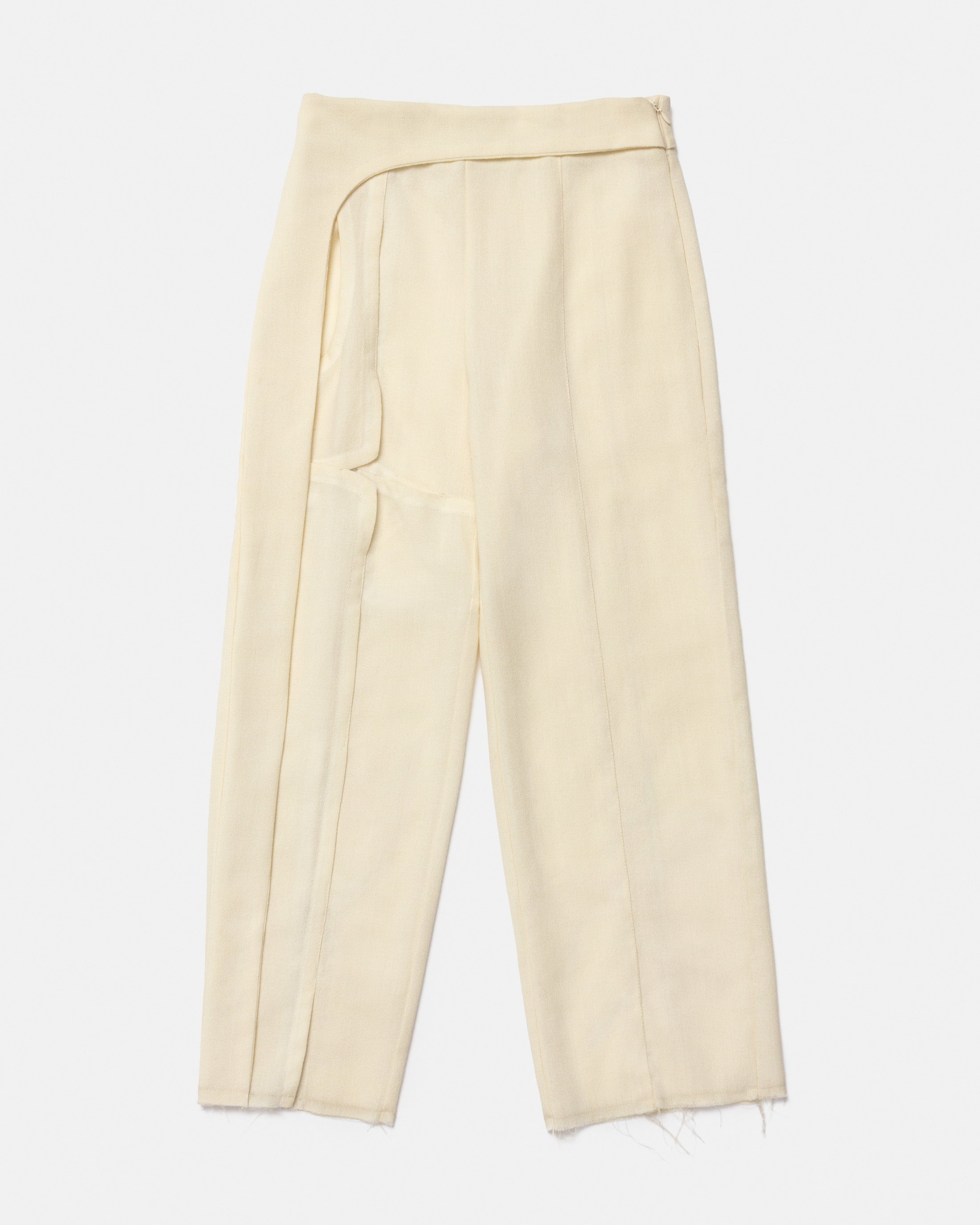 White monochrome trousers with overlaps and cutouts.