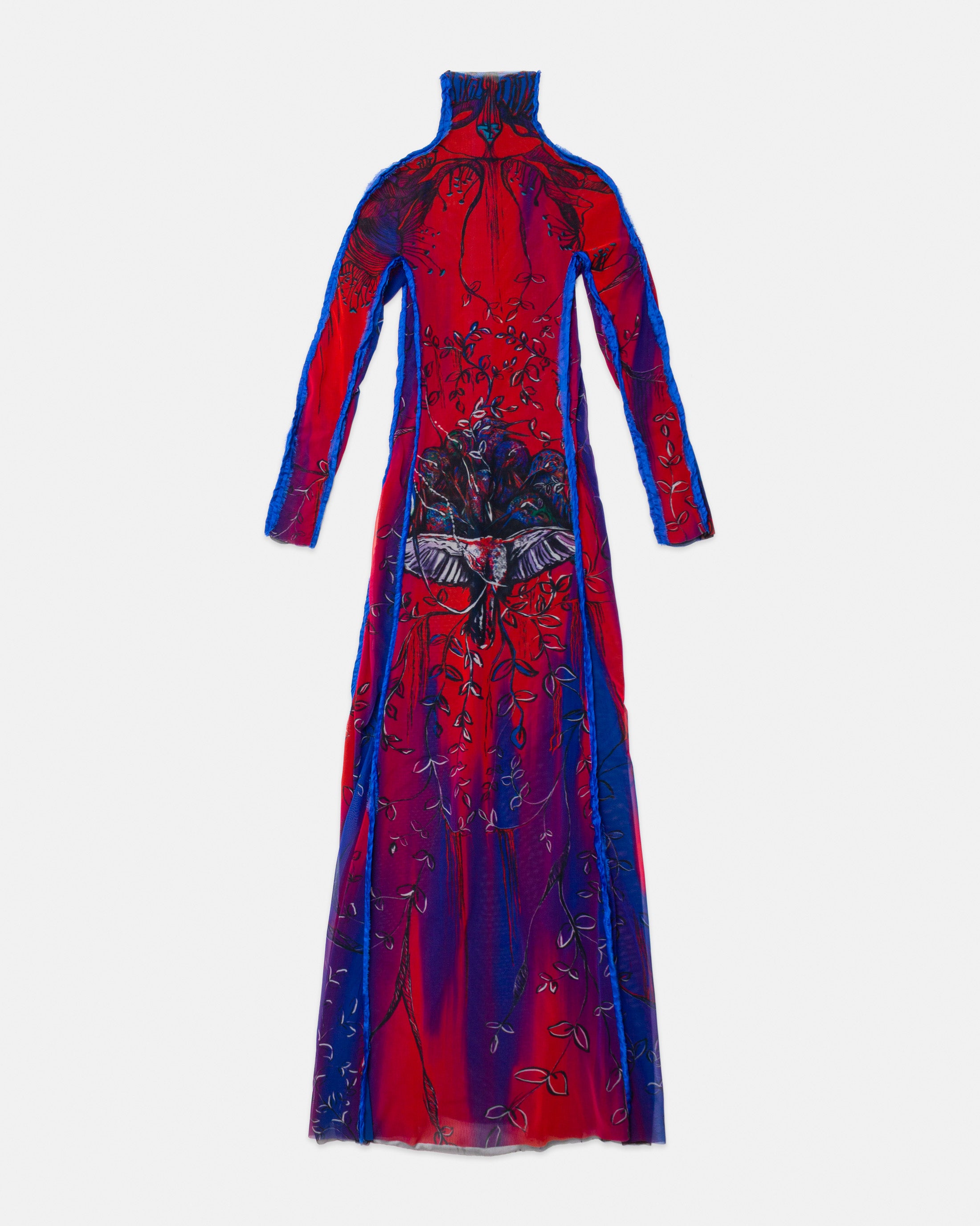 Digitally printed sheer turtle-neck dress featuring godets and frayed electric blue chiffon finishing. Illustration by Creative Space Beirut alumni Anis El Jamal