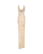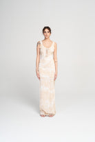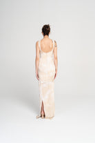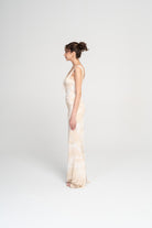 Twenty-eight piece jersey dress with raw edge detailing, featuring a deep V-neckline accented with eyelets.