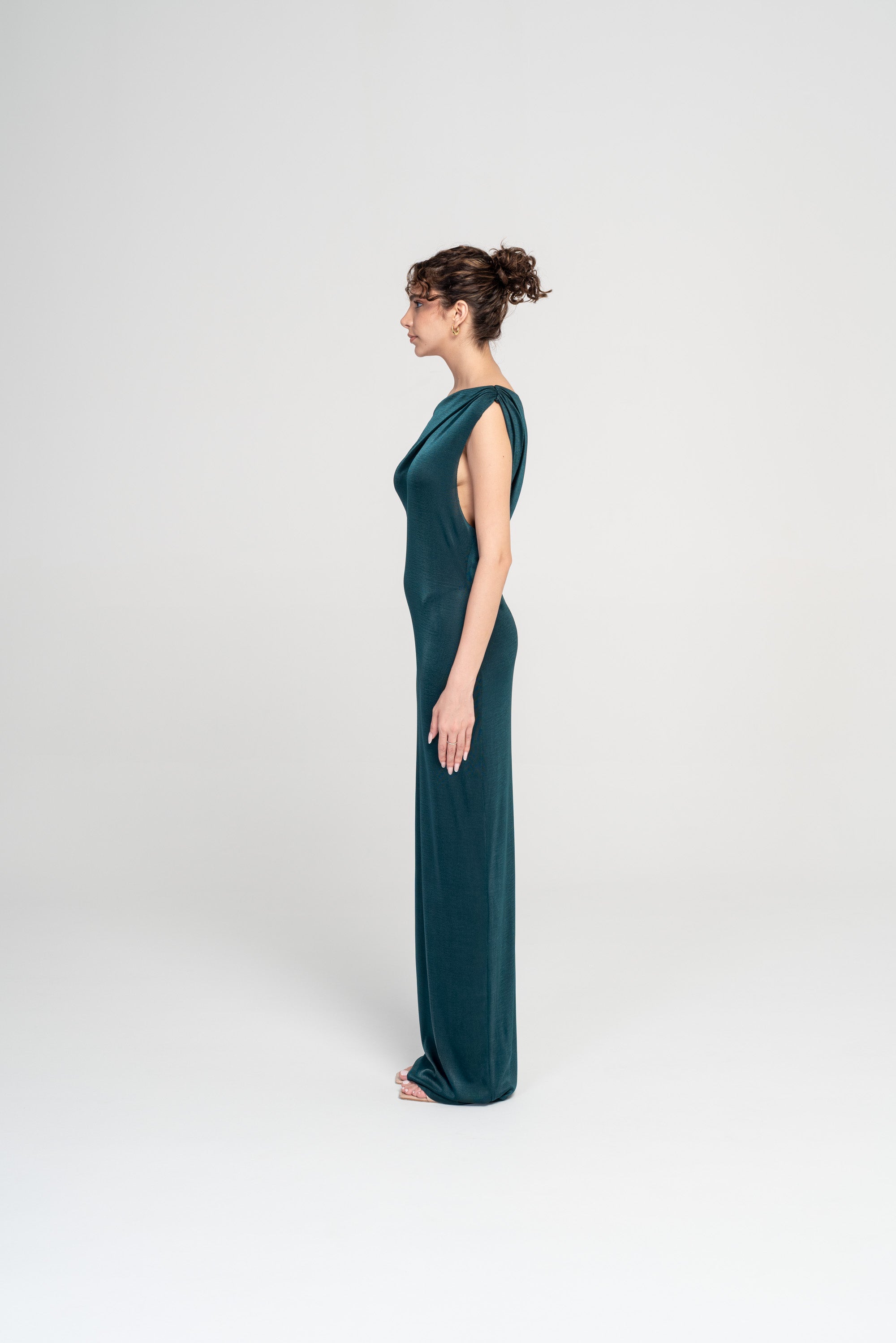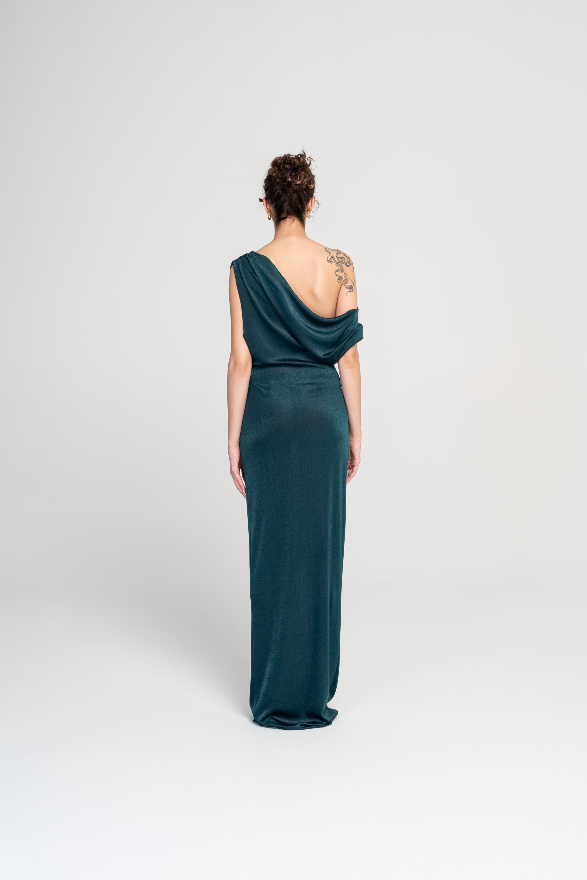 Maxi leaf green jersey dress offering both one-shoulder and off-shoulder options for a dual-style look.