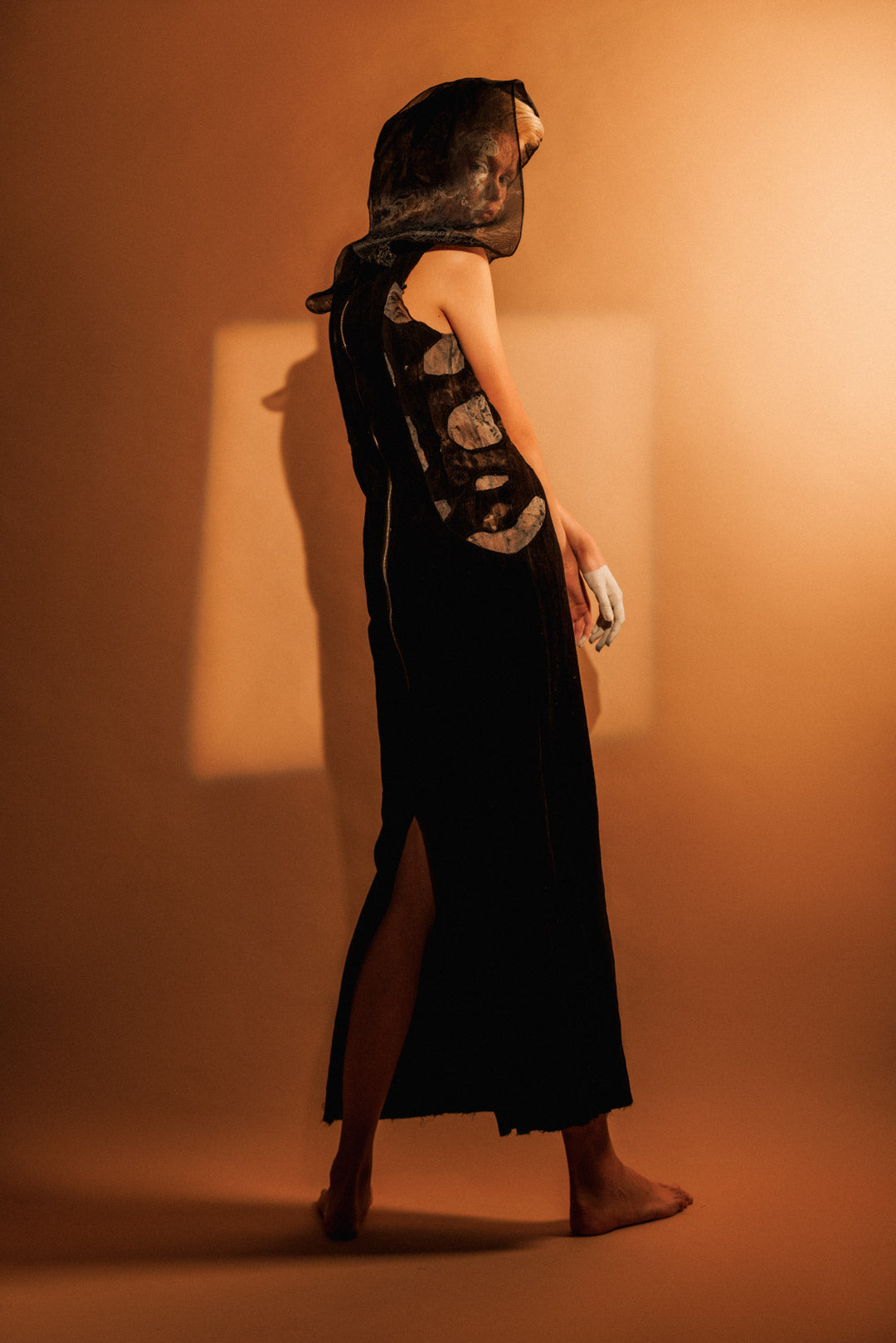 A black crinkled velvet dress featuring side circular panels layered with cutout burnt velvet and a block printed organza base, an oversized block printed organza hoodie and, exposed zipper and slit in the back seam.