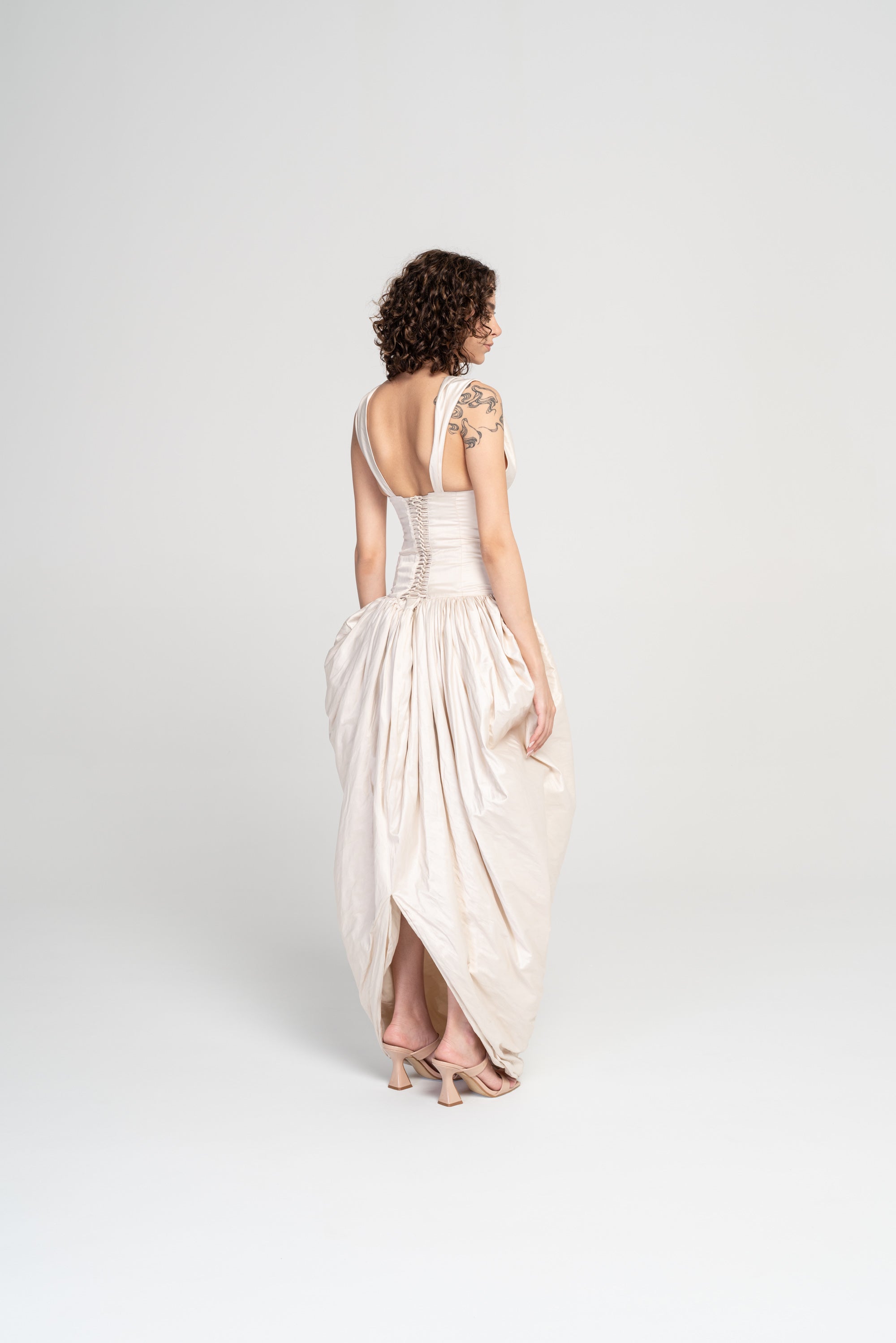 A cowl-neck corset dress with a dramatic, voluminous skirt. Designed by Miled Chahla for The Caroline Method Creative Draping course.