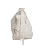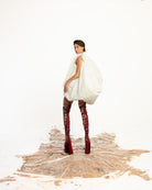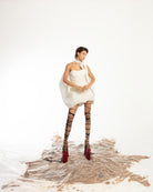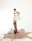 Mini white brocade draped dress creating a body-hugging silhouette that transitions into a voluminous shape at the back, finishing with a bow at the neck.
