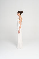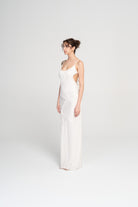 26 pieces dress in polka dot jersey featuring raw edge detailing, open back, and adjustable tie closure