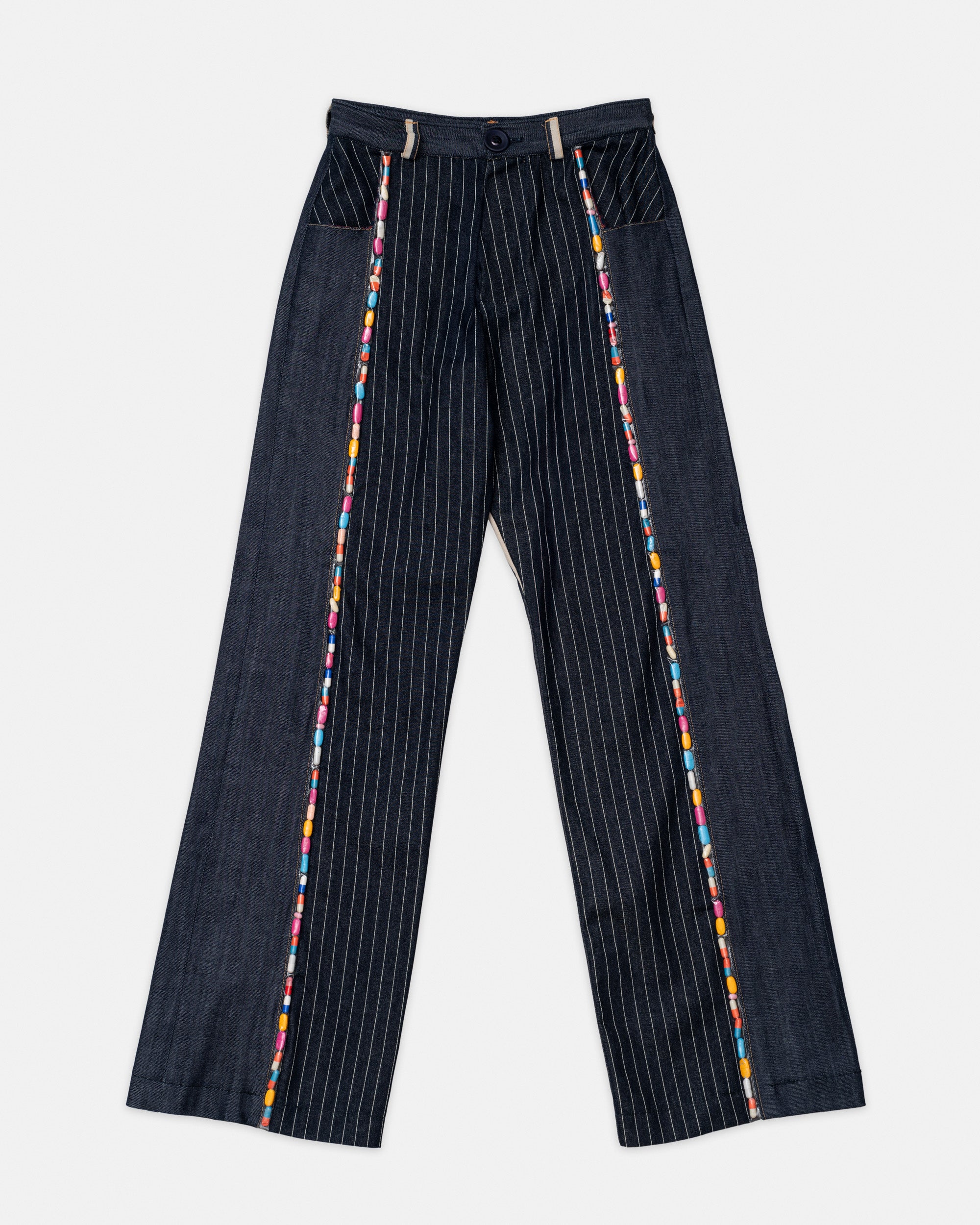 Straight cut pants with two pockets and pill-stuffed lining in front.