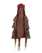 A round-collared, A-line maxi dress crafted in silk, featuring an arched front detail, an open back, and cascading ruffled layers along the sides. The piece incorporates hand-weaving techniques that blend macramé cotton, sheer nylon netting, and soft jersey, resulting in a garment that flows between transparency and texture.