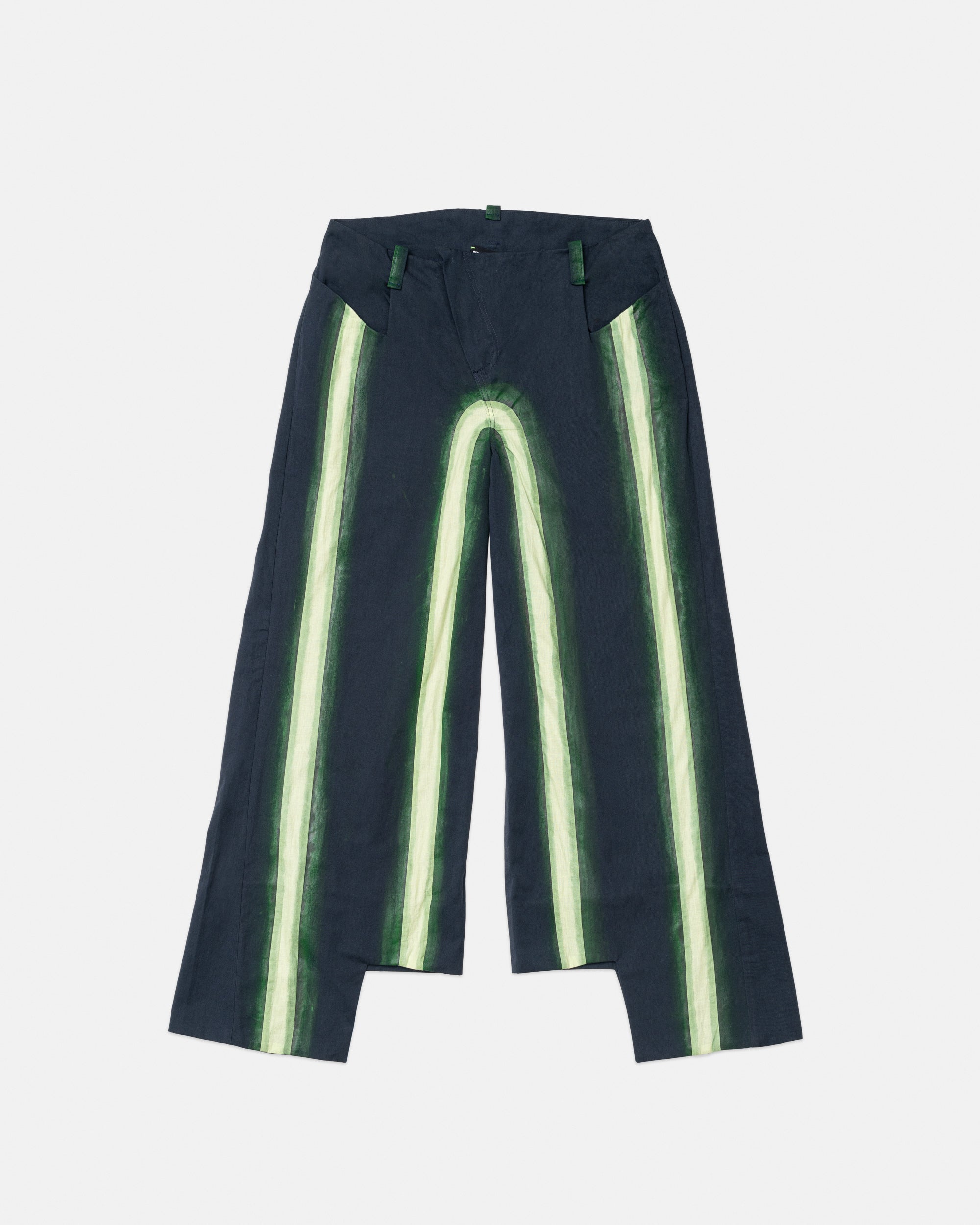Asymmetrical flared trousers with puzzle hems and hand painted poplin cut outs with fabric painted outlines.
