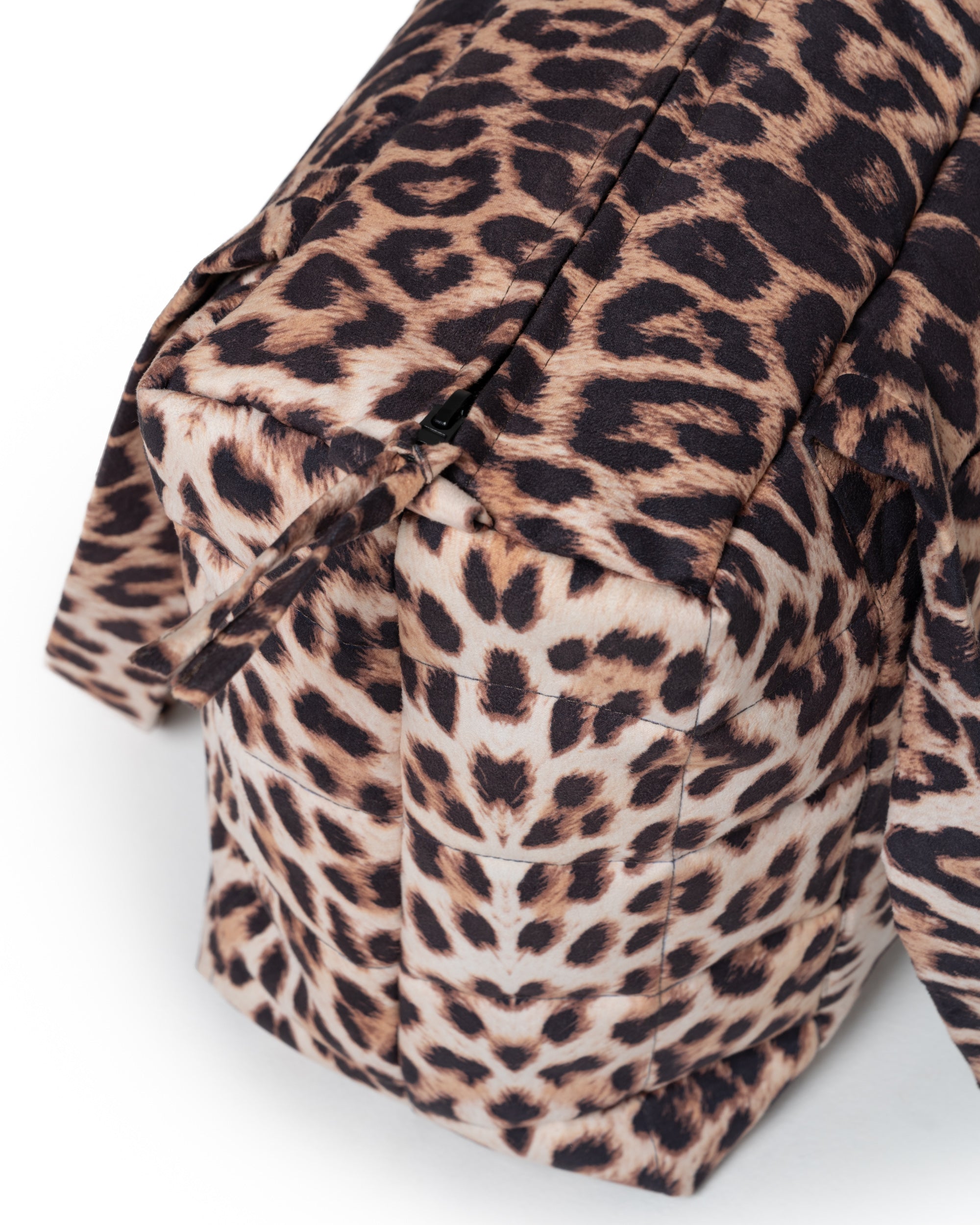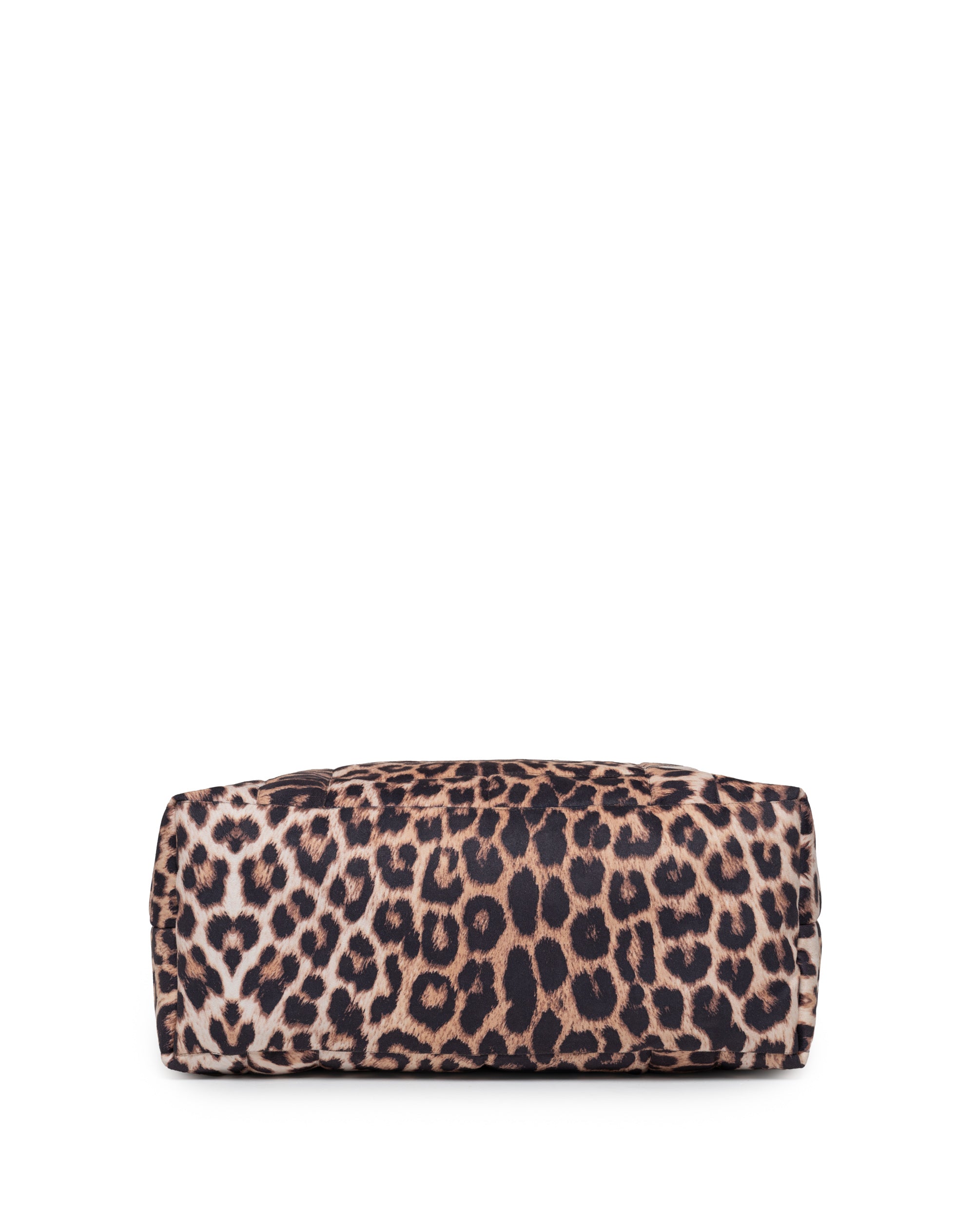 Medium rectangular puffer bag in Leopard print Nylon coated canvas. Featuring a pocket on the outside and a zipper pocket on the inside.