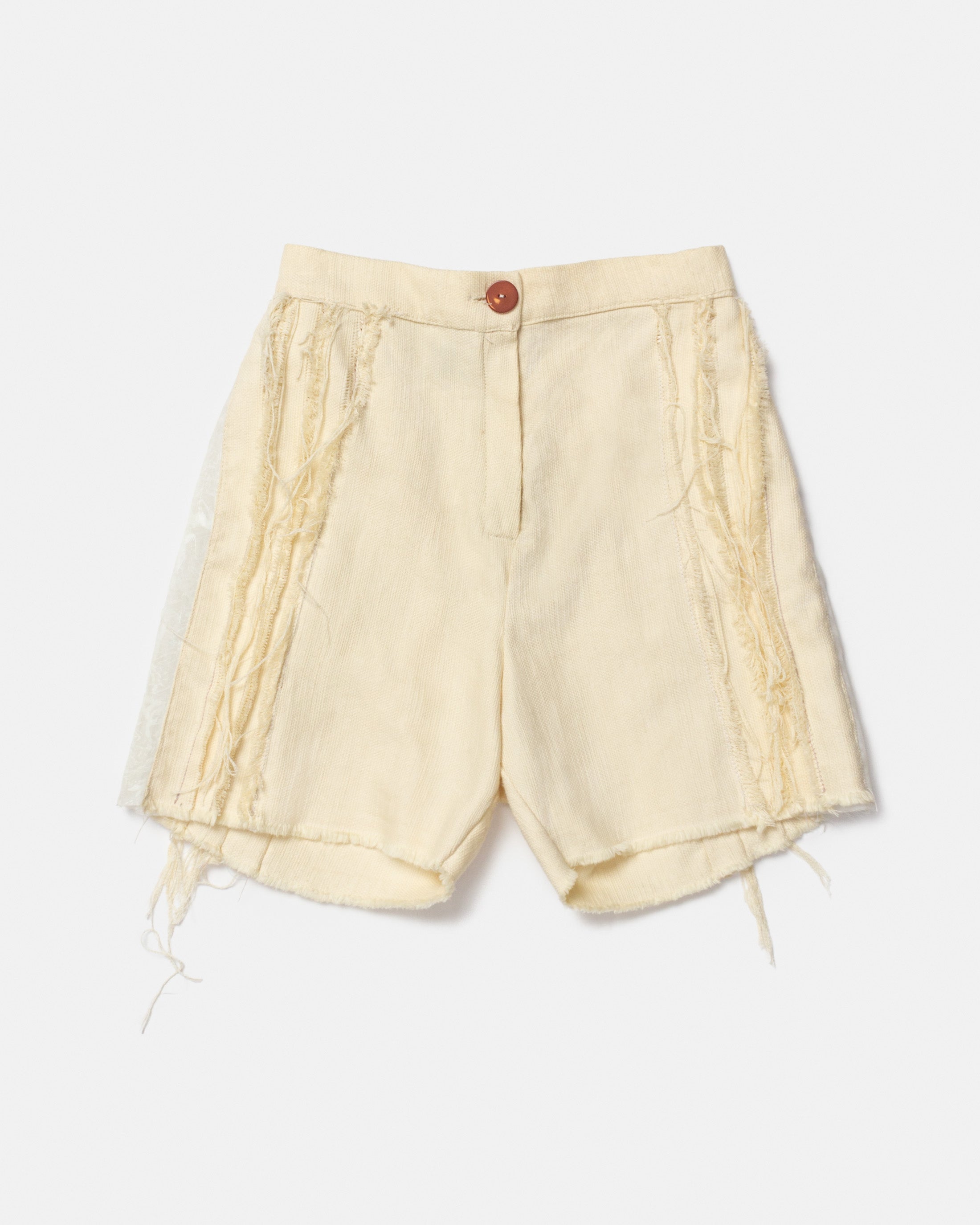 Off-white soft linen shorts with block printed organza cutouts and frayed detailing.
