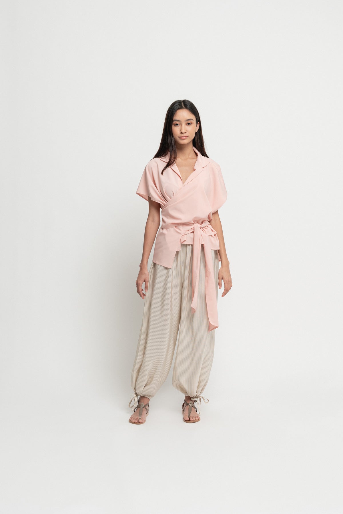 Powder pink cotton shirt with a convertible collar and a loose layer that crosses over and ties at the side.