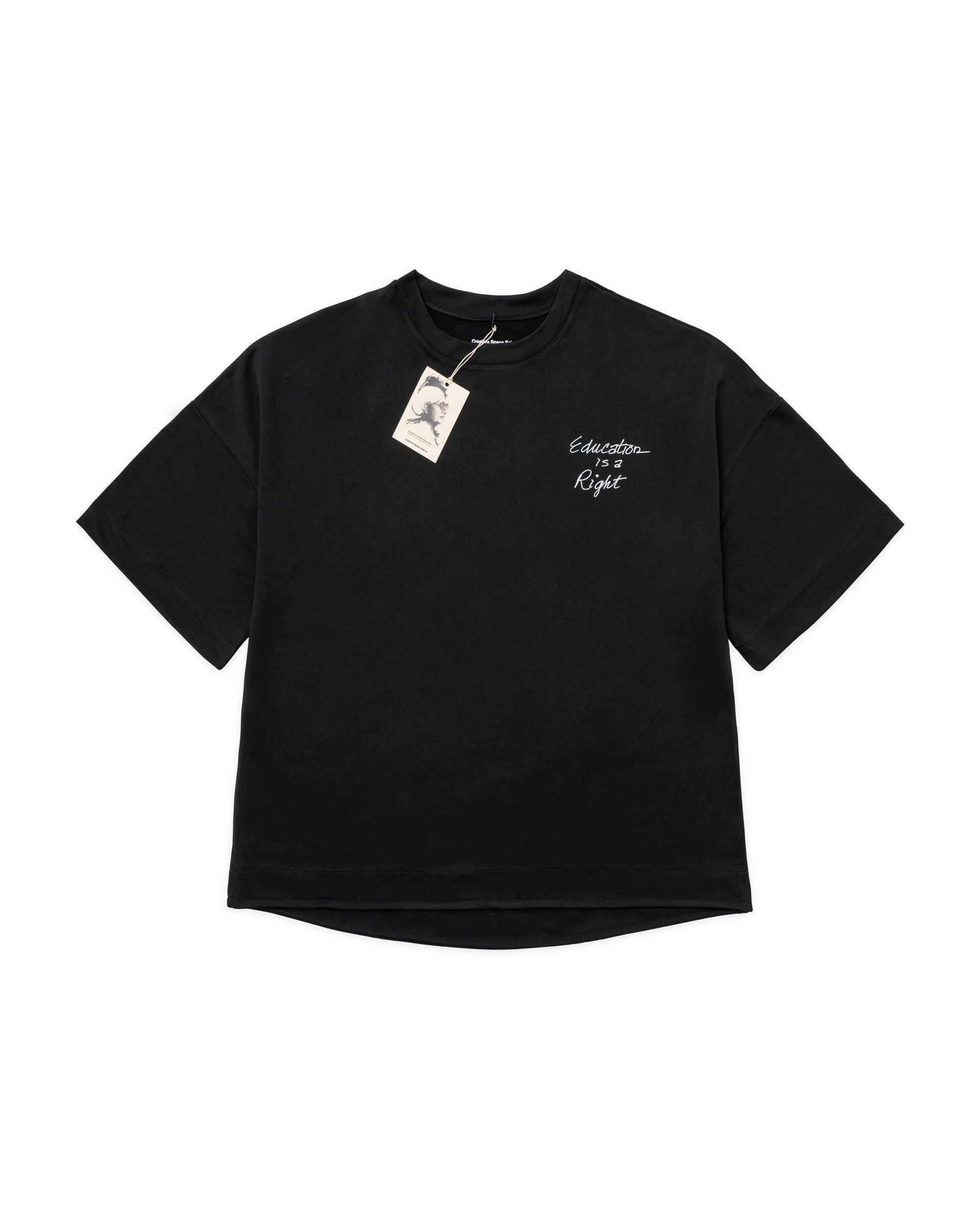 A soft, loose black neoprene t-shirt featuring the handwritten "Education is a Right" print by CSB co-founder Caroline Shlala Simonelli —a tribute to her legacy.