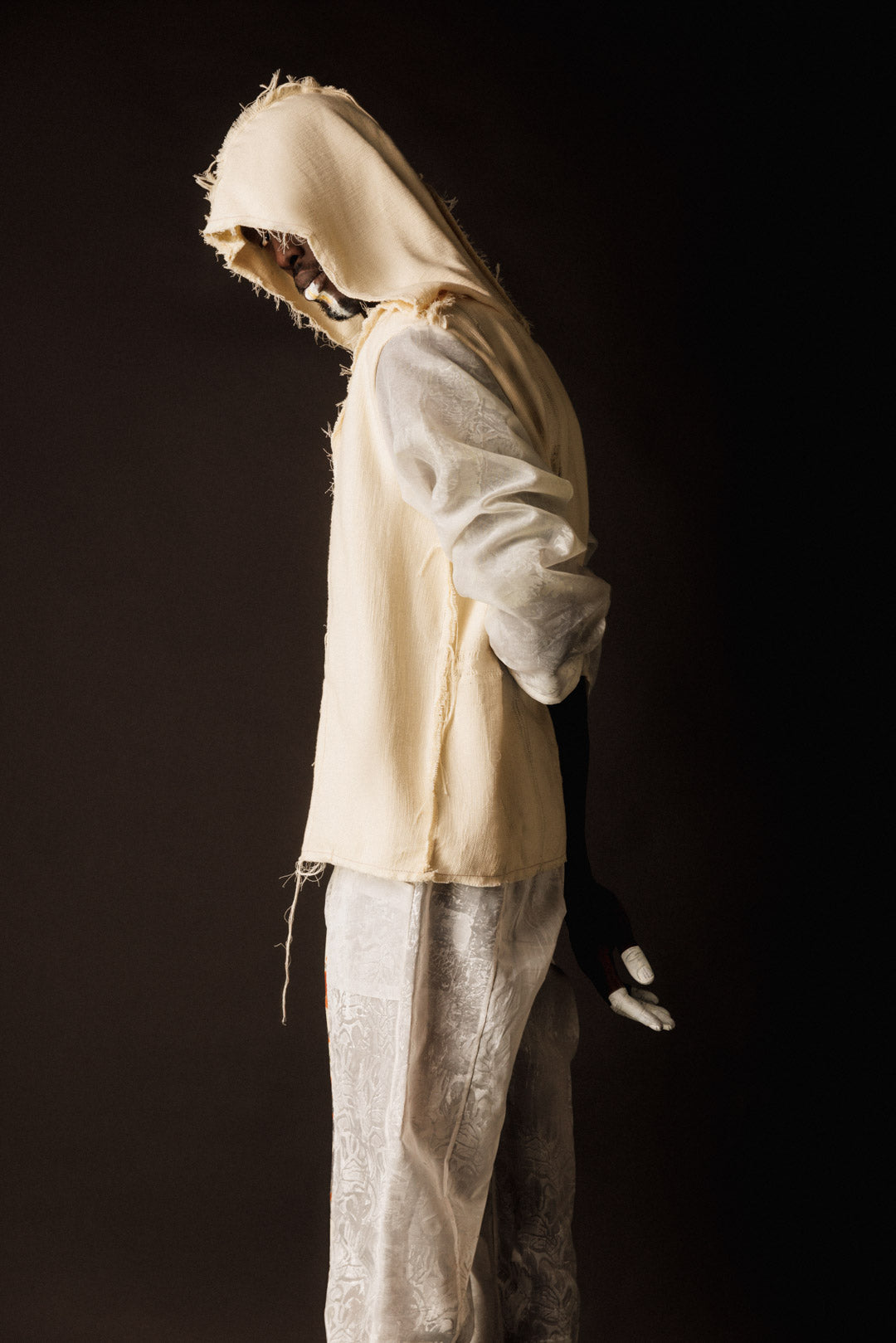 A frayed linen hoodie featuring block printed & organza sleeves.