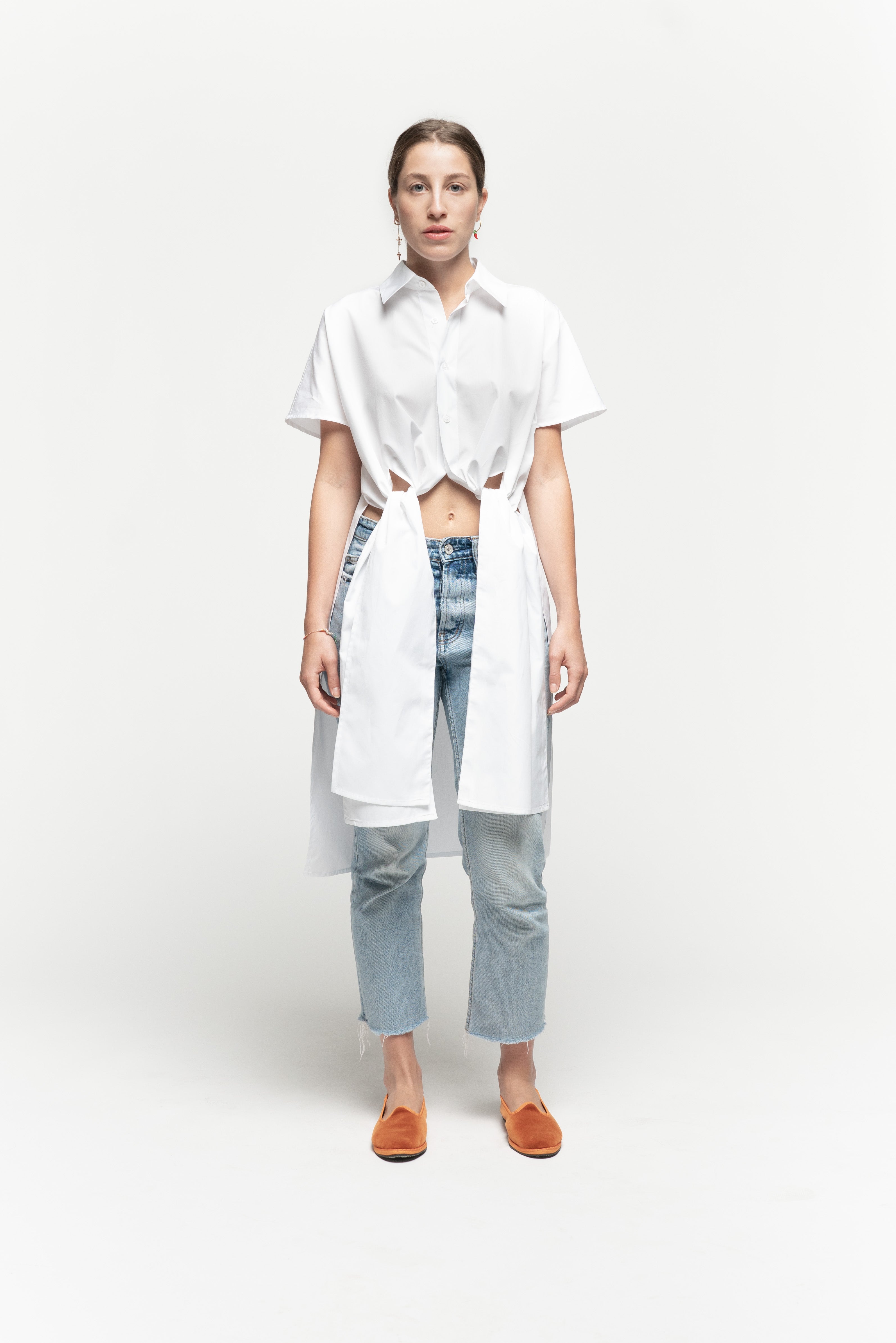 A classic button-up shirt made festive with dangling panels. Can be styled in multiple ways.