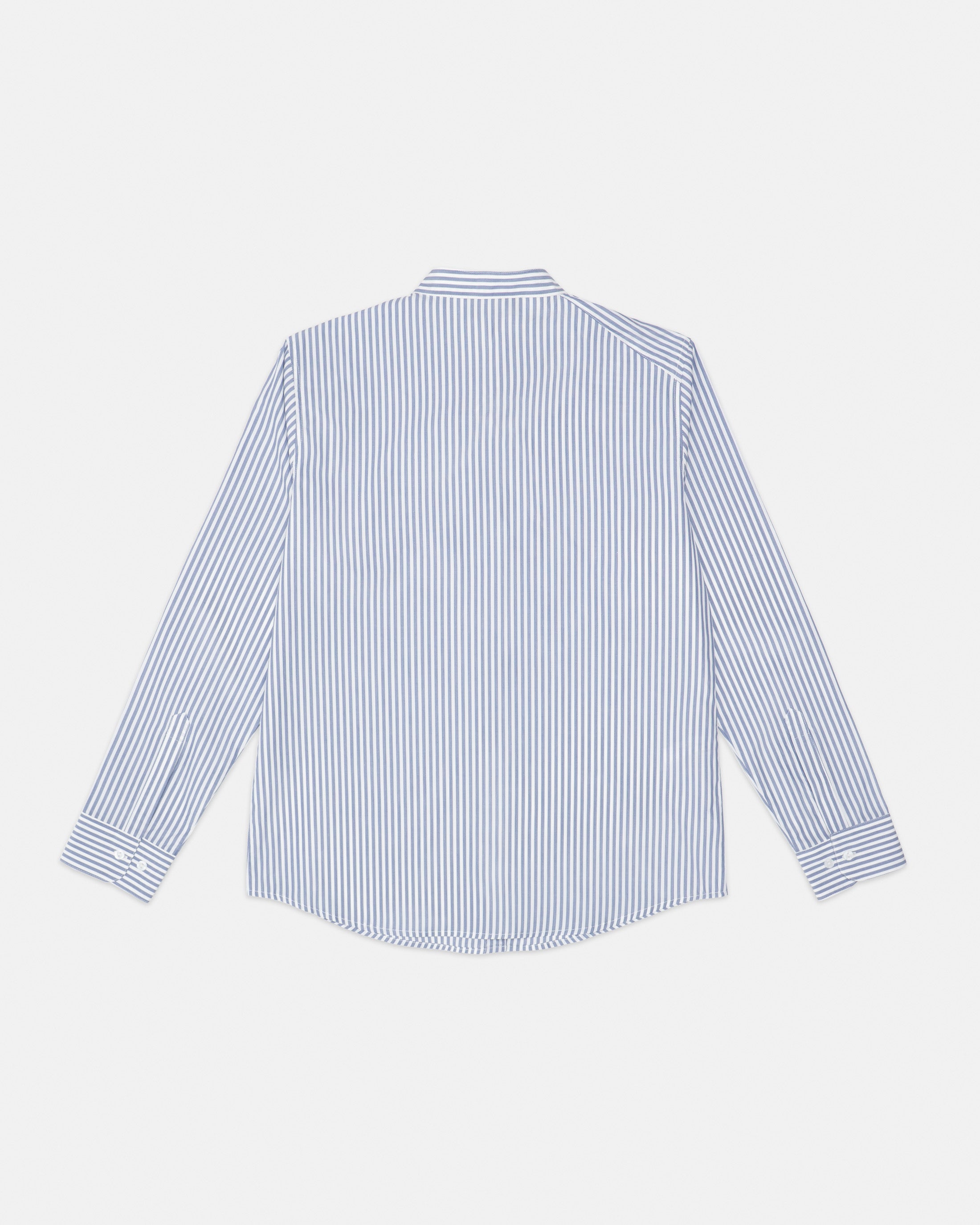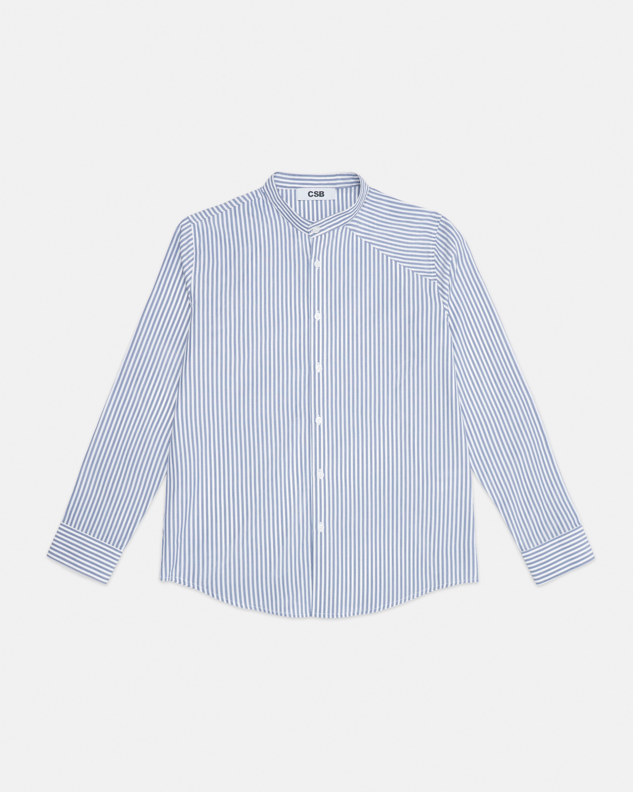 A straight cut cotton shirt with blue and white stripes, a mandarin collar and a side shoulder slit.