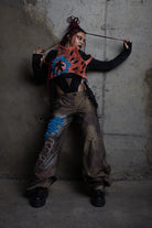 Low-waisted oversized pants cut from bleached gabardine, featuring silkscreen-printed back pockets and hand-painted acrylic artwork layered across the surface. Blue chiffon and embroidered rope are applied at the front, adding movement and dimension through textured, sculptural detailing.