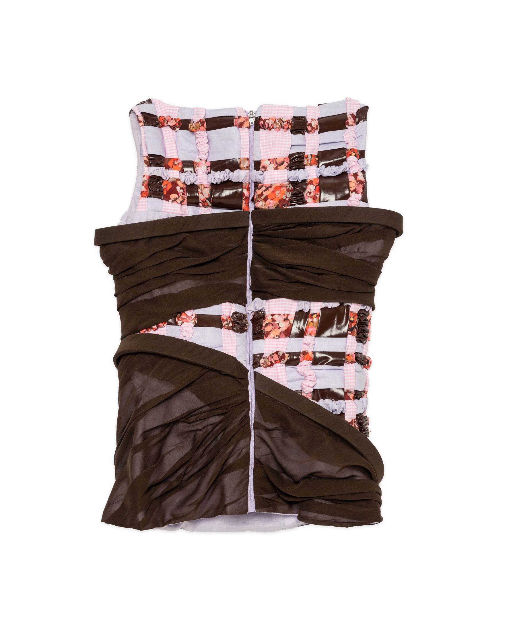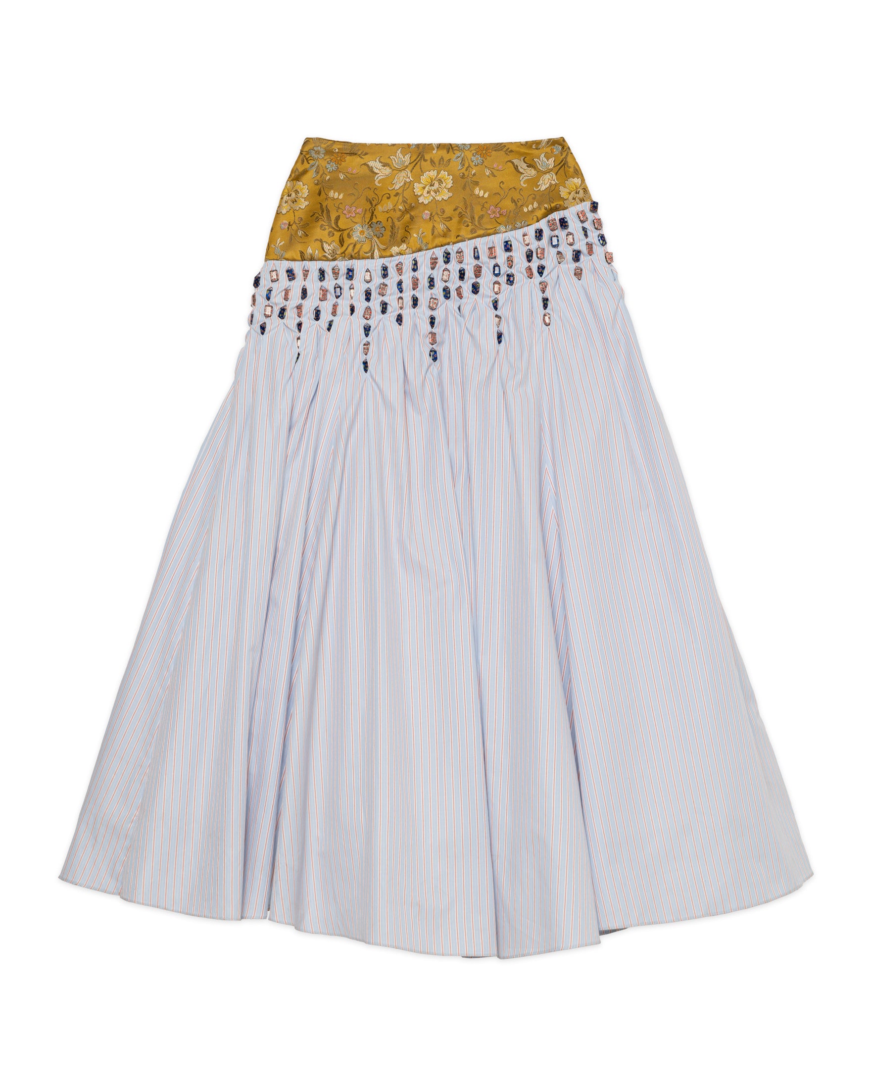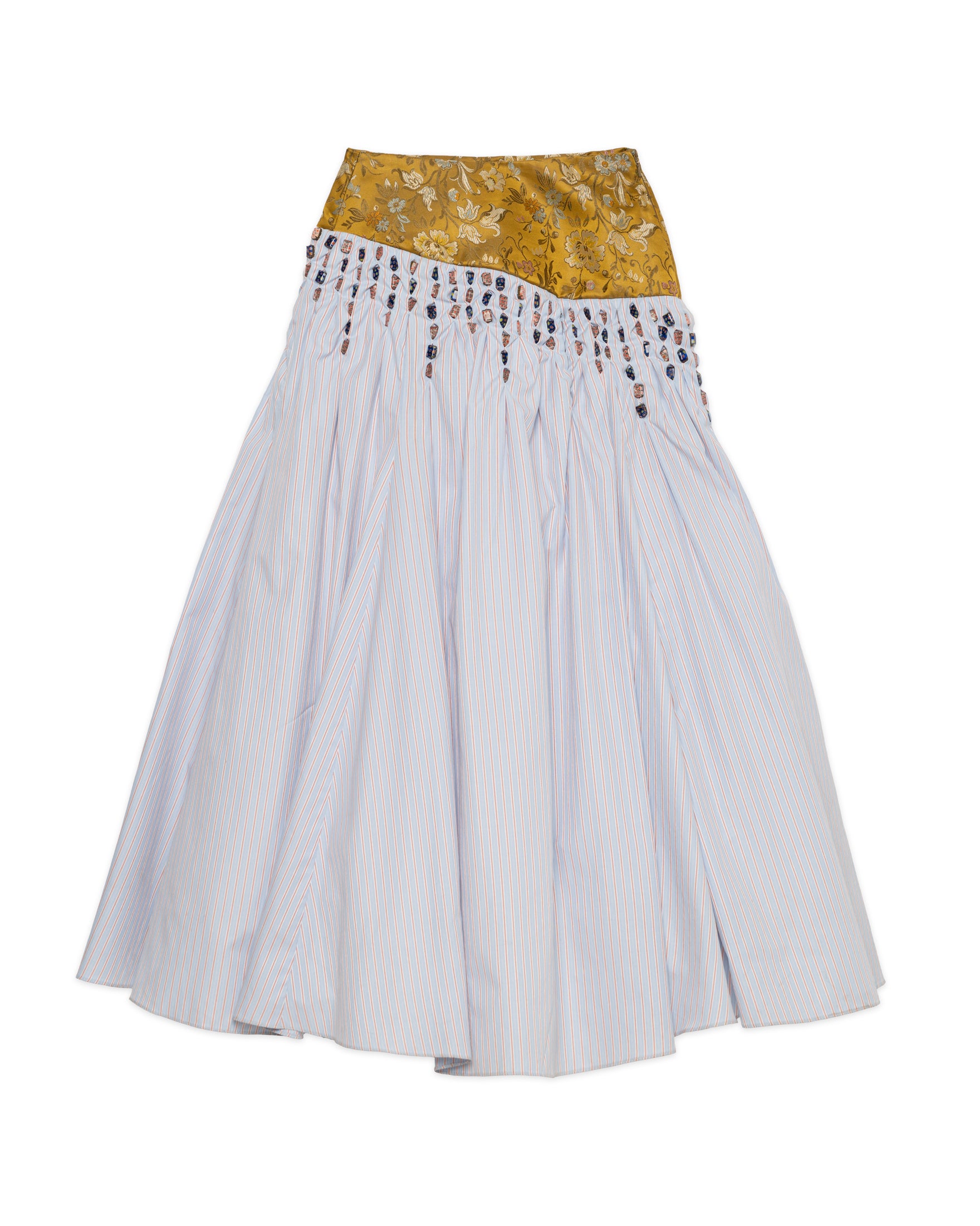 A pleated skirt made from a patchwork of woven fabrics, creating a textured wave effect.