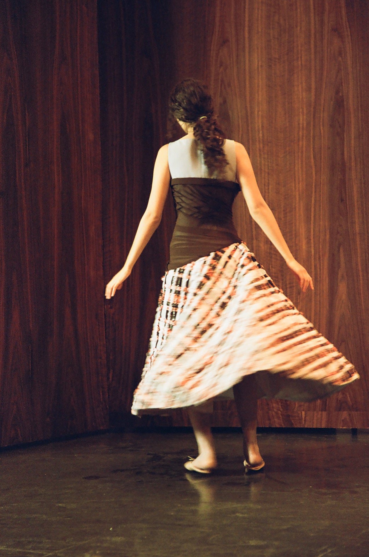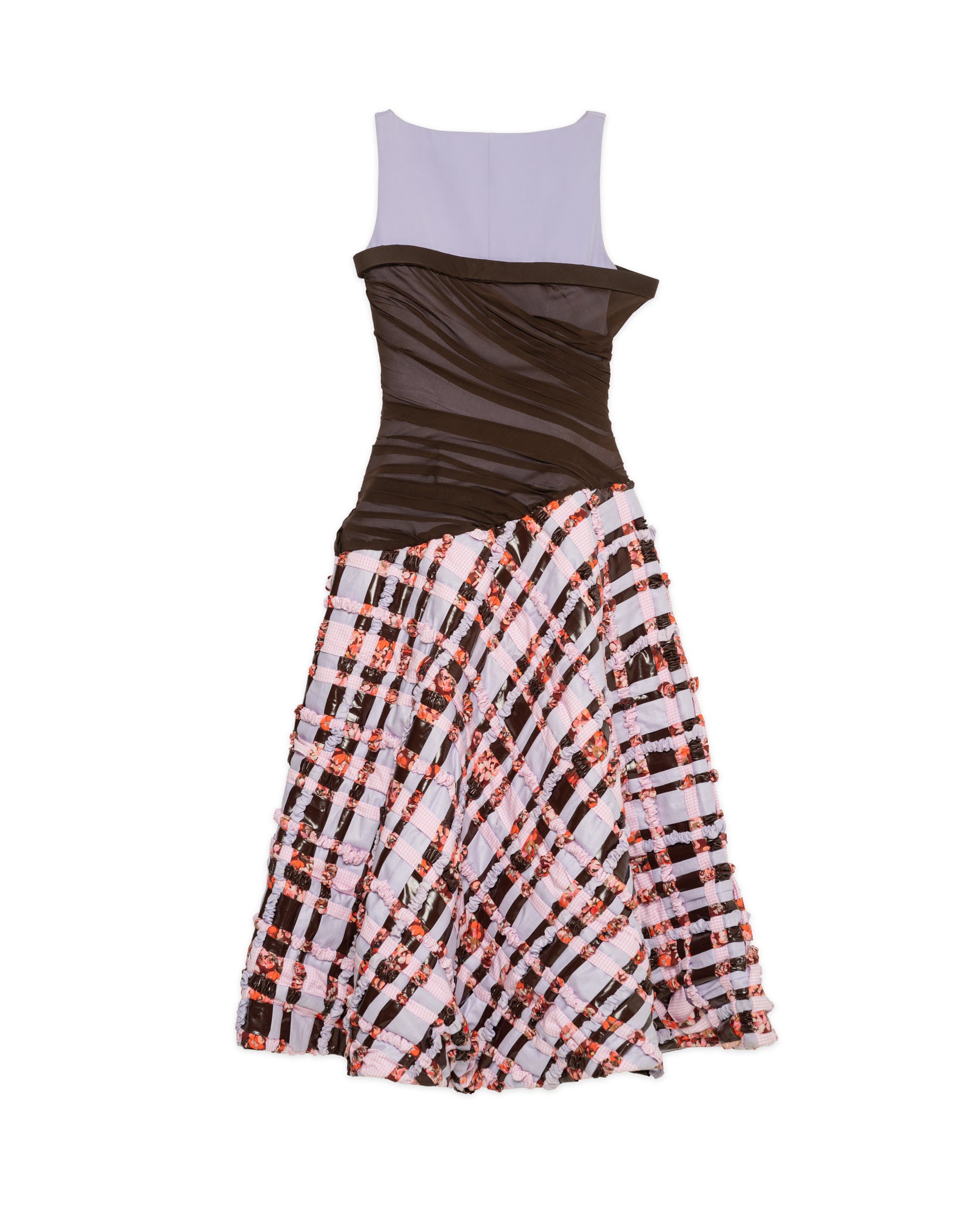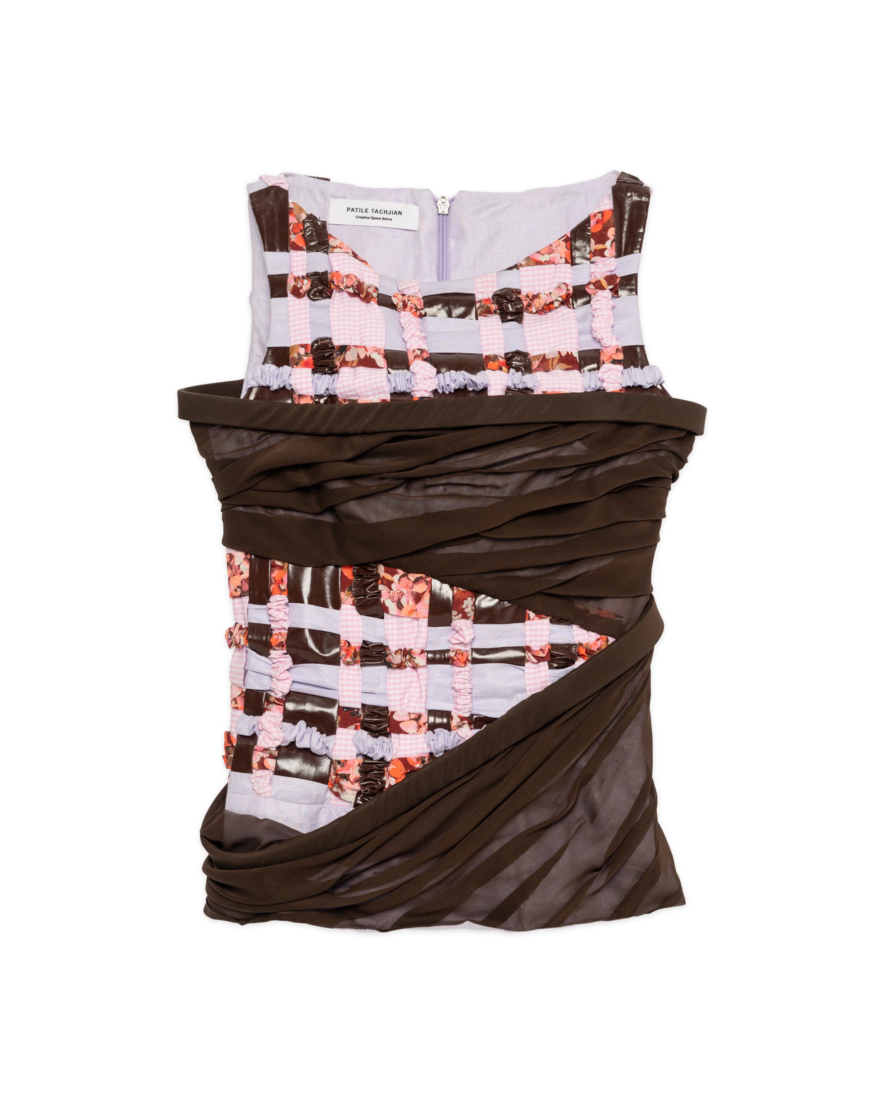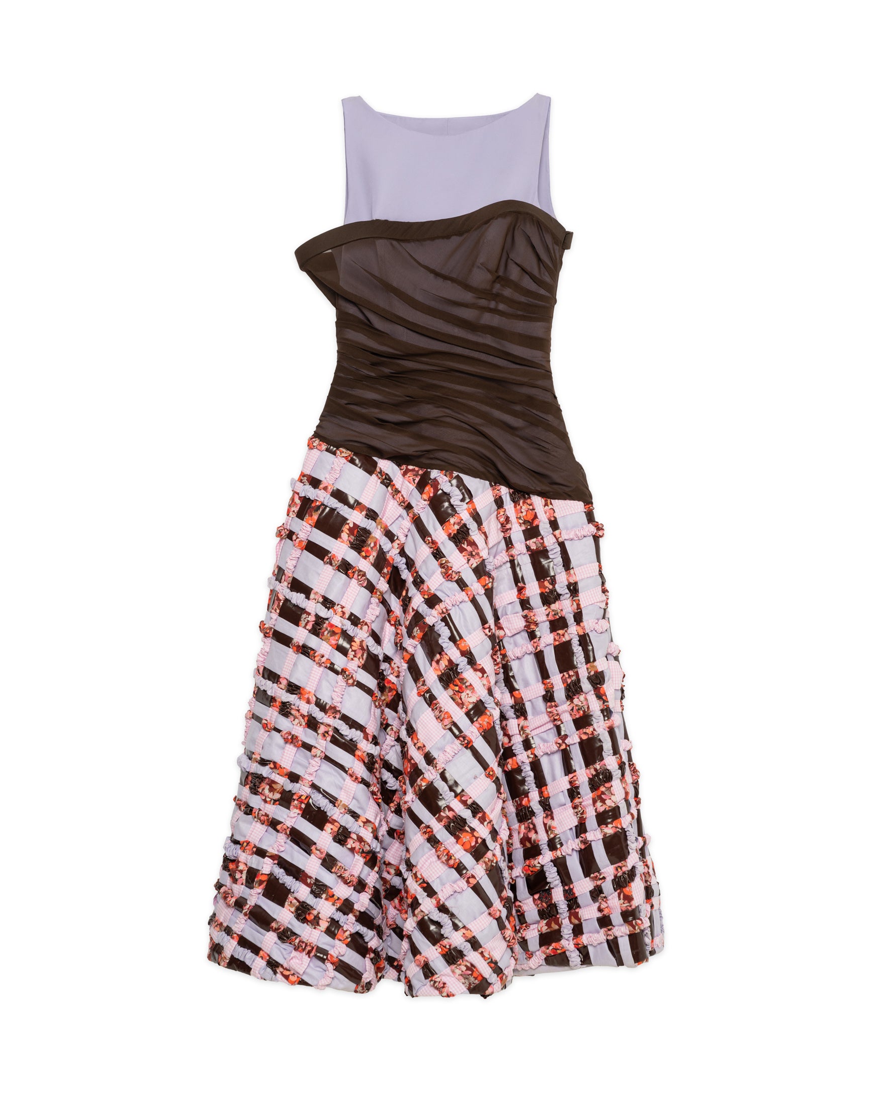 A pleated skirt made from a patchwork of woven fabrics, creating a textured wave effect.