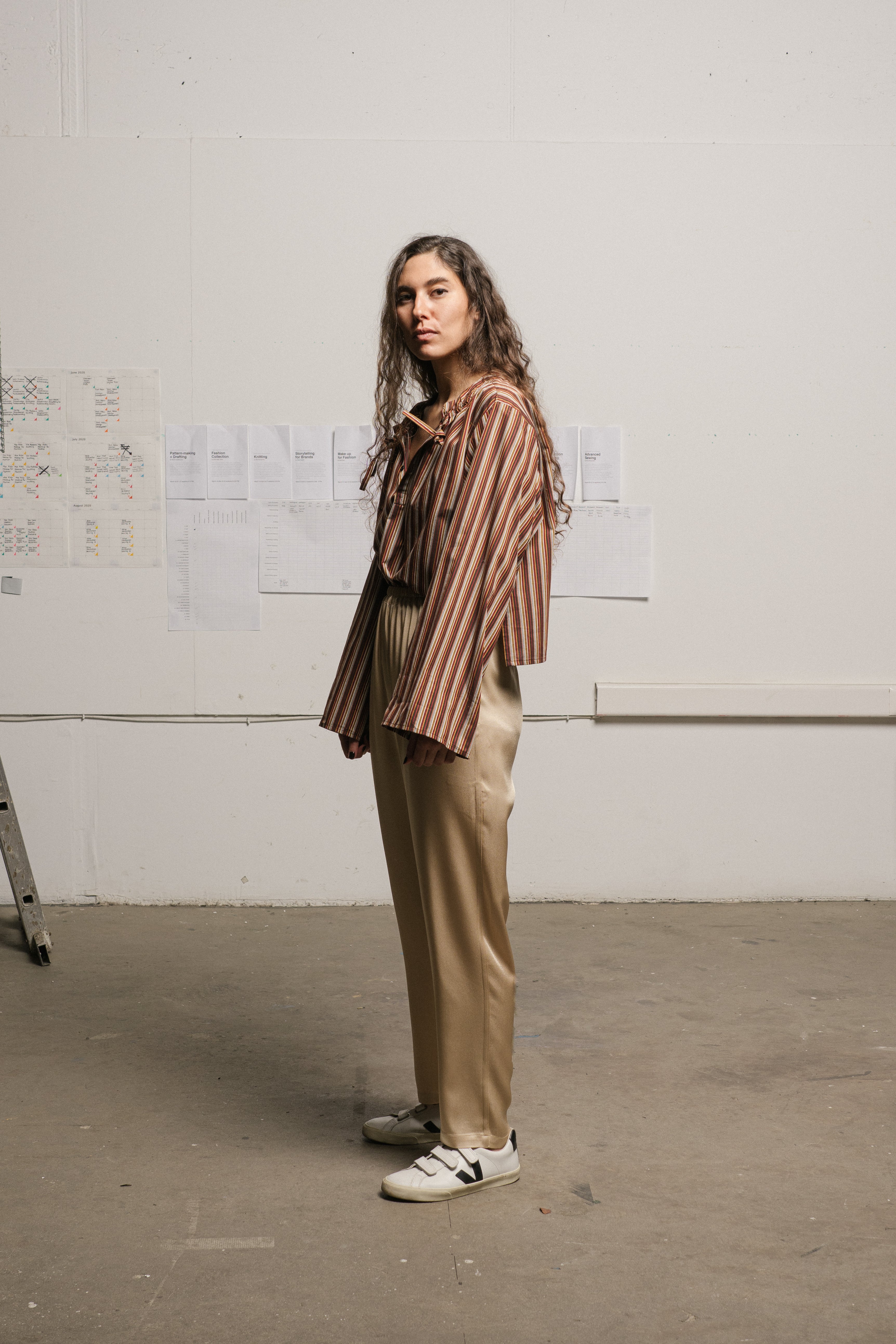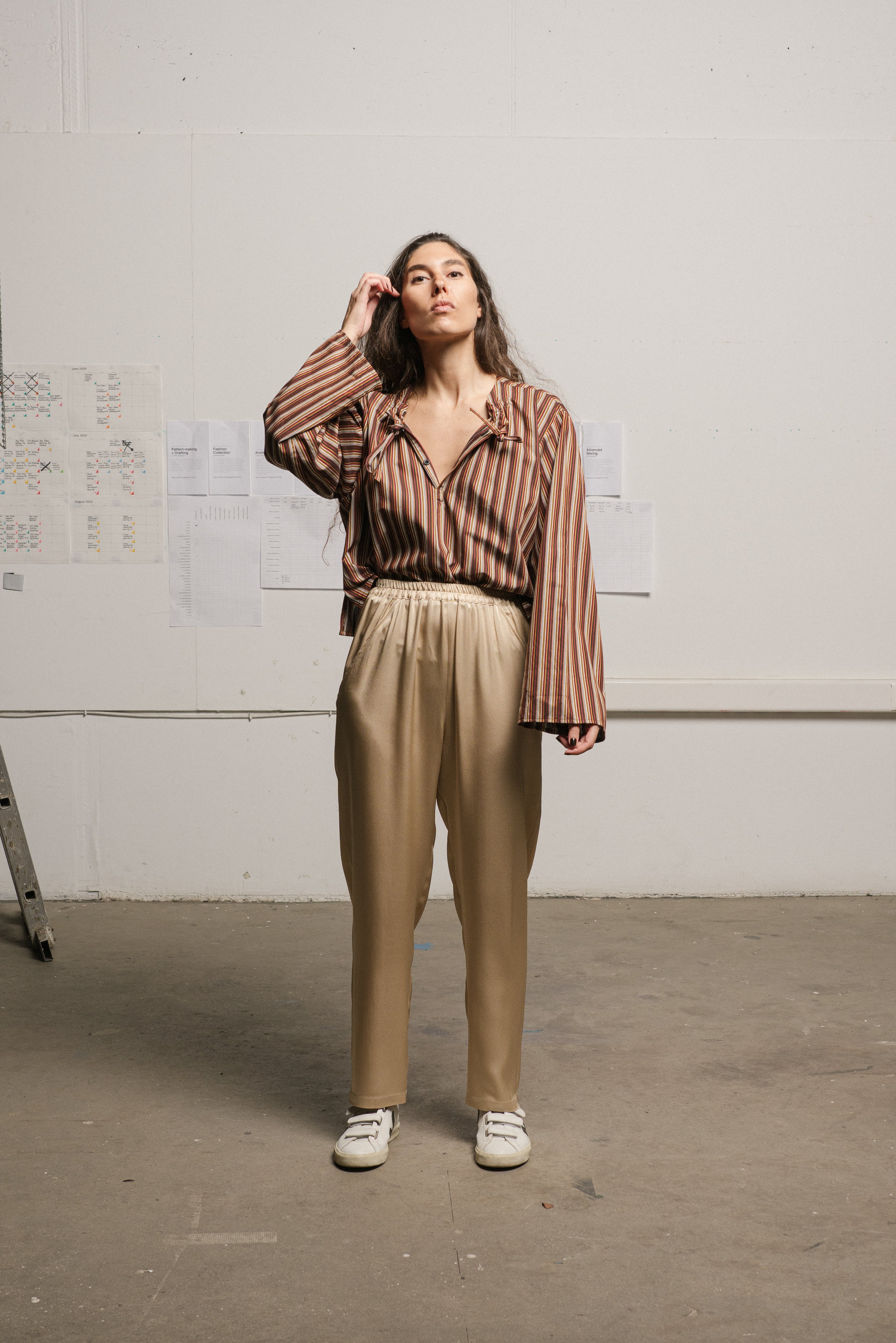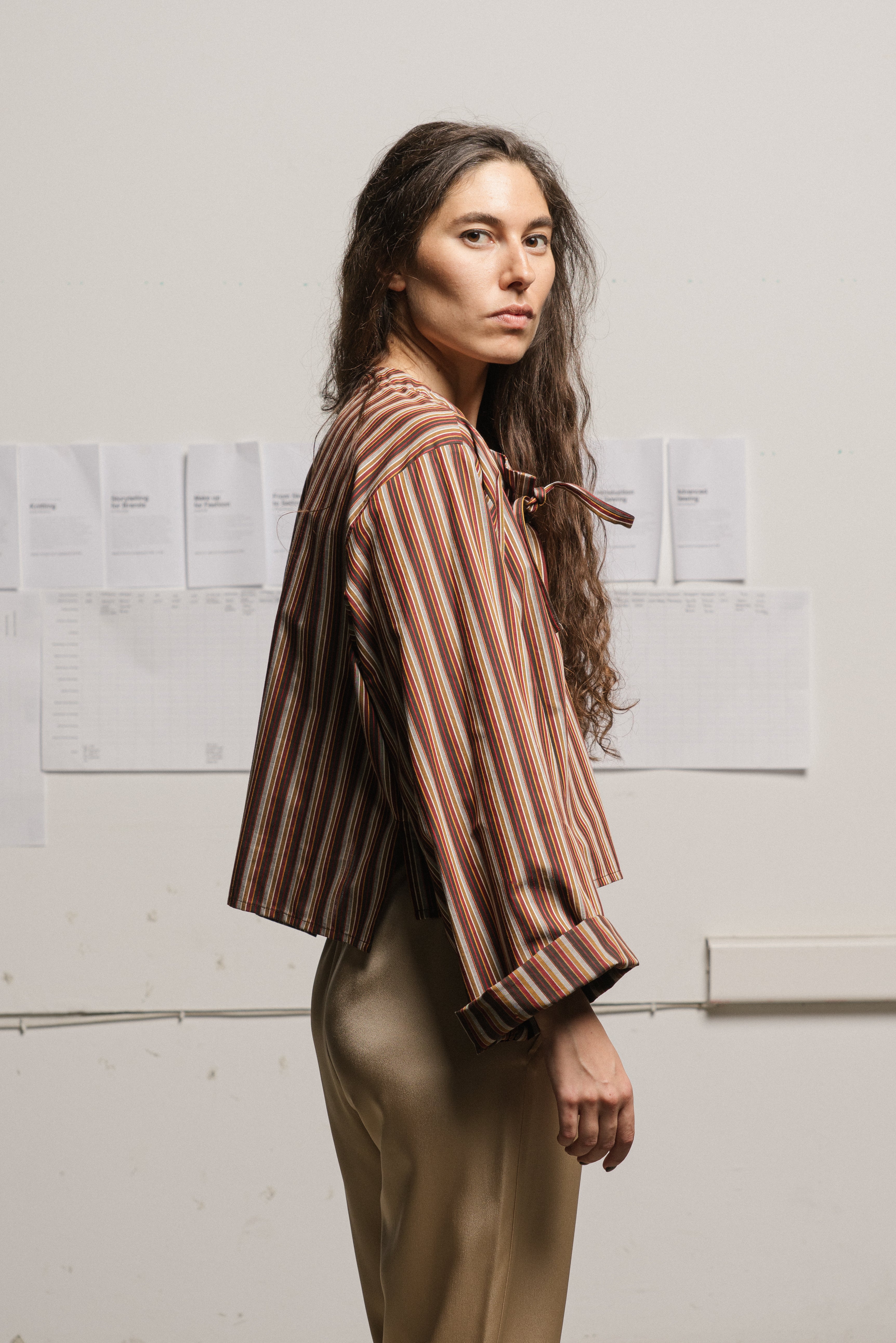 A unique, collarless button-up shirt with wide sleeves in pinstriped cotton with an earthy palette.
