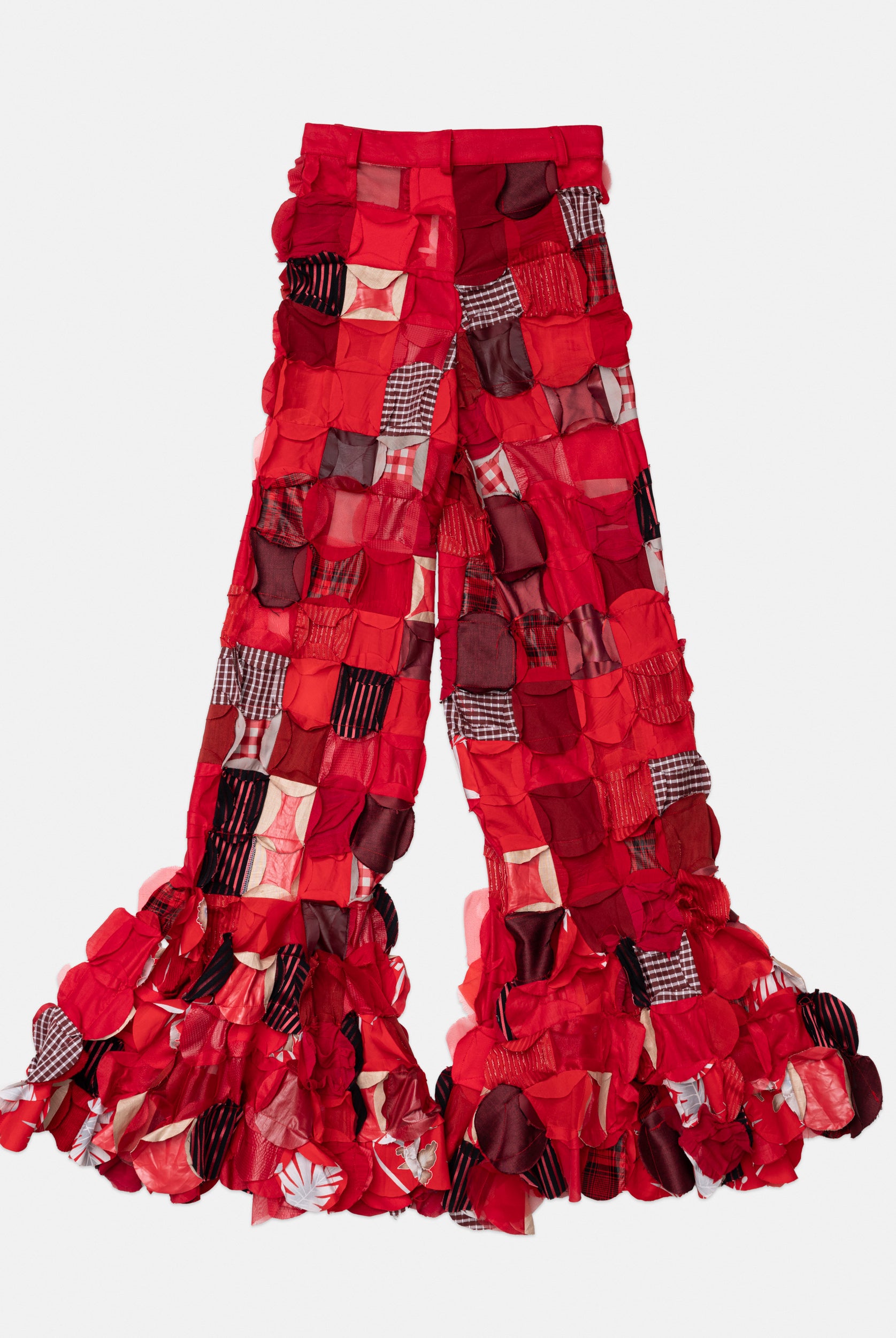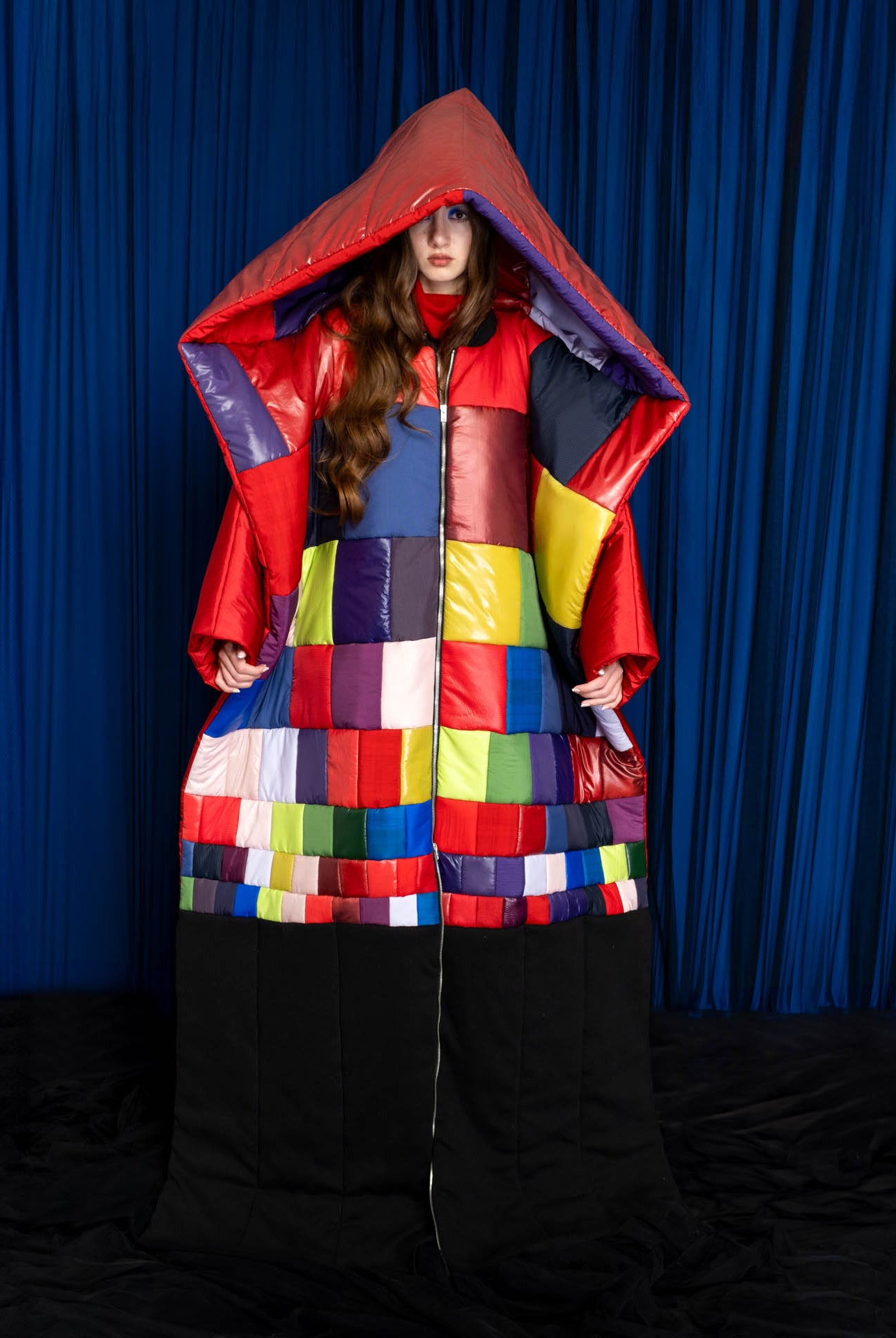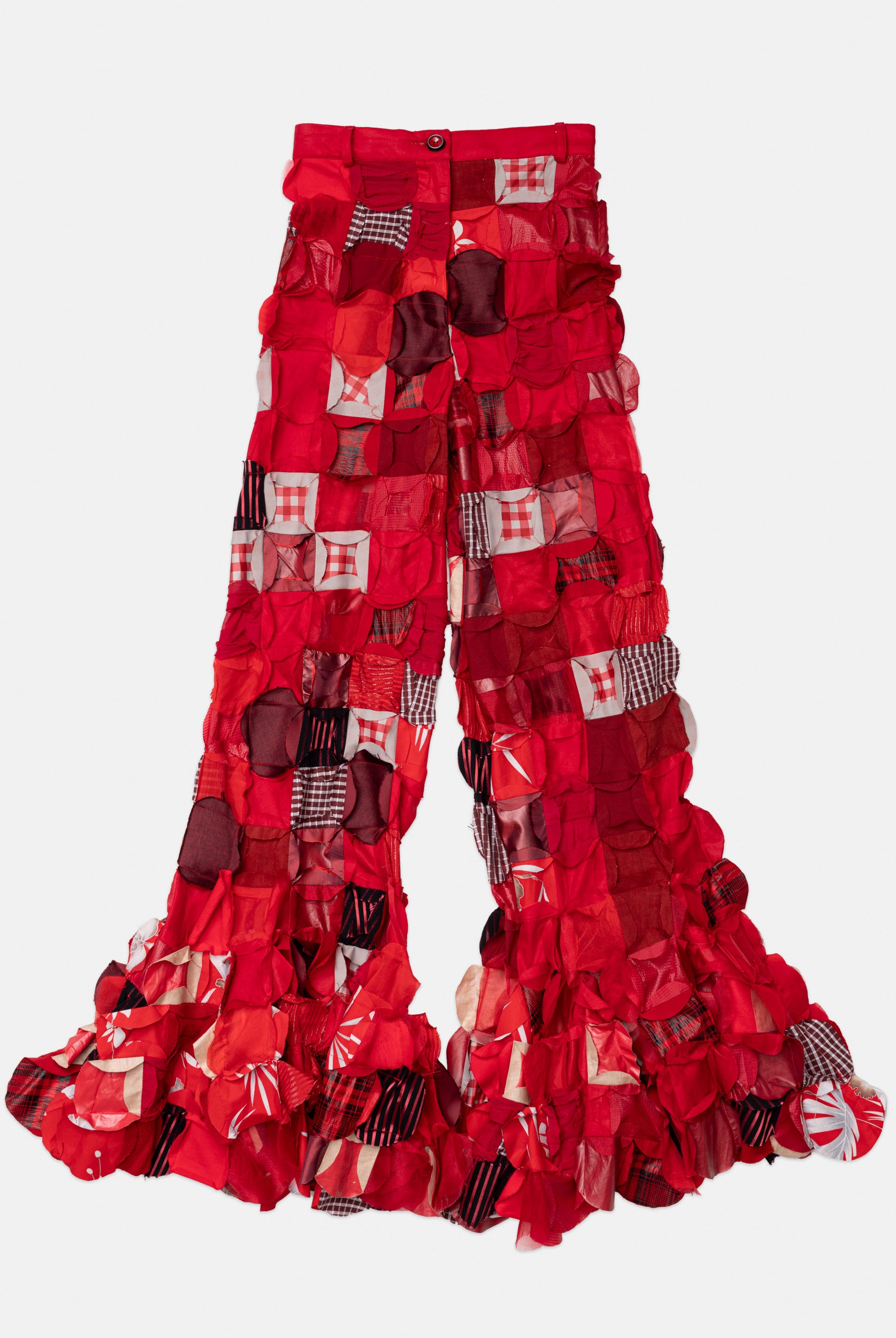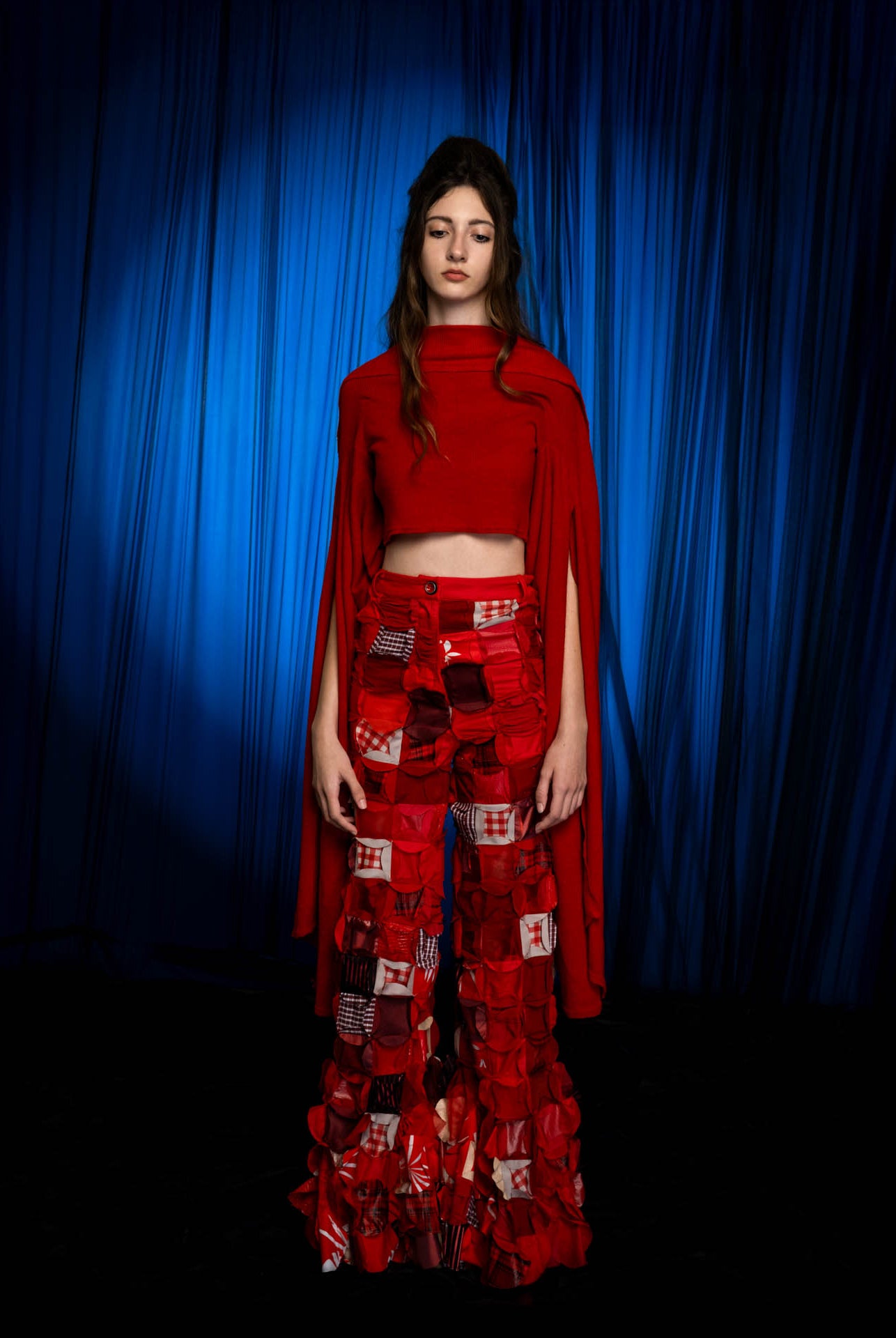 Using techniques such as patchwork, quilting, and draping, this collection serves as an illustration of the concept of motherhood and home, translating into "home-inspired" silhouettes and feminine geometric structures in a palette of deep, potent colors dominated by red.