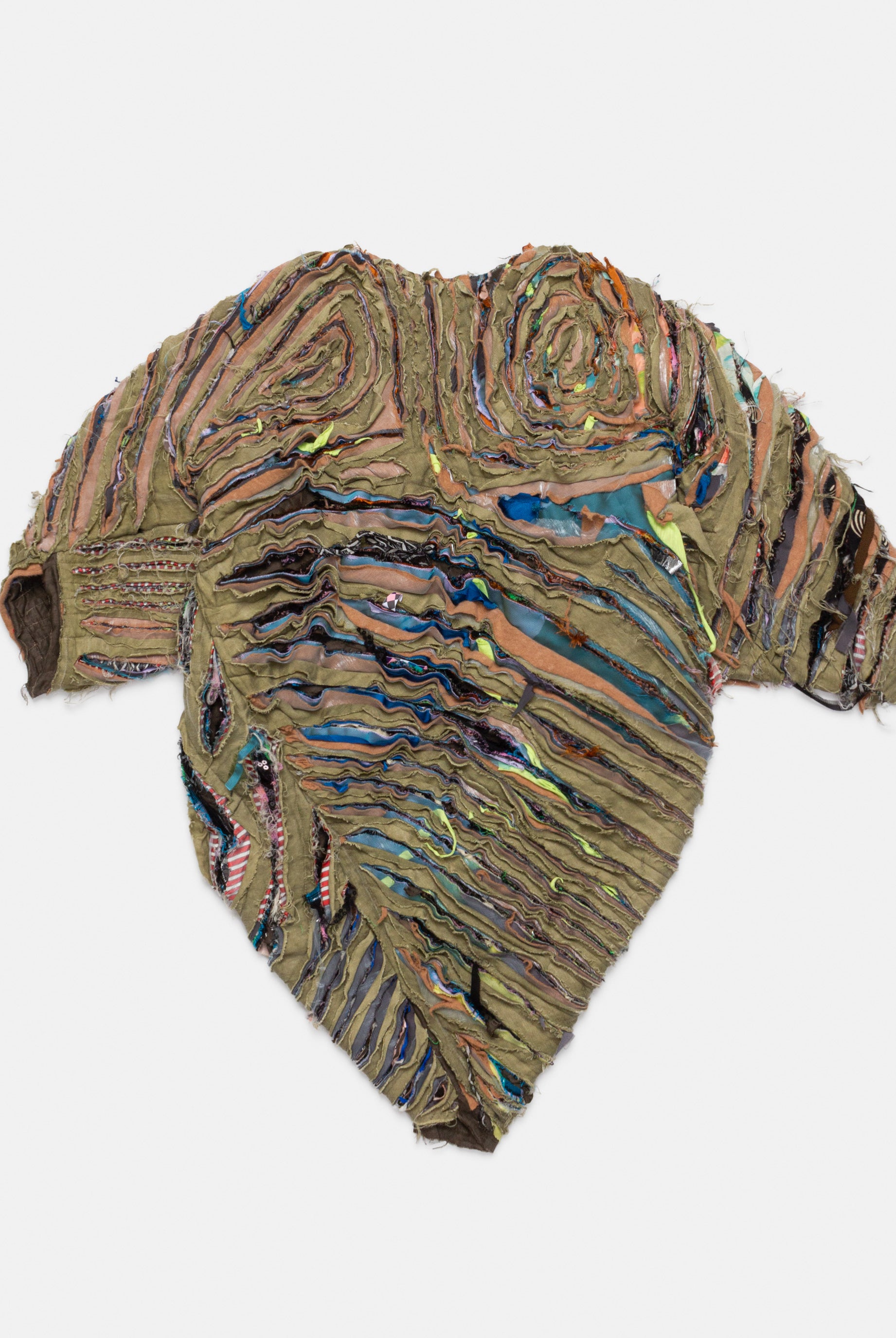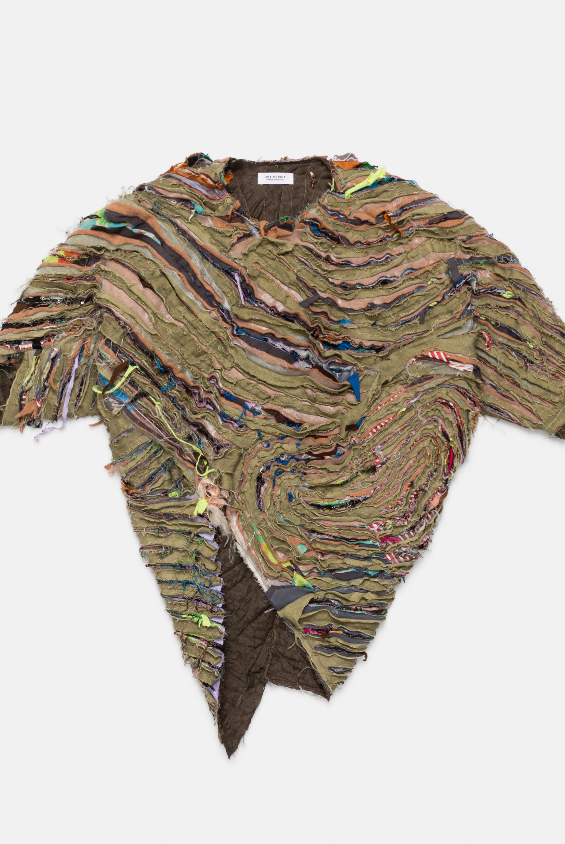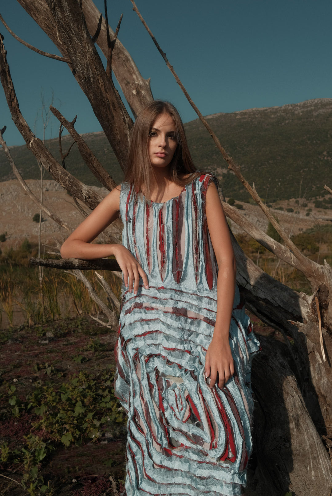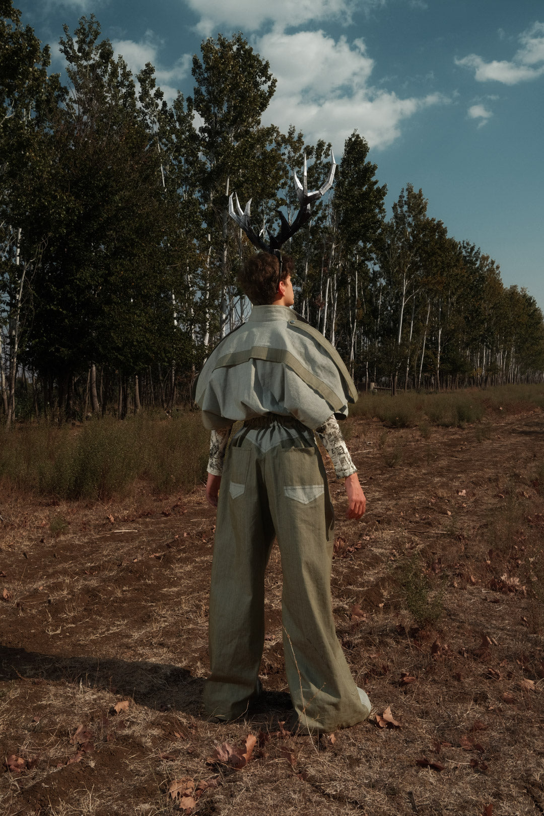 Feral Hearts is a collection that celebrates the wilderness and animal instinct that reside in all humans, and the adventures that teach one to be in touch with the magic of being. Prominent in the collection is the technique of slashing, which produces a heavy, raw effect, like ravaged fur or wild animal skins. The color story is earthy, scattered with pop colors, reflecting light in the darkness, hope and wonder. A block print reminiscent of animal silhouettes also runs throughout the collection.