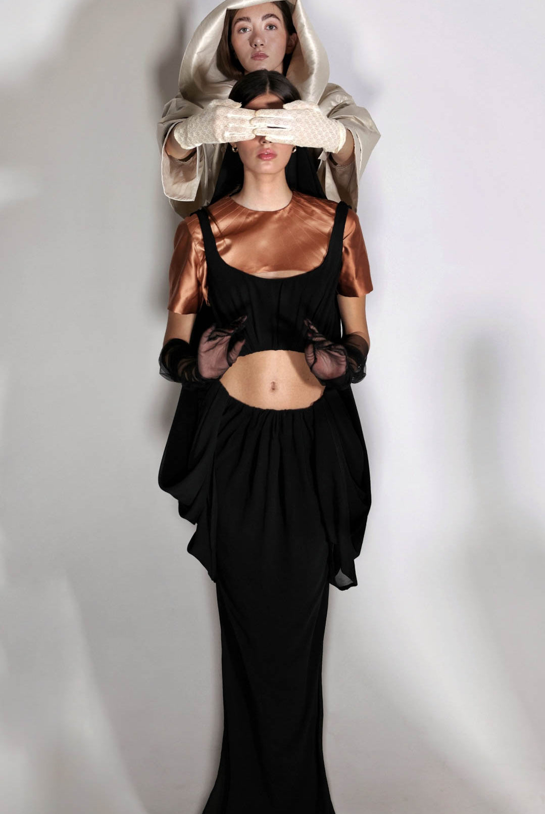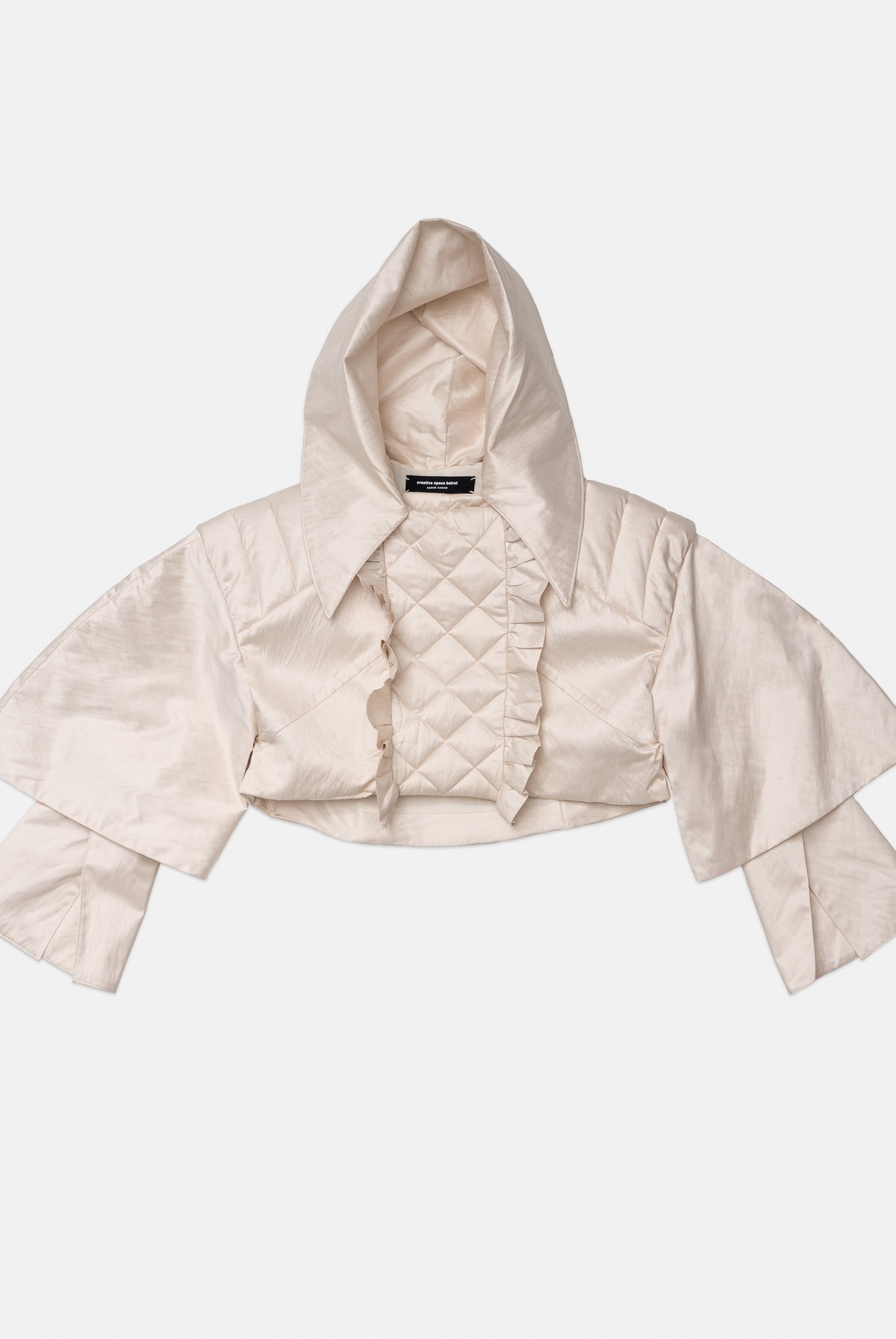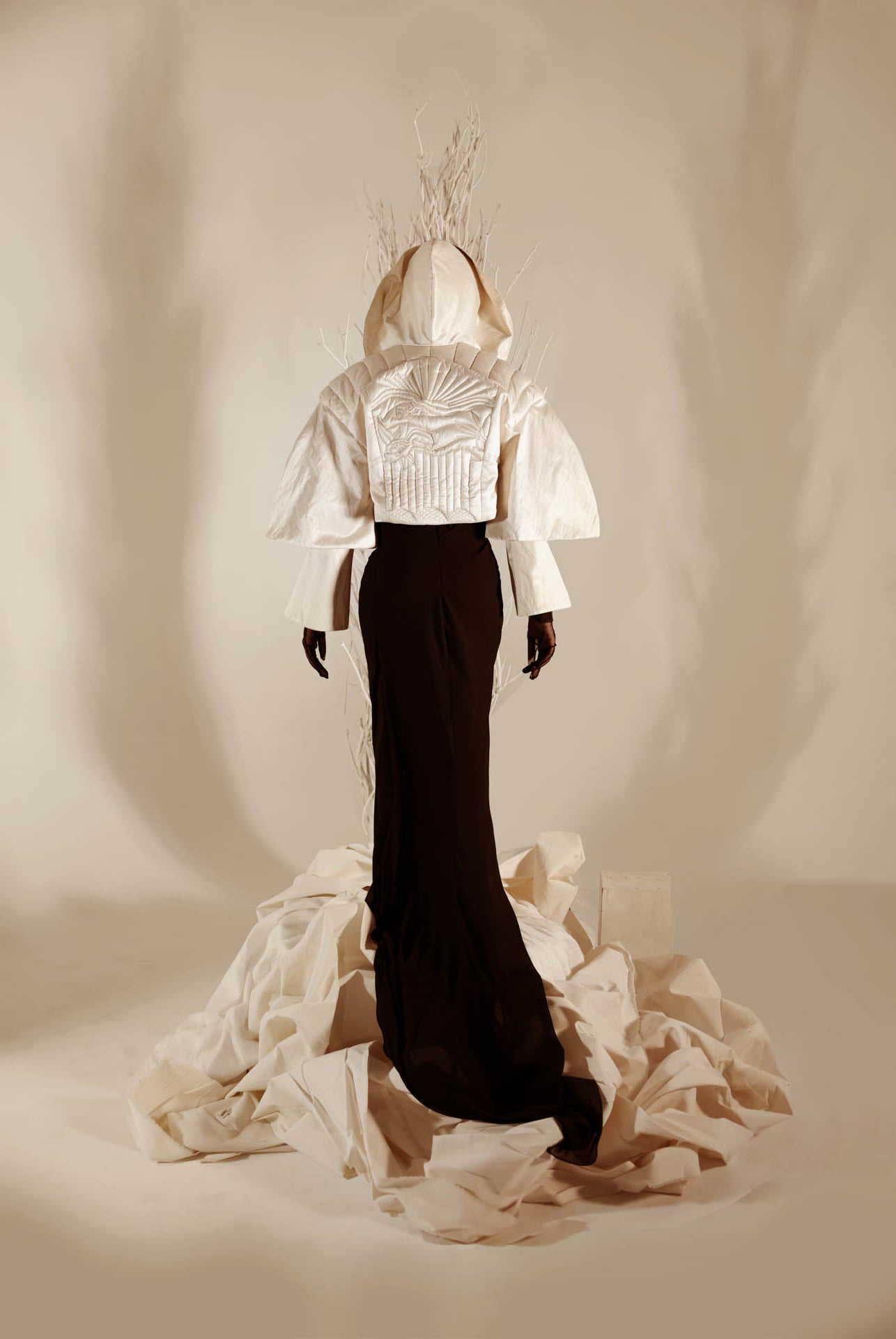 Derived from Pedro Almodovar's "Dark Habits" film, this collection explores monastic attire through shape, volume, and colors. Featuring a Madonesque silhouette with sheer fabric draping and halo-like stitching, the designs incorporate vintage bedding quilting techniques prevalent in the movie scenes. Elevating streetwear to a luxurious level, the pieces showcase satiny fabrics and voluminous cuts, enhancing the overall aesthetic.