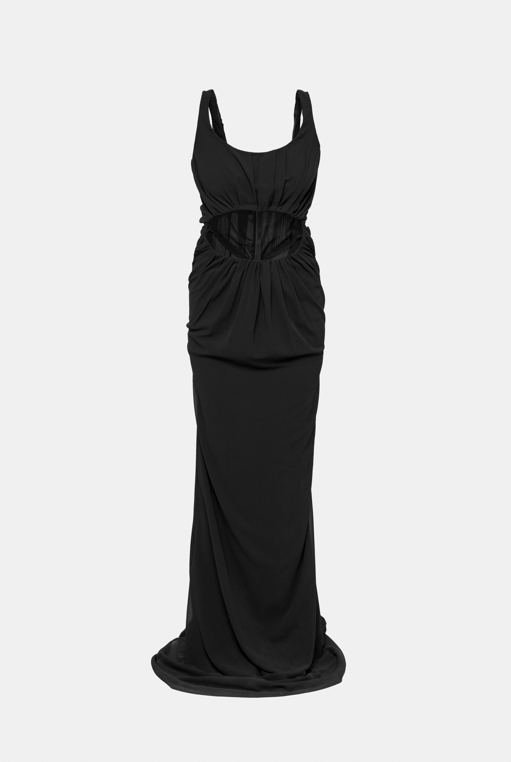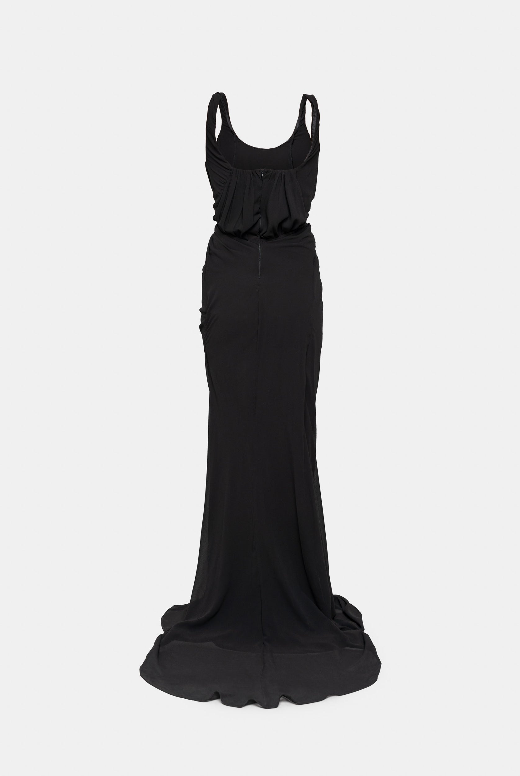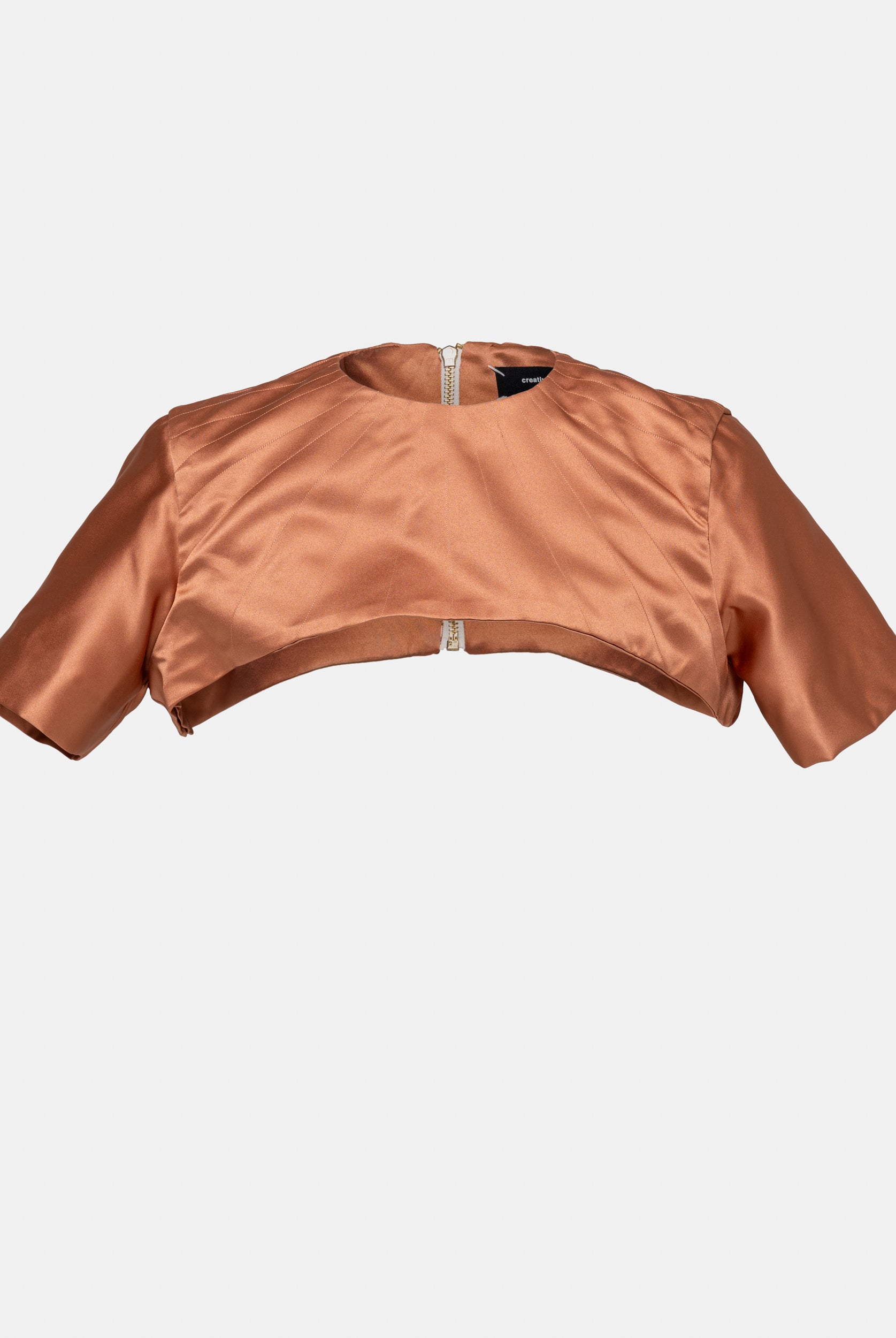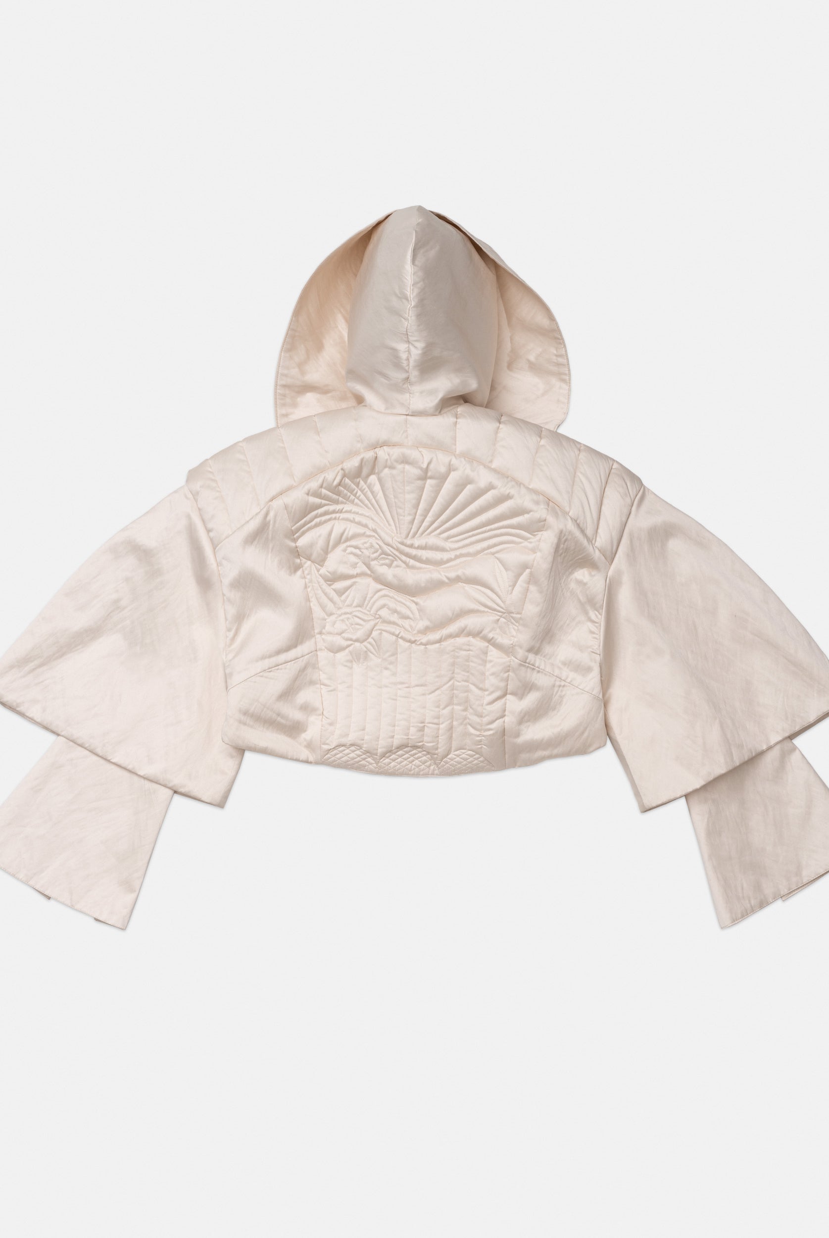 Derived from Pedro Almodovar's "Dark Habits" film, this collection explores monastic attire through shape, volume, and colors. Featuring a Madonesque silhouette with sheer fabric draping and halo-like stitching, the designs incorporate vintage bedding quilting techniques prevalent in the movie scenes. Elevating streetwear to a luxurious level, the pieces showcase satiny fabrics and voluminous cuts, enhancing the overall aesthetic.
