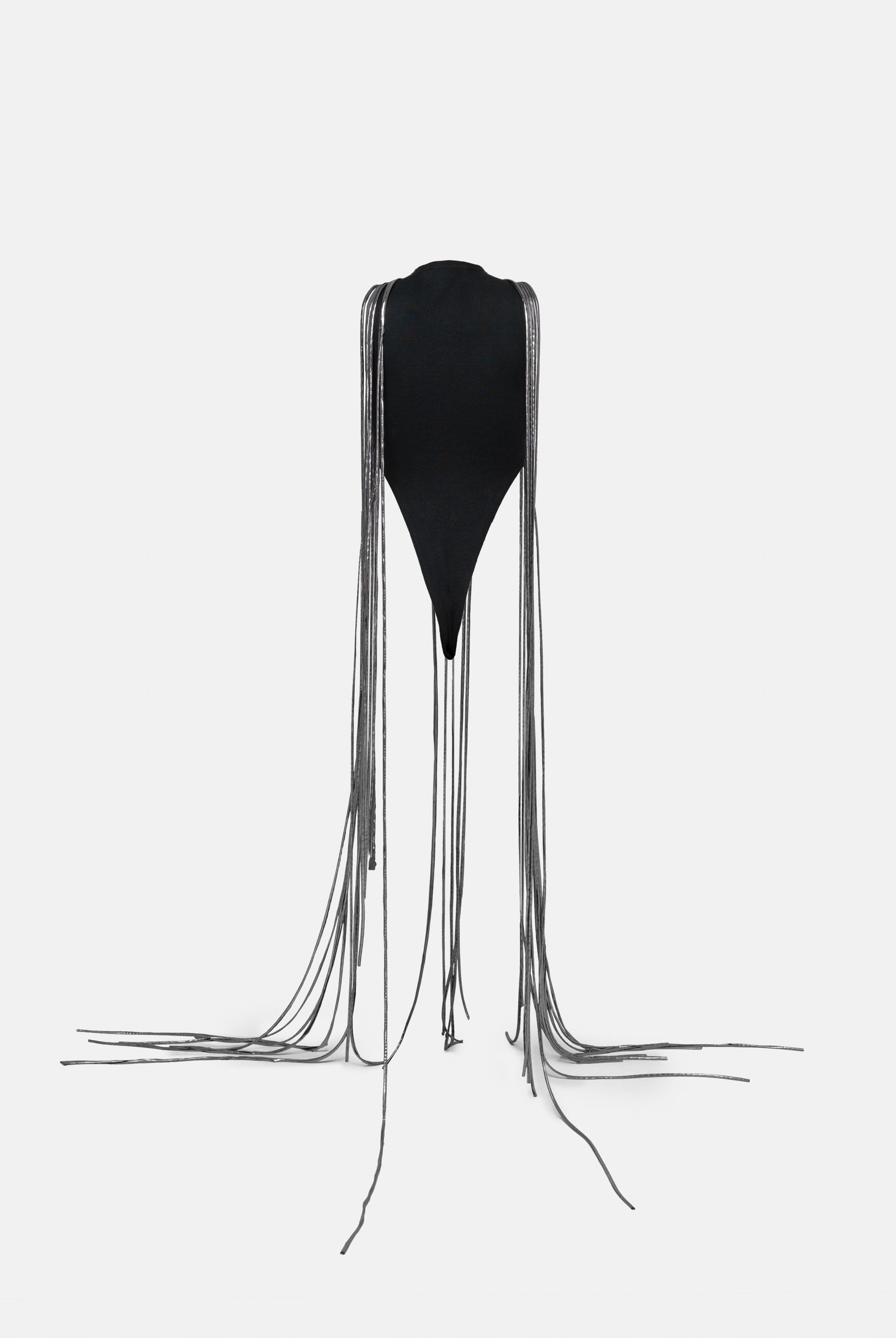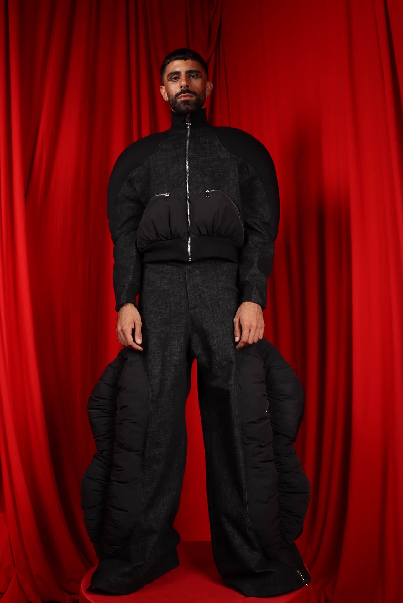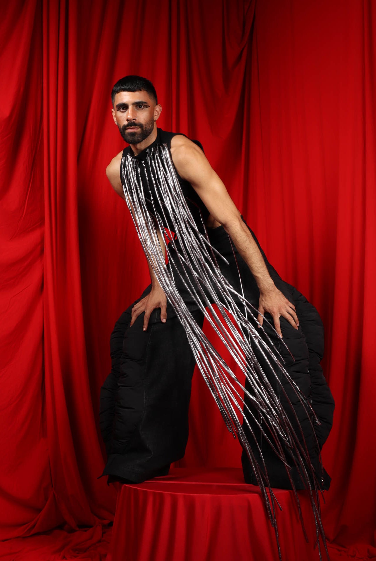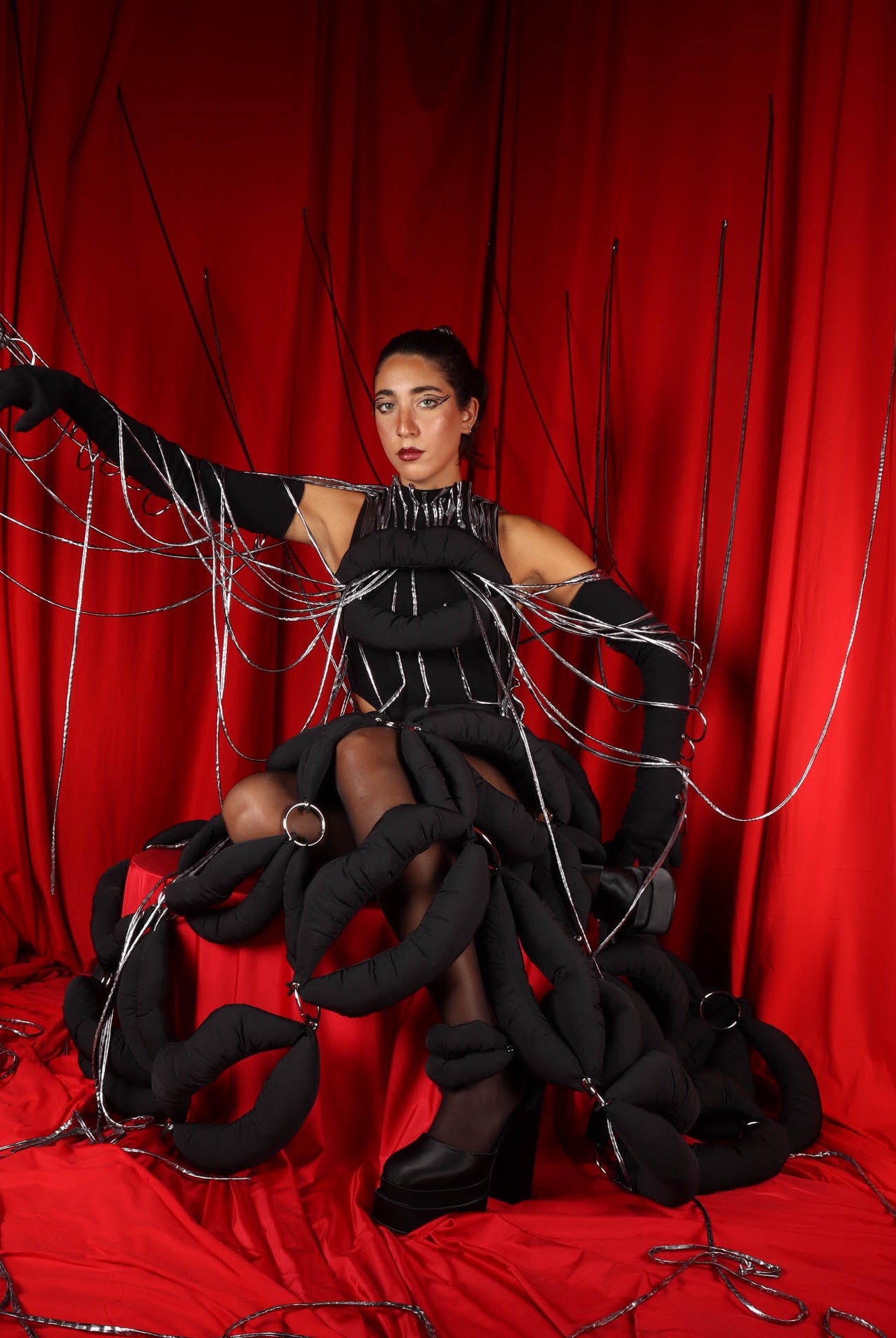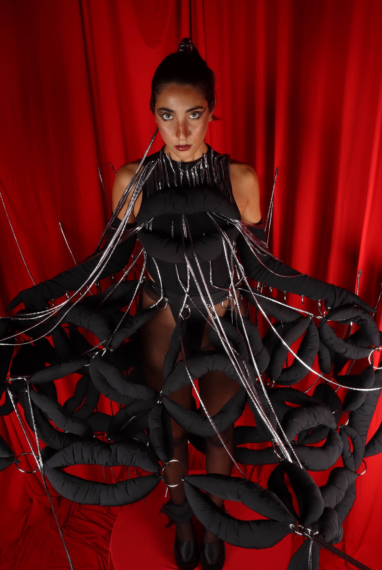 Inspired by Pedro Almodóvar's iconic movie "High Heels," this collection, titled ‘Whelve’ delves into the notion that attachments function as personal prisons, ensnaring individuals in a web of unresolved traumas and emotions. These attachments have the potential to hinder progress and impede one's journey forward in life. With a dominantly black color palette, techniques include garments puffed with stuffing and the use of jersey strips and metal hoops.