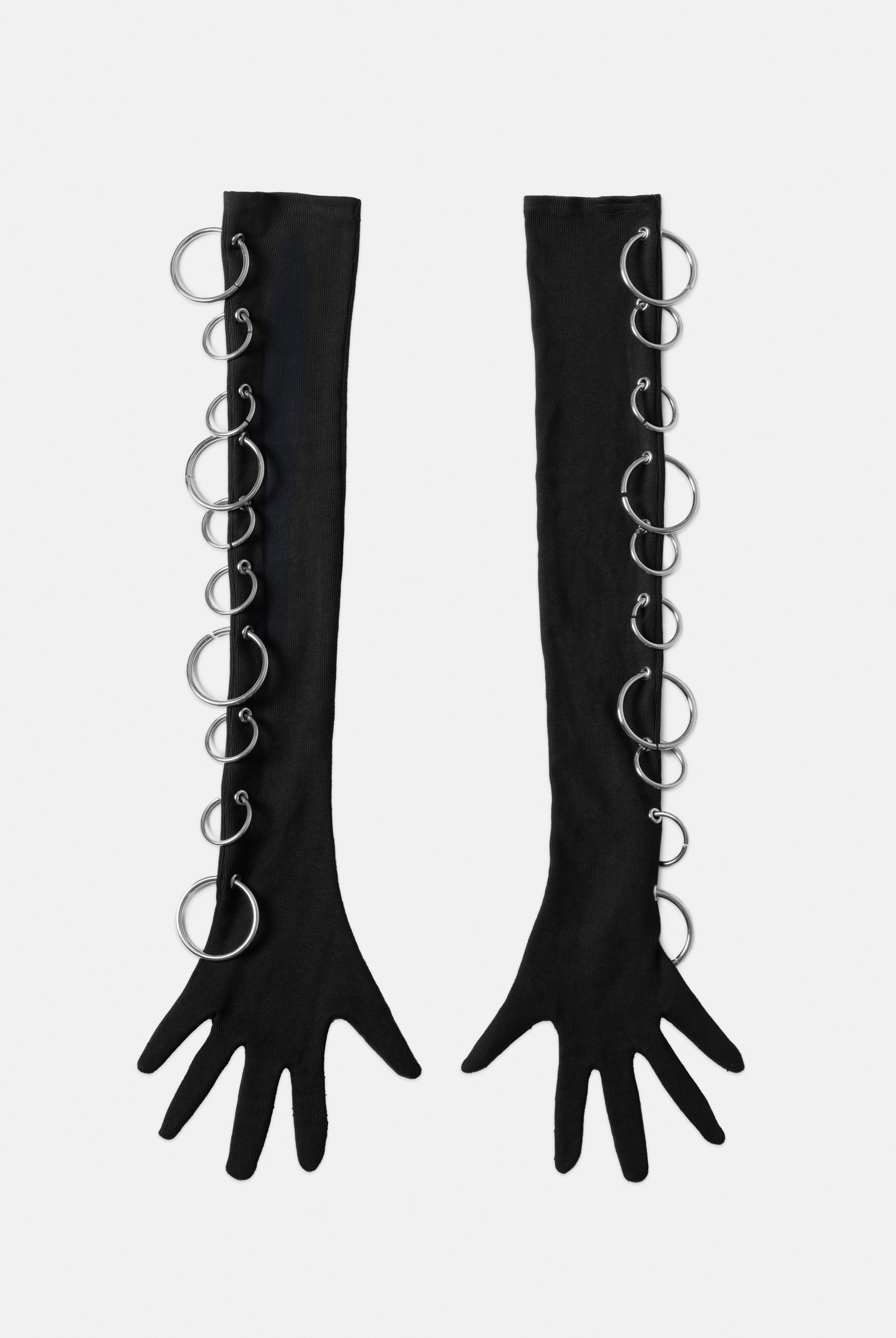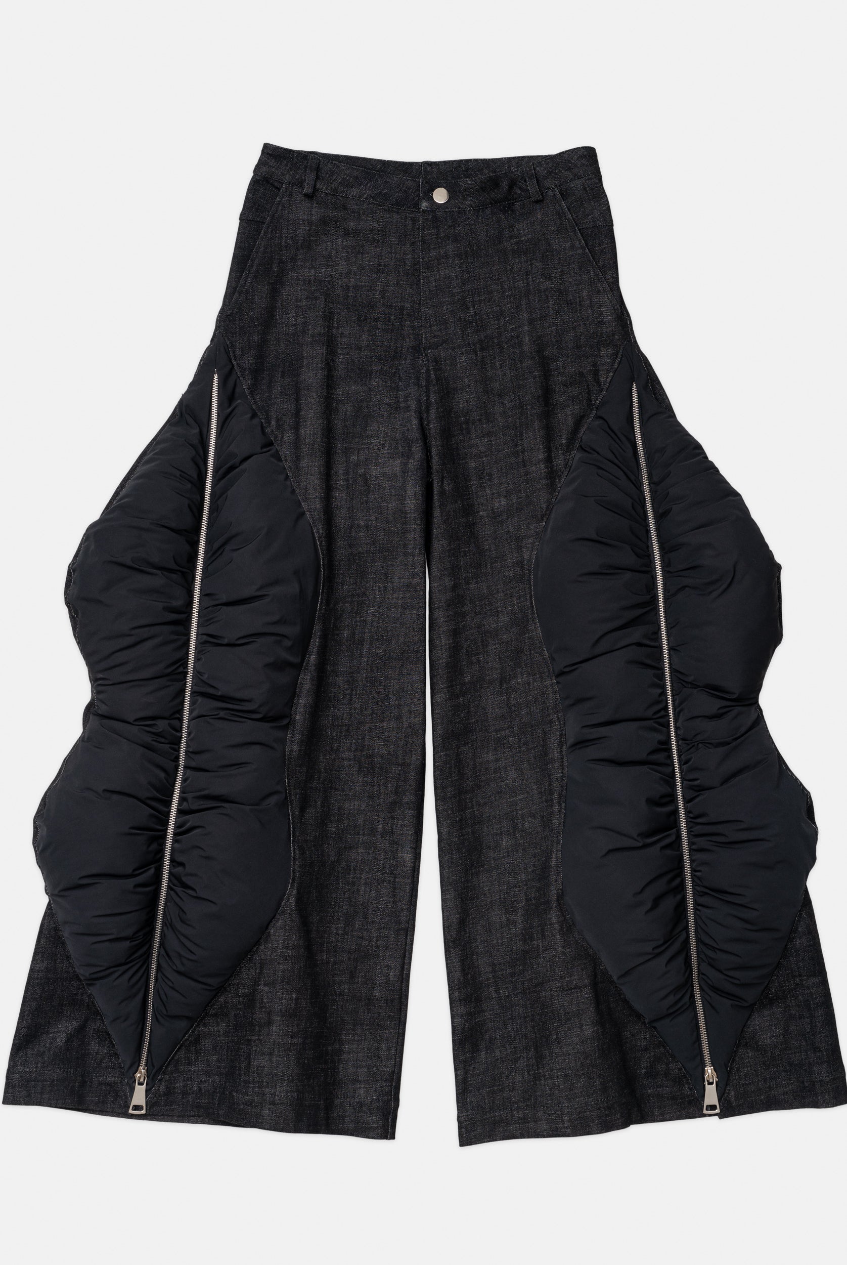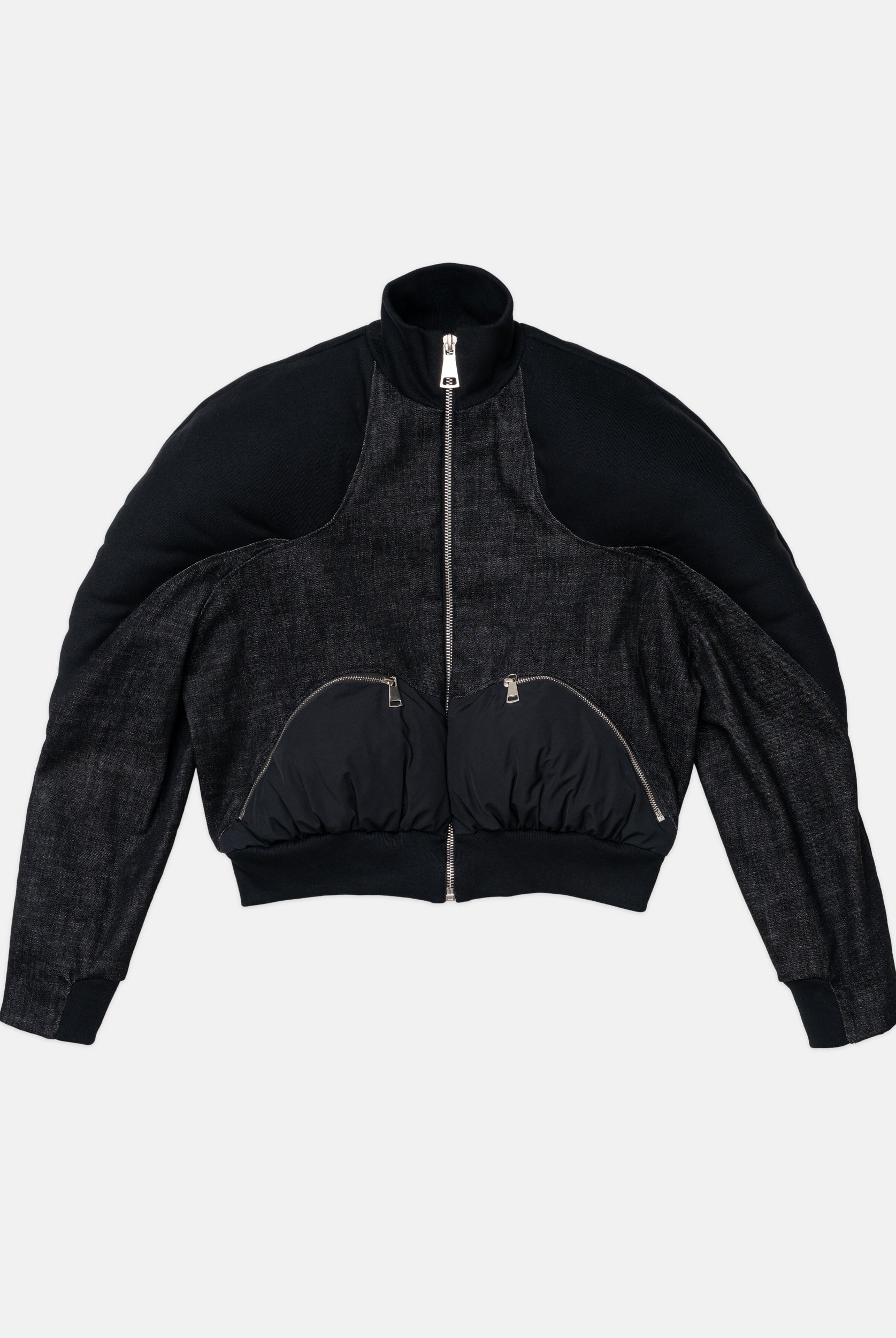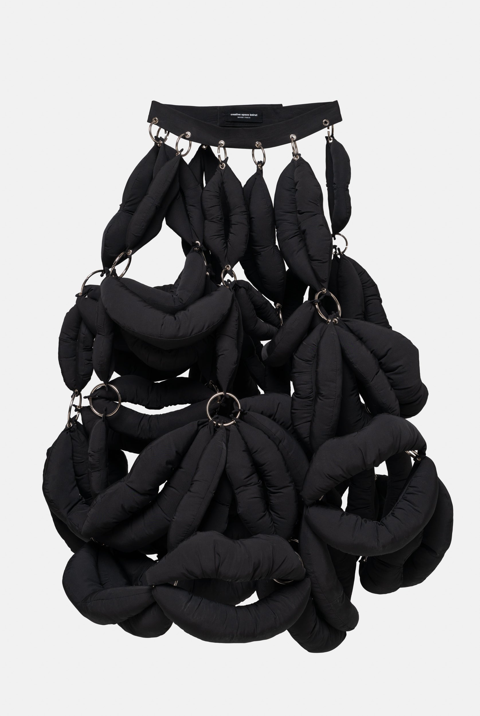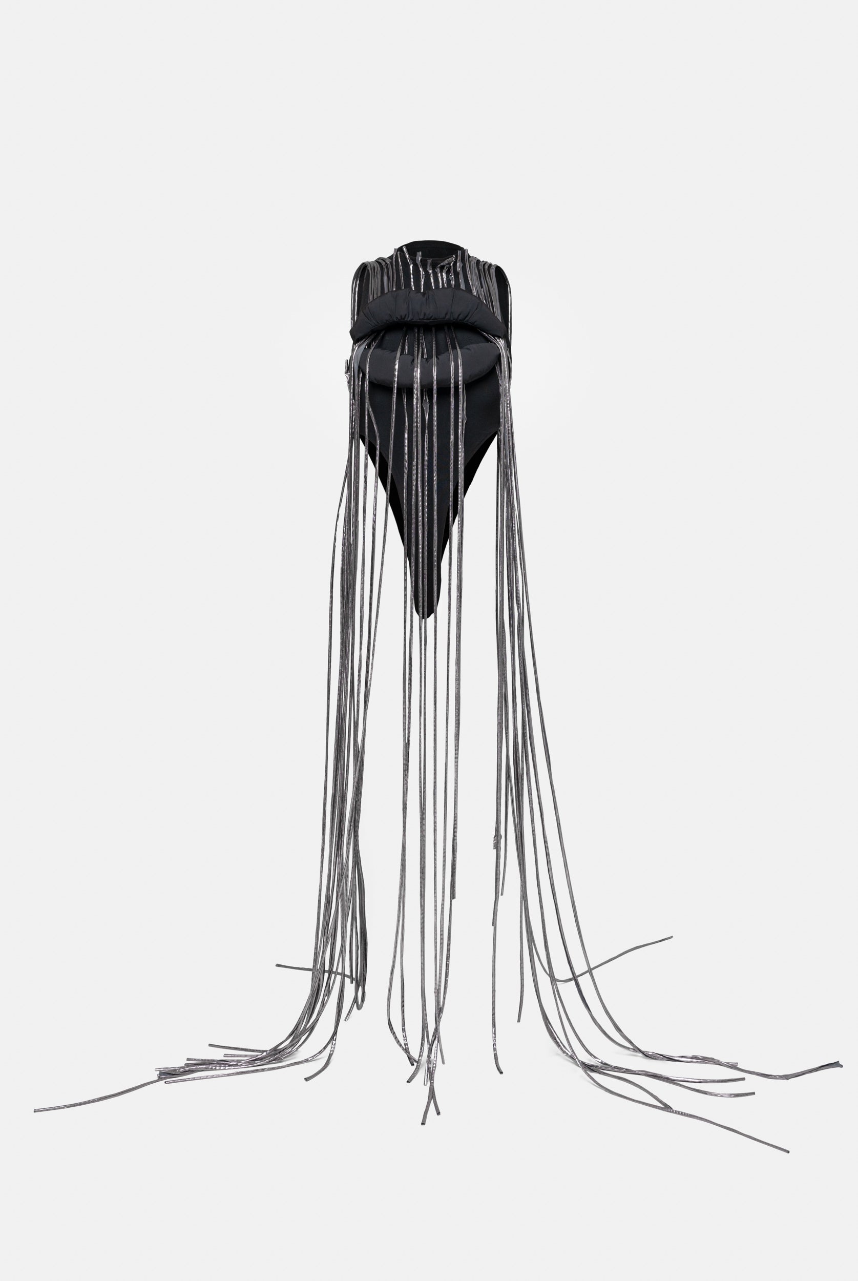 Inspired by Pedro Almodóvar's iconic movie "High Heels," this collection, titled ‘Whelve’ delves into the notion that attachments function as personal prisons, ensnaring individuals in a web of unresolved traumas and emotions. These attachments have the potential to hinder progress and impede one's journey forward in life. With a dominantly black color palette, techniques include garments puffed with stuffing and the use of jersey strips and metal hoops.