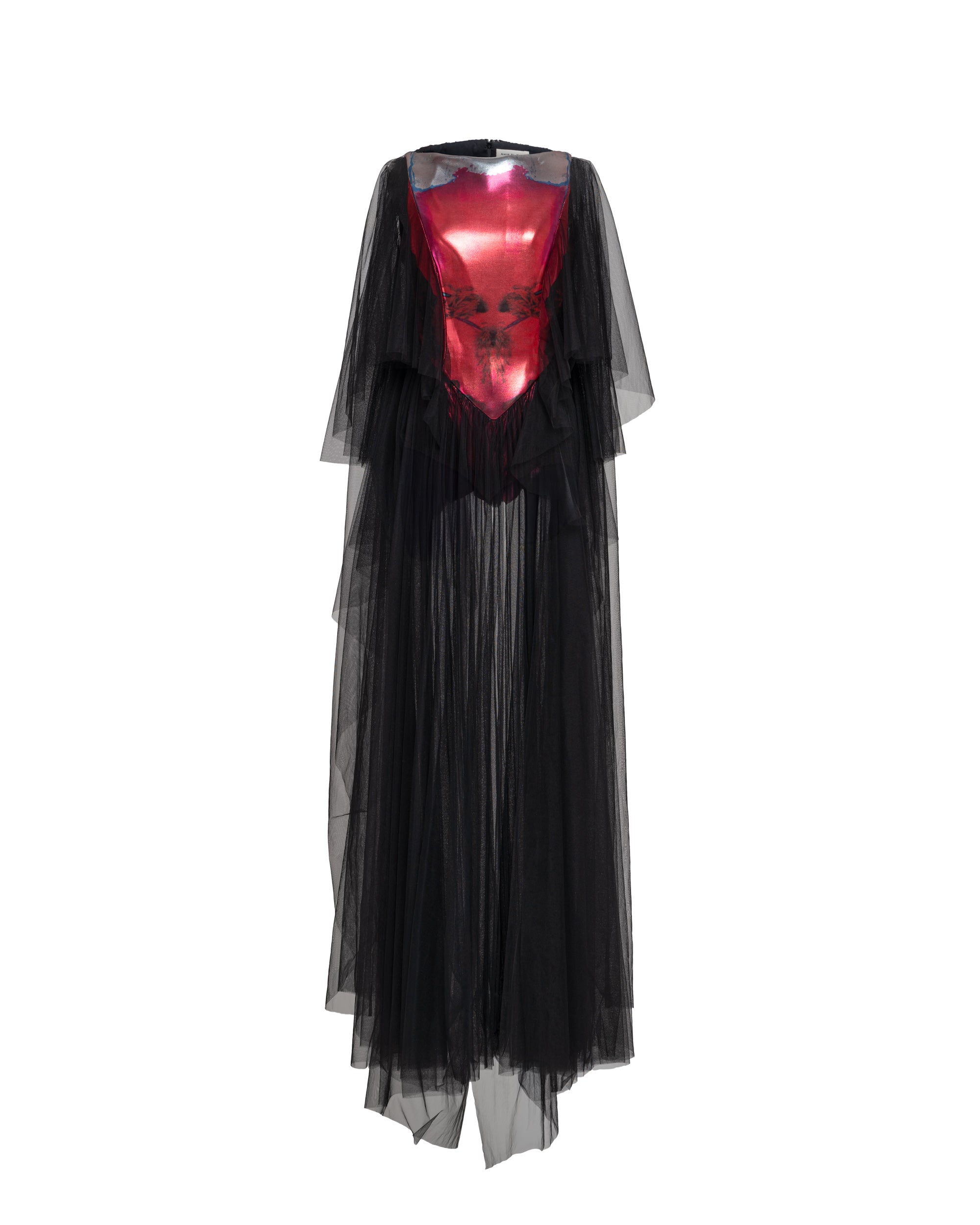 A bodysuit created with a trademark metallic digital print, paired with black tulle skirt and sleeves that drape over it, creating the illusion of a dress.